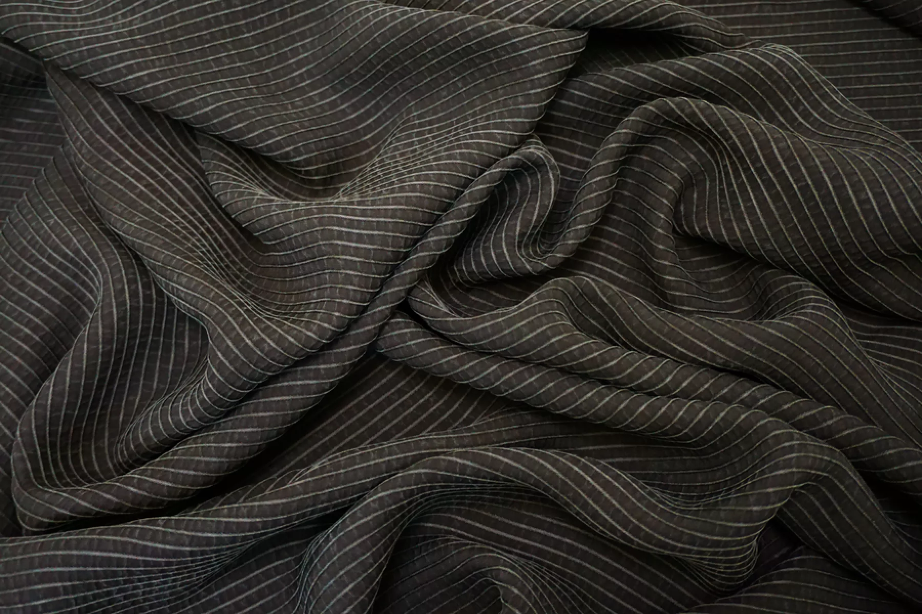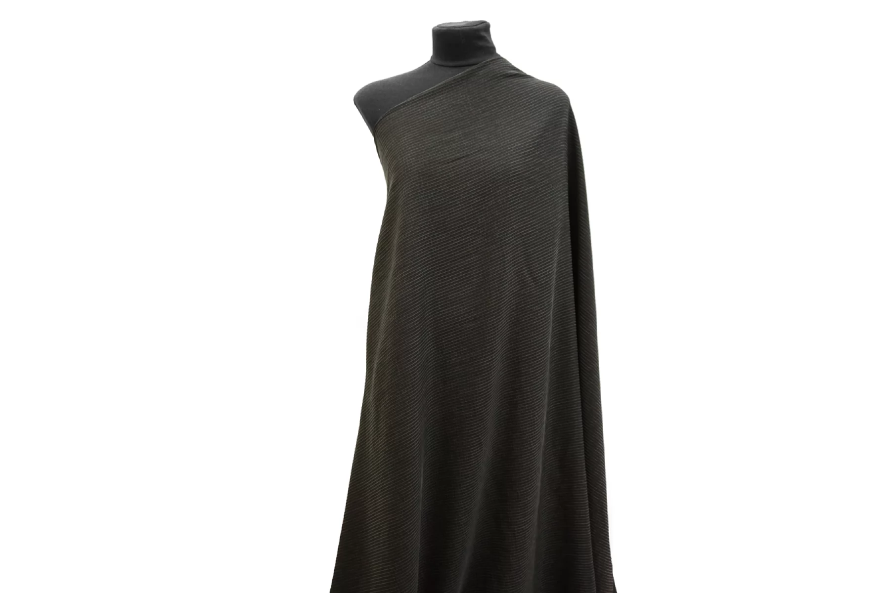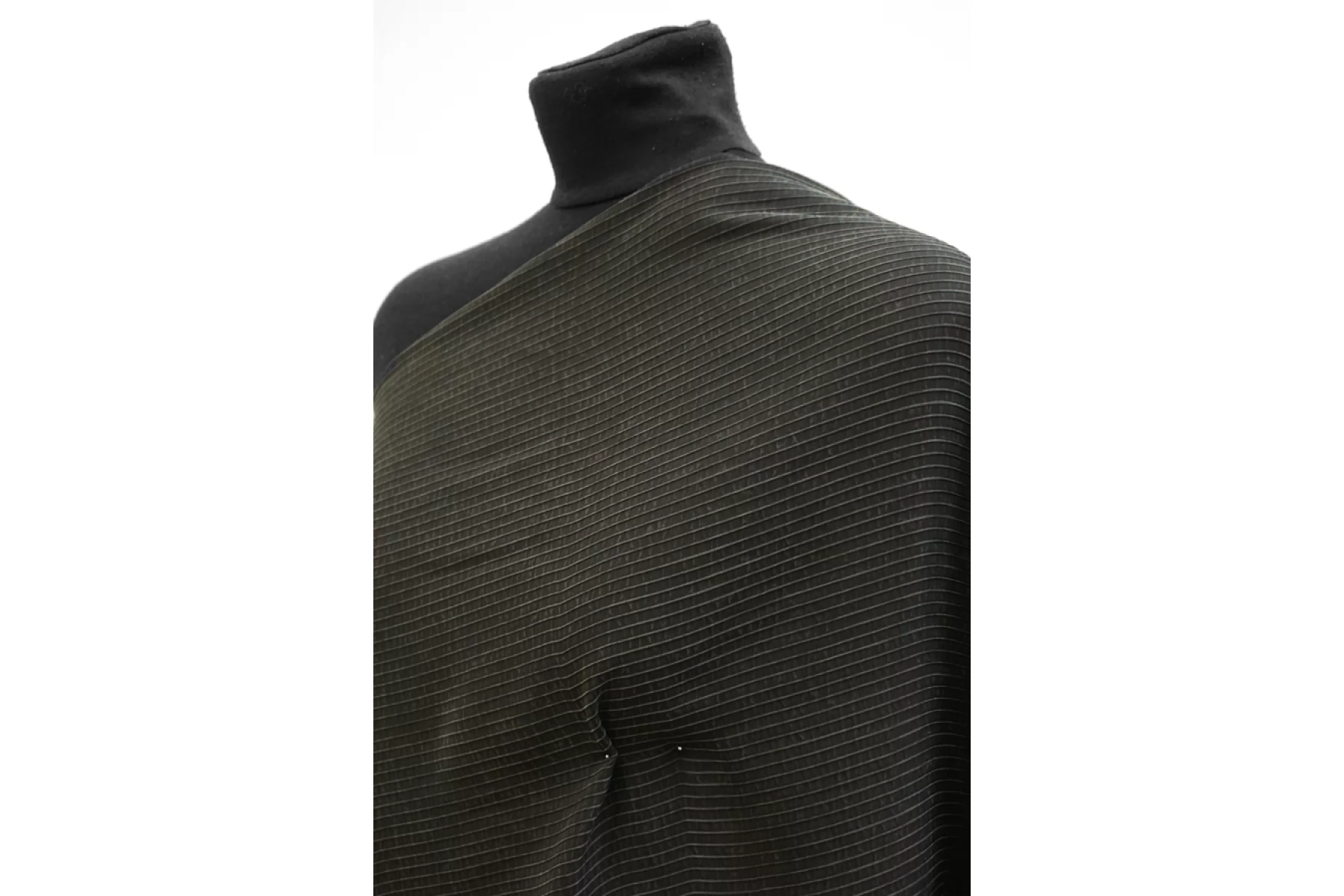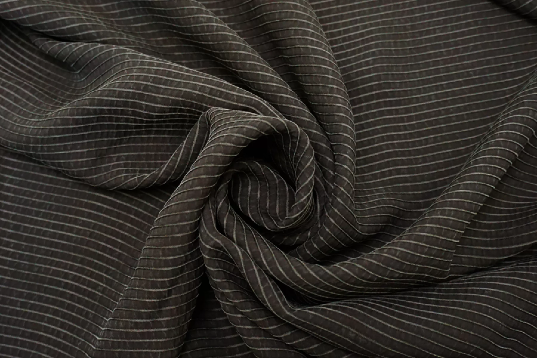 Плательная жаккардовая купра в тёмном коричневом цвете c зеленоватым подтоном, с выработкой в виде полосок с лоском. Довольно тонкая, чуть холодящая. Немного тянется благодаря плетению. Немного просвечивает силуэт в один слой. Форму практически не держит, но красиво смотрится в складке. Шьем платья, блузки, рубашки, юбки. Обязательно учитываем усадку порядка 5-10%.