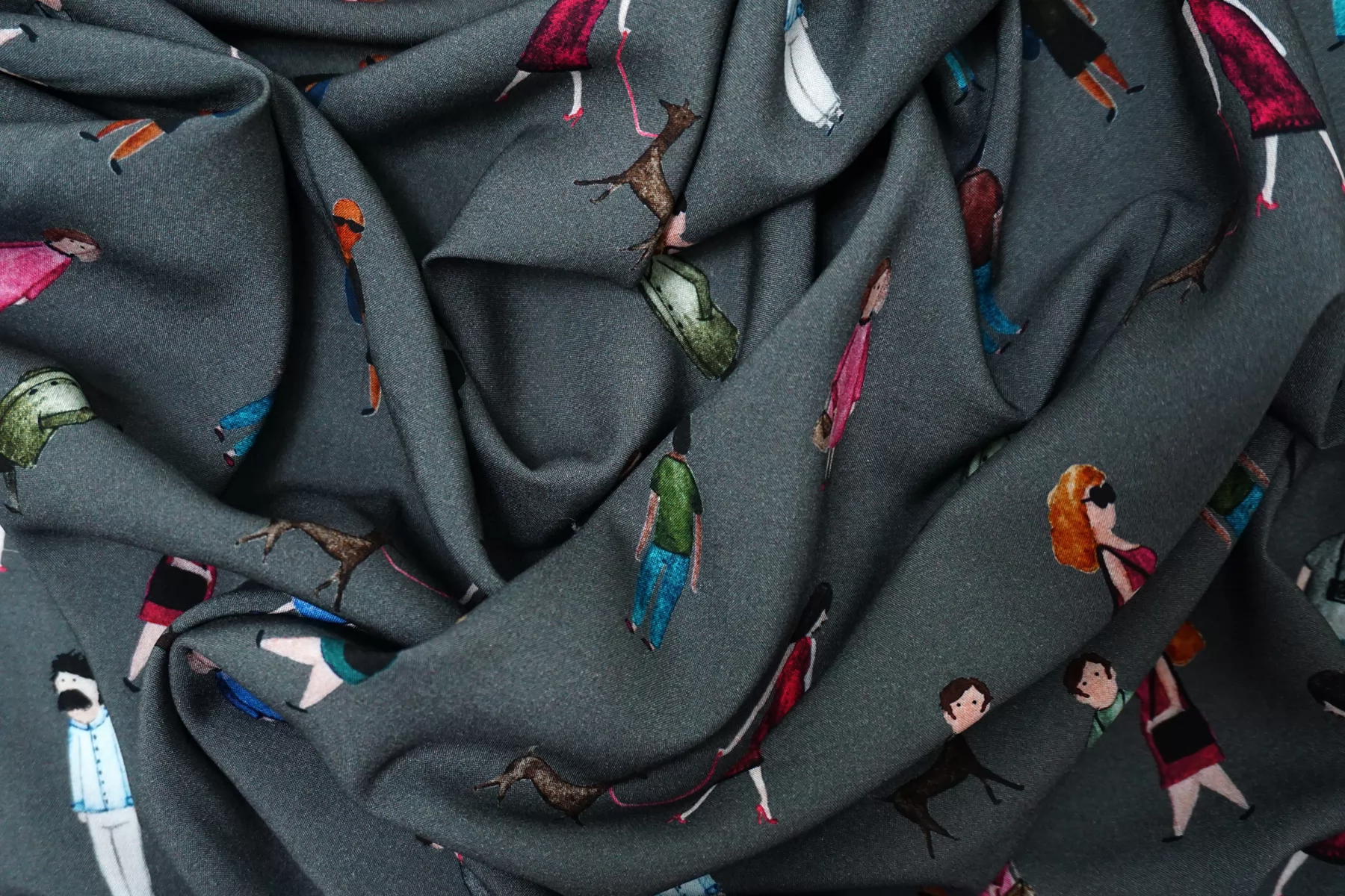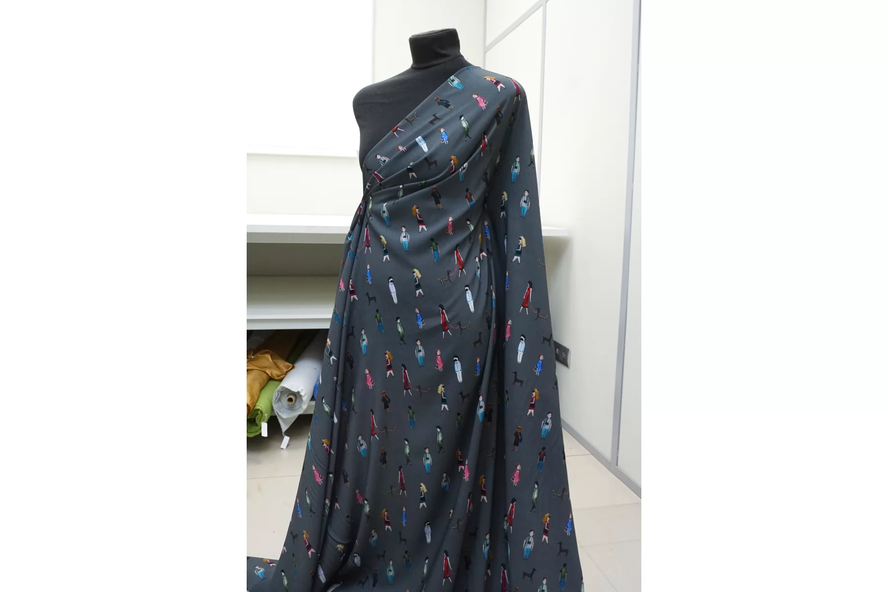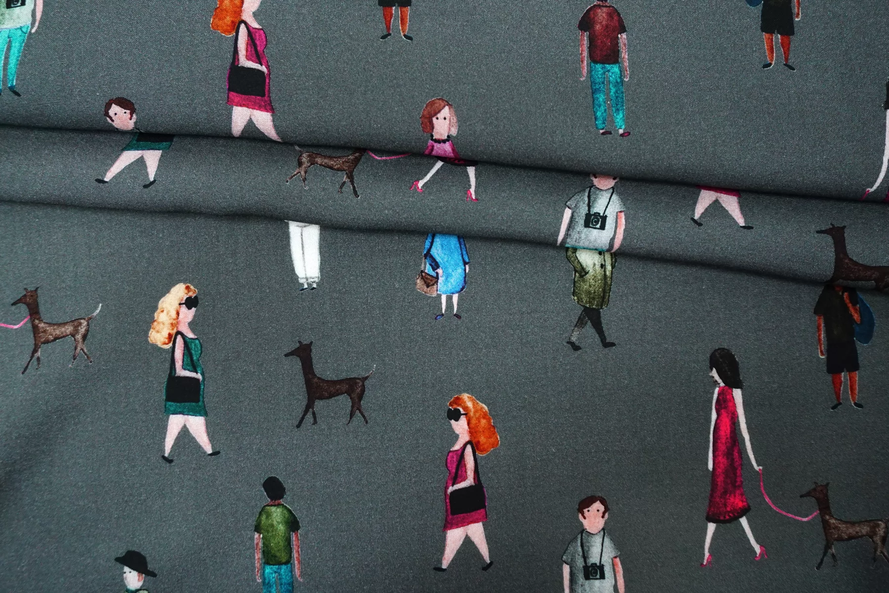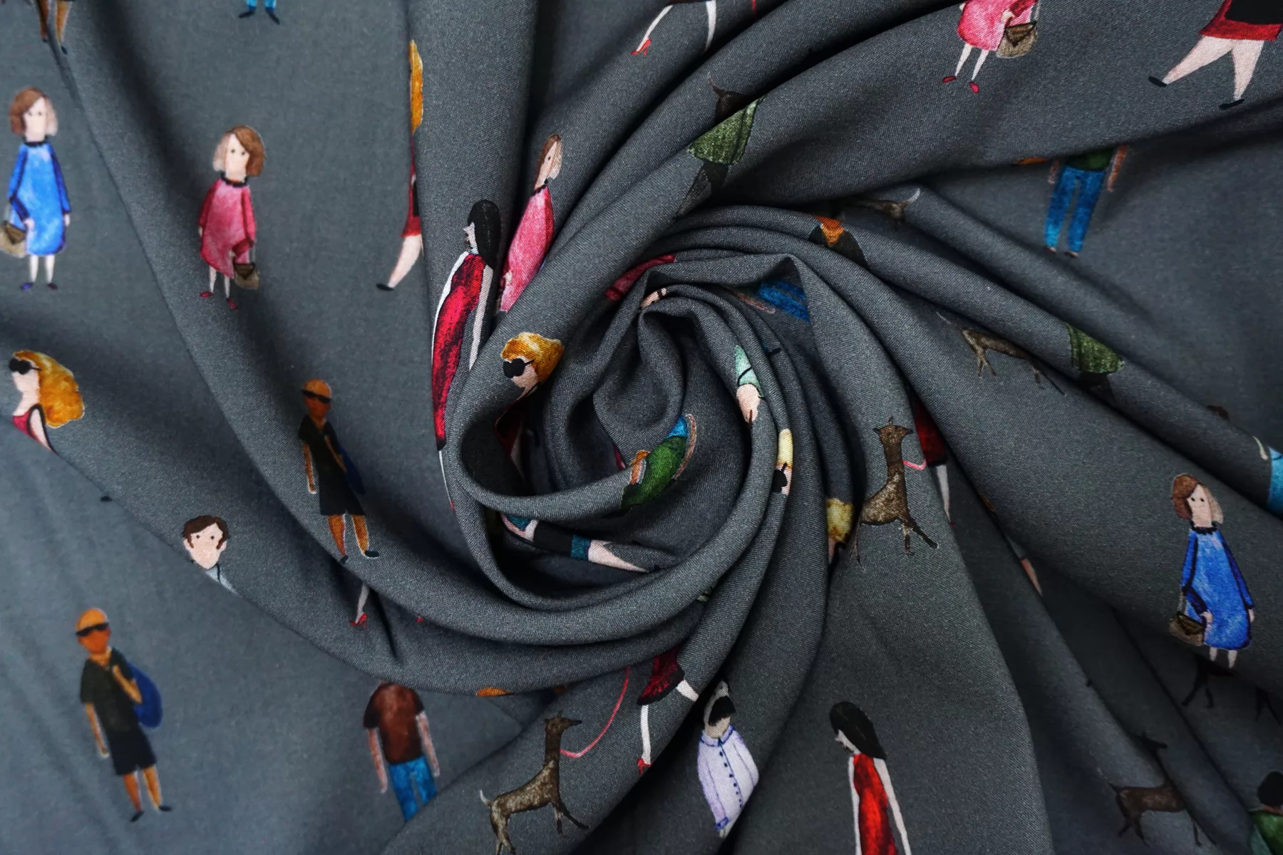 ВНИМАНИЕ!! Встречаtтся дефект принта в виде маленьких точек см. фото. Итальянская плательно-блузочная вискоза серого цвета с принтом в виде людей с собачками. Тонкая, пластичная, не тянется. Минимально просвечивает силуэт в один слой. Подойдет для пошива платья, юбки, туники, блузки, рубашки. При работе с этой тканью советуем использовать тонкие иглы и нитки.