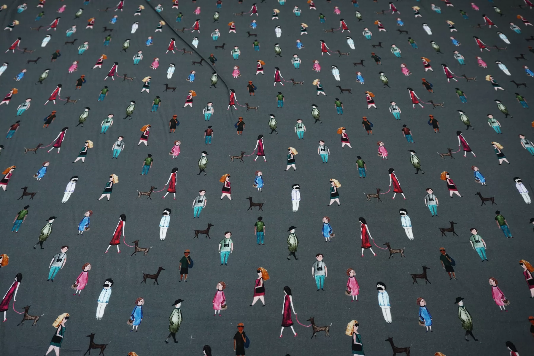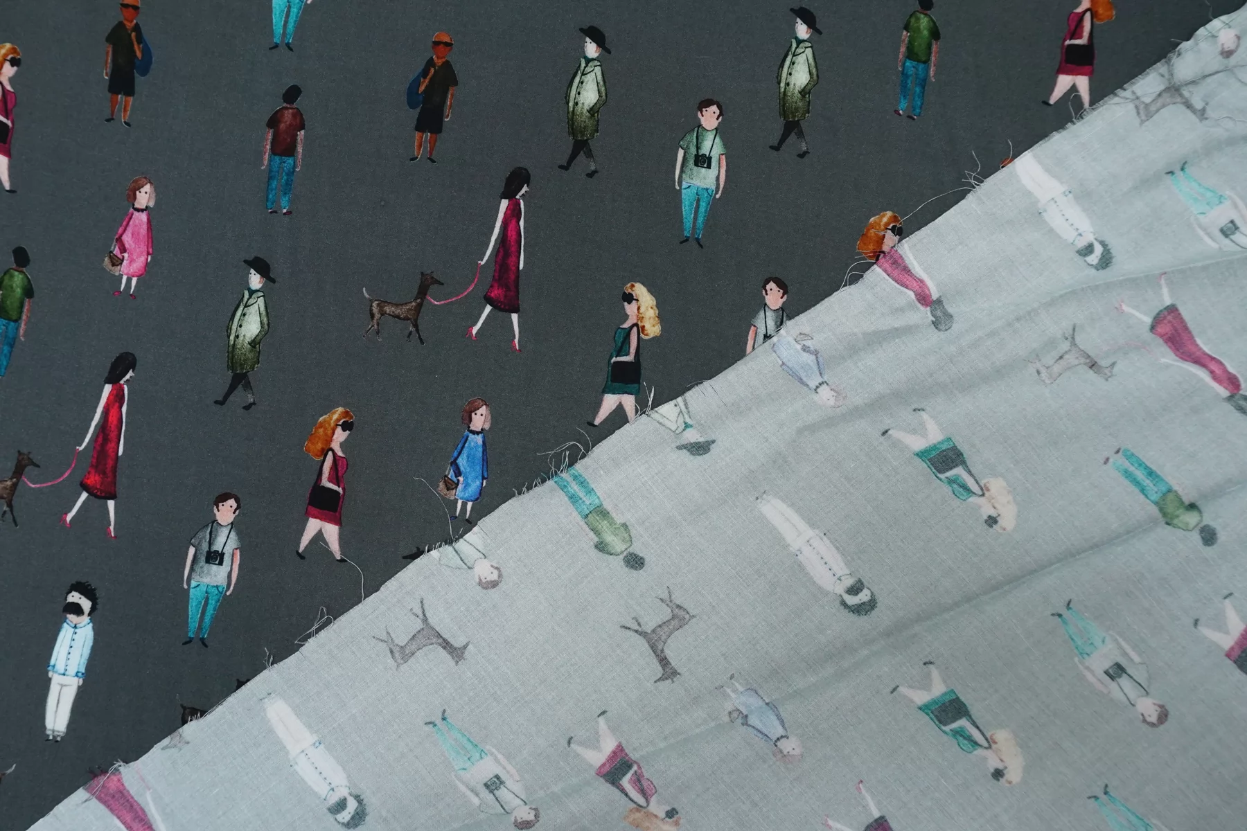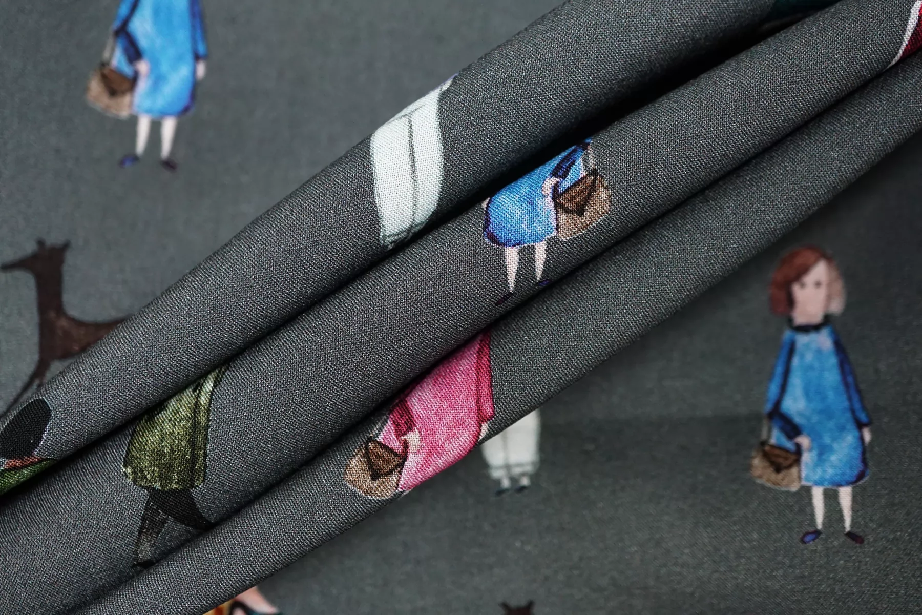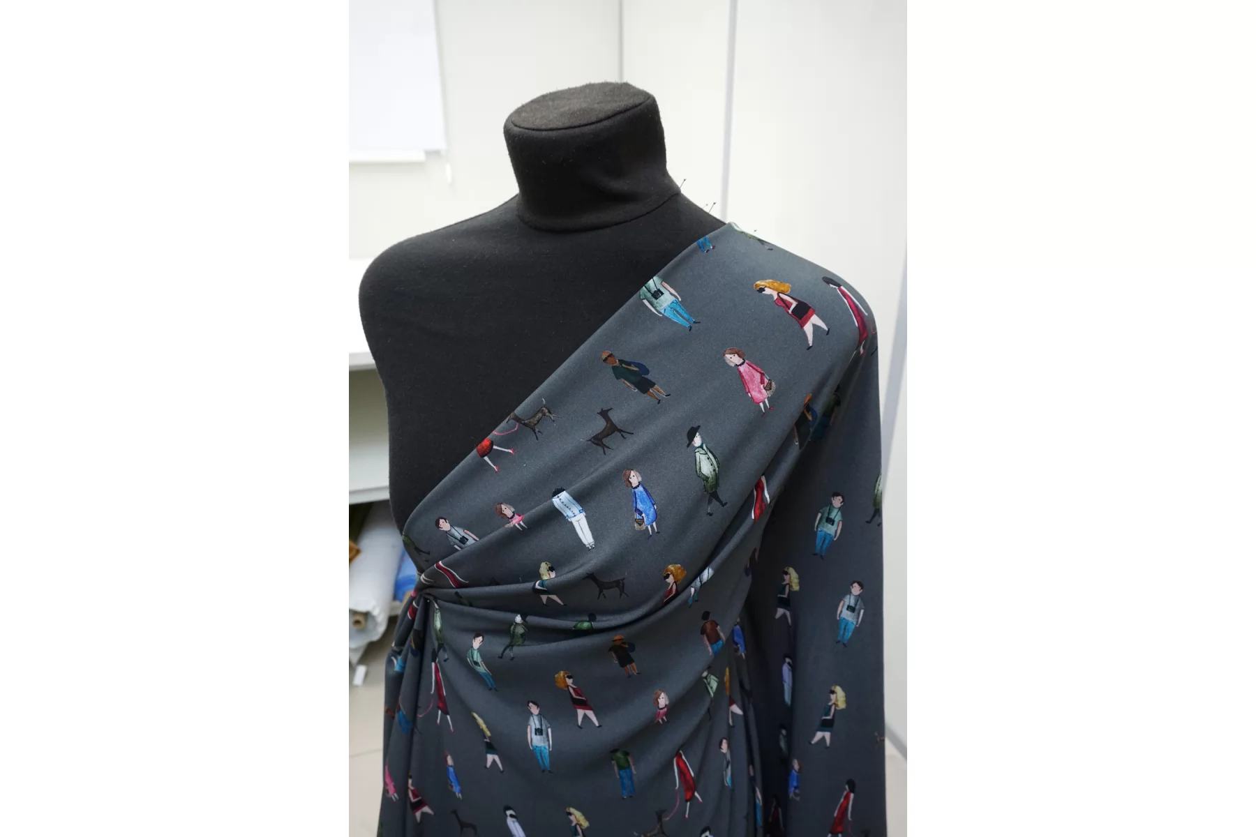 ВНИМАНИЕ!! Встречаtтся дефект принта в виде маленьких точек см. фото. Итальянская плательно-блузочная вискоза серого цвета с принтом в виде людей с собачками. Тонкая, пластичная, не тянется. Минимально просвечивает силуэт в один слой. Подойдет для пошива платья, юбки, туники, блузки, рубашки. При работе с этой тканью советуем использовать тонкие иглы и нитки.