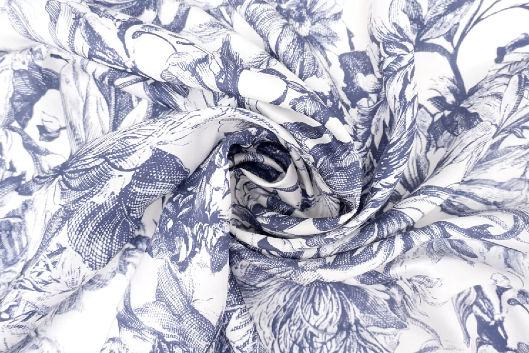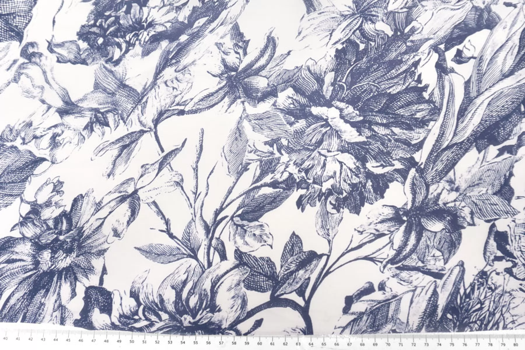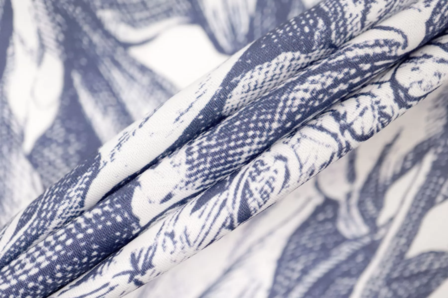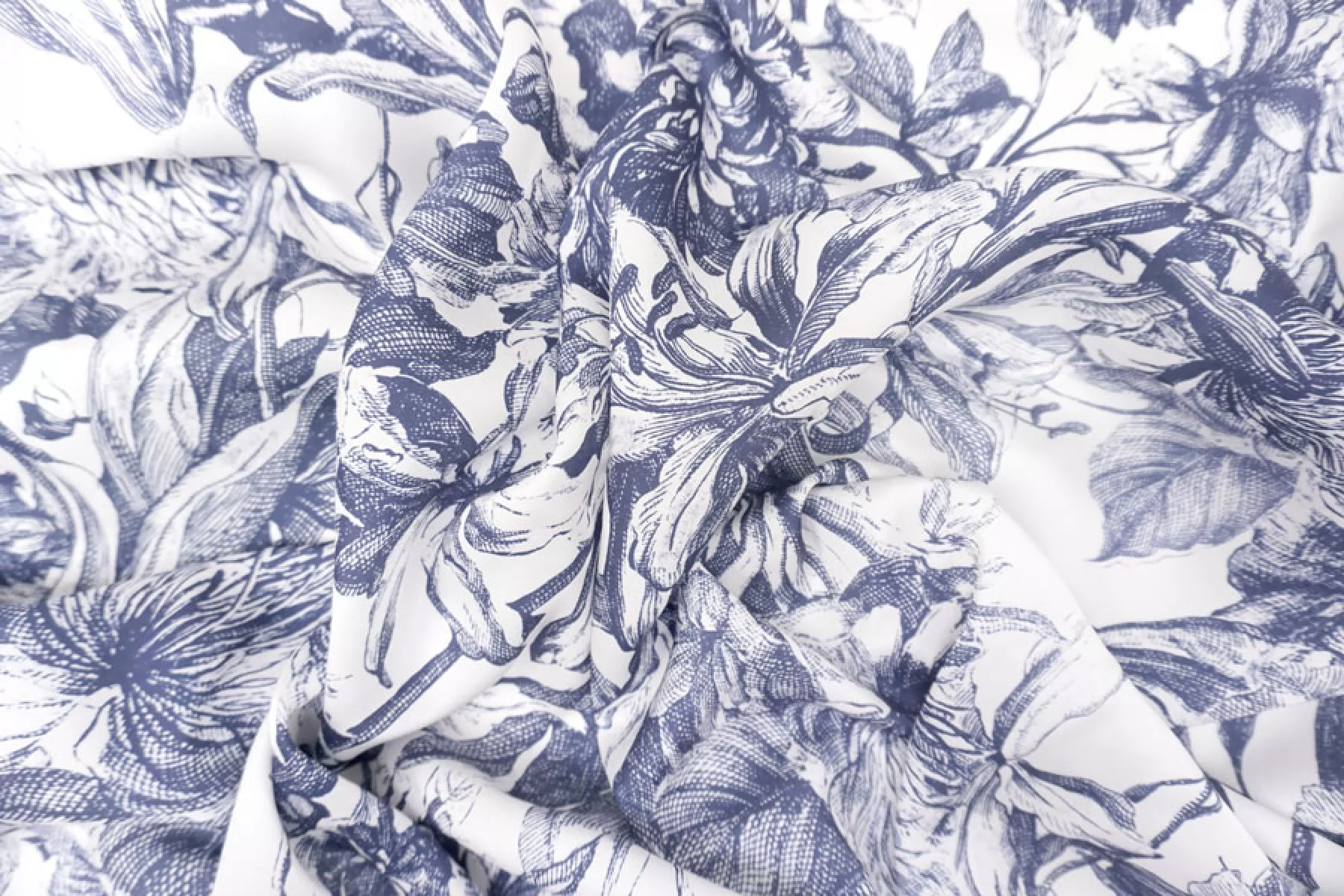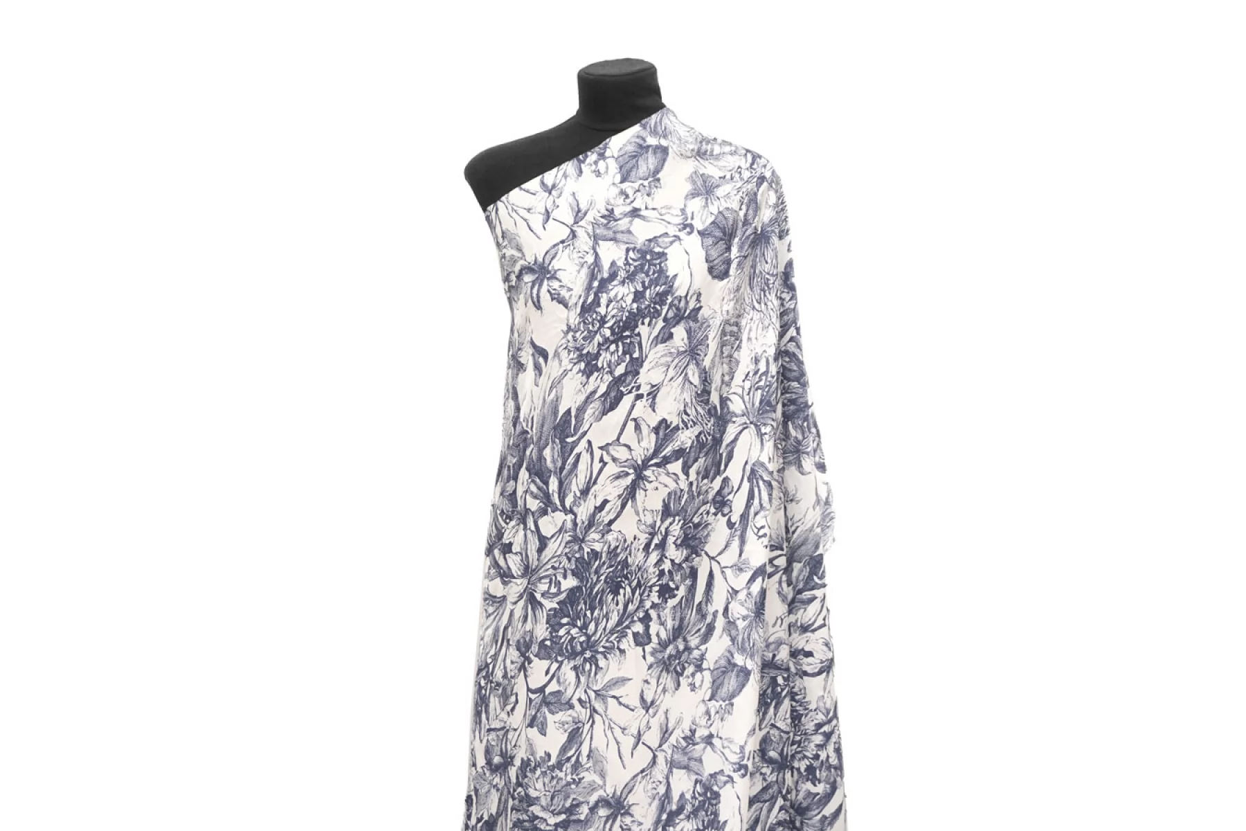 Прекрасная плательно-блузочная вискоза белого цвета с крупным приглушенно-синим цветочным принтом. Тактильно гладкая, скользящая, мягкая, приятная и холодящая к телу. Сминается. Не тянется. Просвечивает силуэт на просвет. Красиво струится и смотрится в складке и пластике, по пластике немного напоминает органзу. Отлично подойдет на платья, юбки, блузки и одежду в бельевом стиле. При необходимости используйте подкладочный материал. Обязательно учитывайте усадку 5-10%.