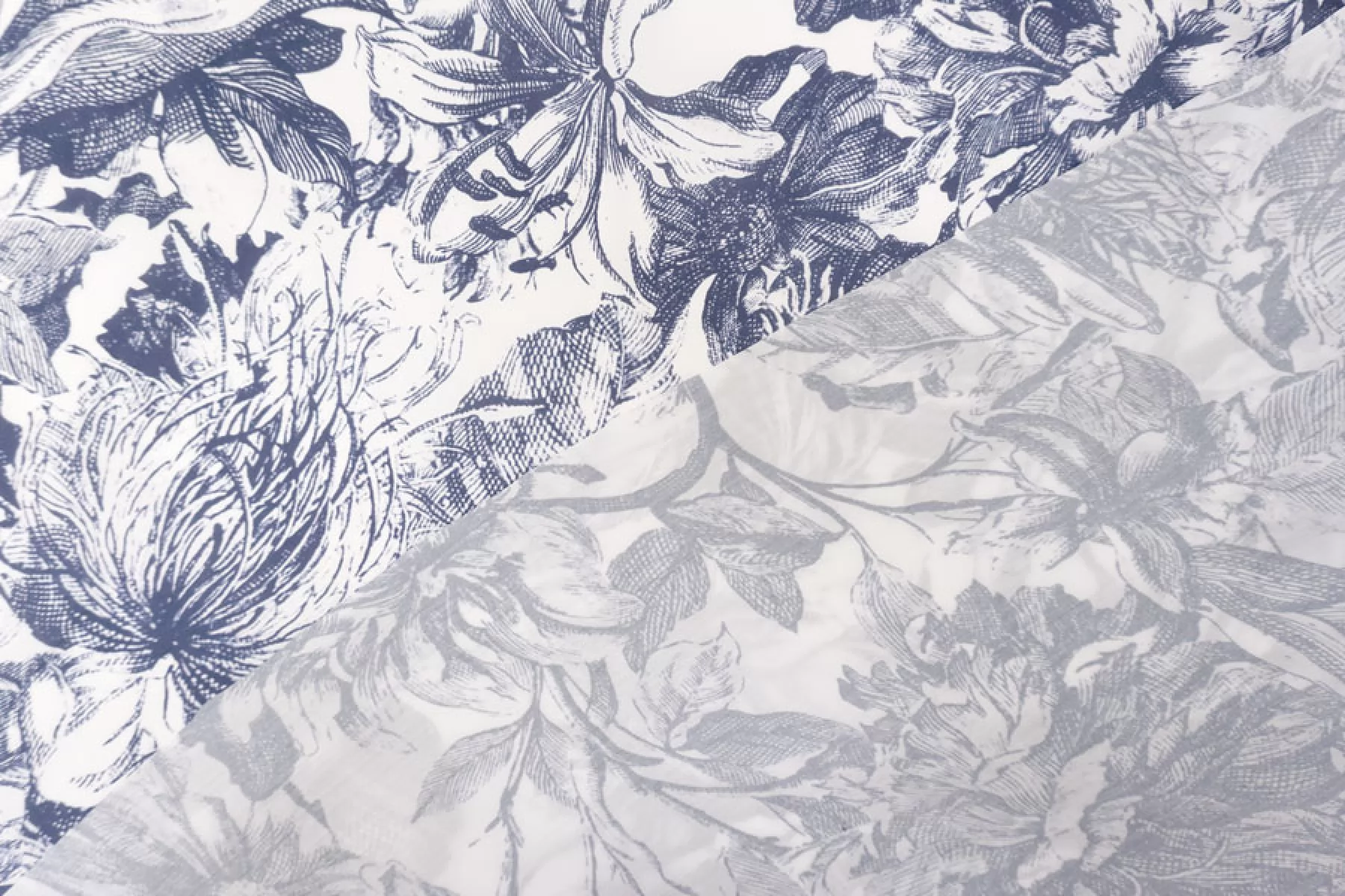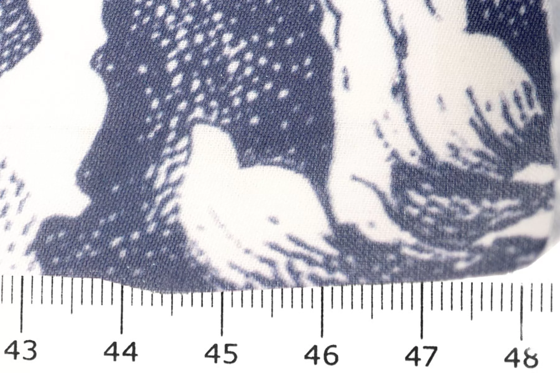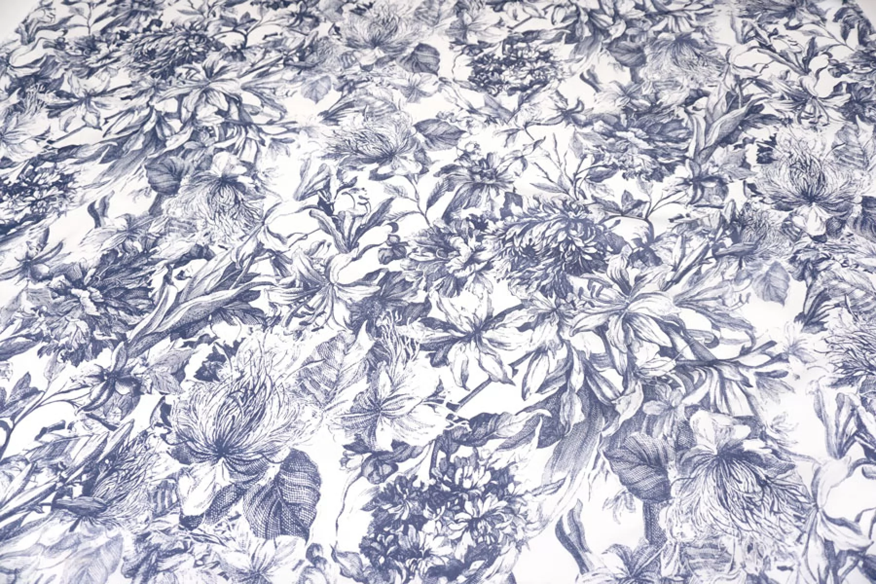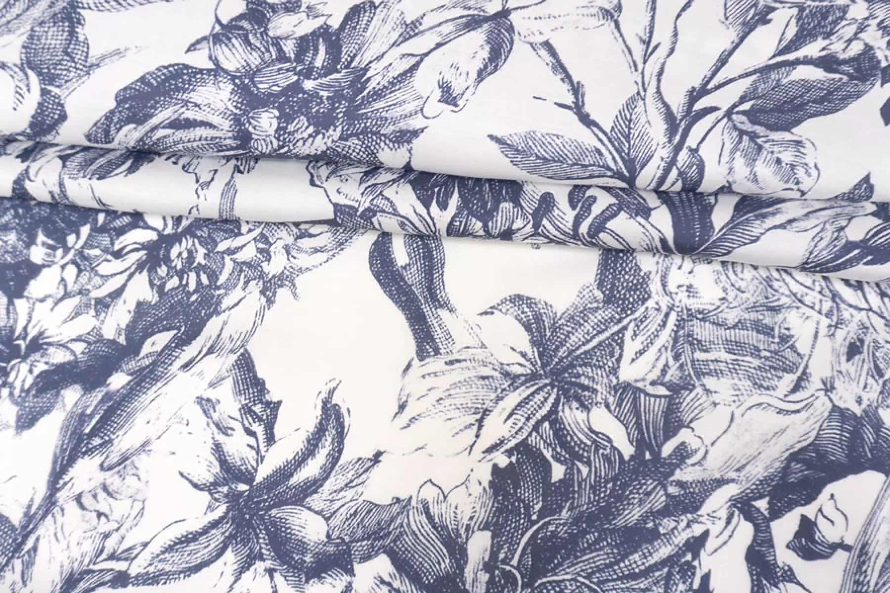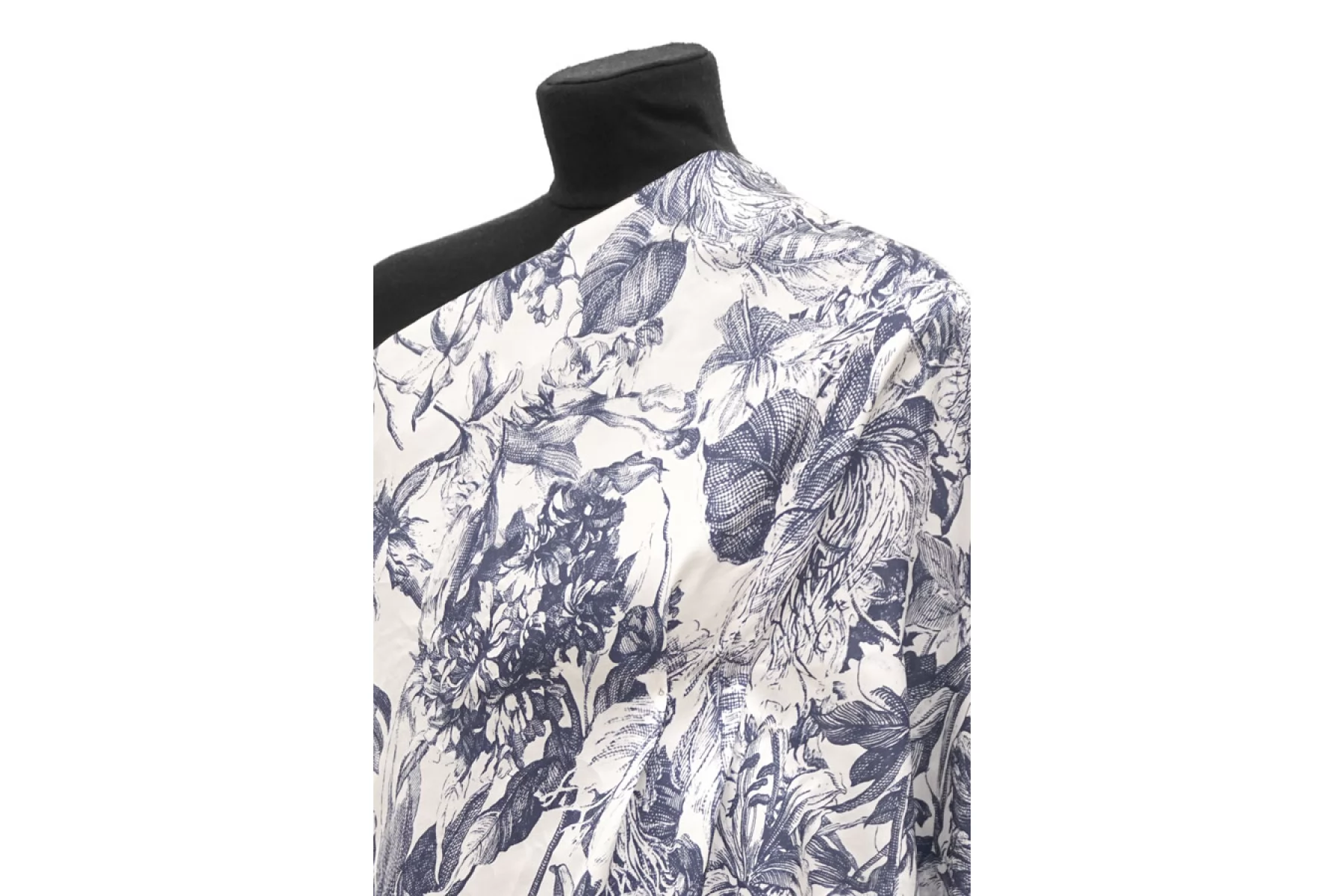 Прекрасная плательно-блузочная вискоза белого цвета с крупным приглушенно-синим цветочным принтом. Тактильно гладкая, скользящая, мягкая, приятная и холодящая к телу. Сминается. Не тянется. Просвечивает силуэт на просвет. Красиво струится и смотрится в складке и пластике, по пластике немного напоминает органзу. Отлично подойдет на платья, юбки, блузки и одежду в бельевом стиле. При необходимости используйте подкладочный материал. Обязательно учитывайте усадку 5-10%.
