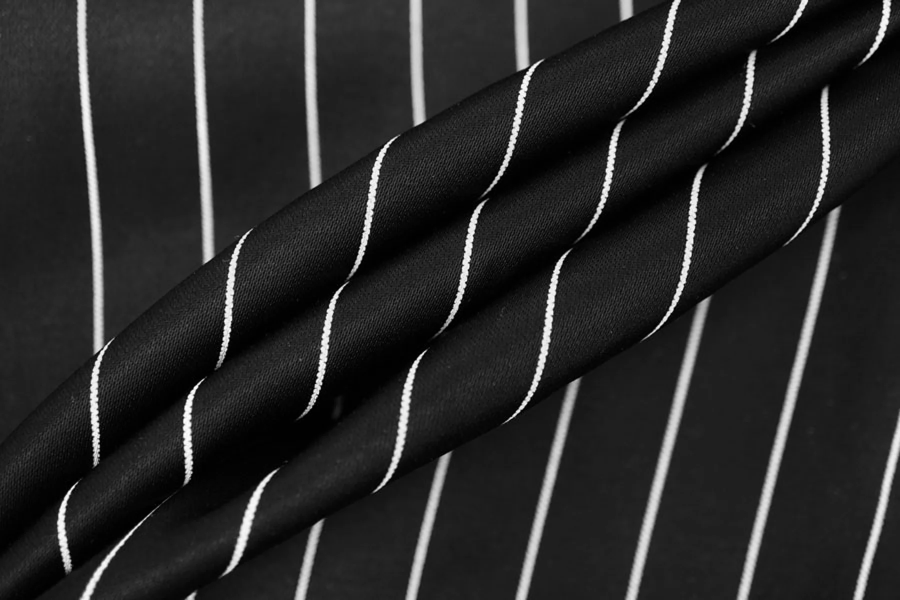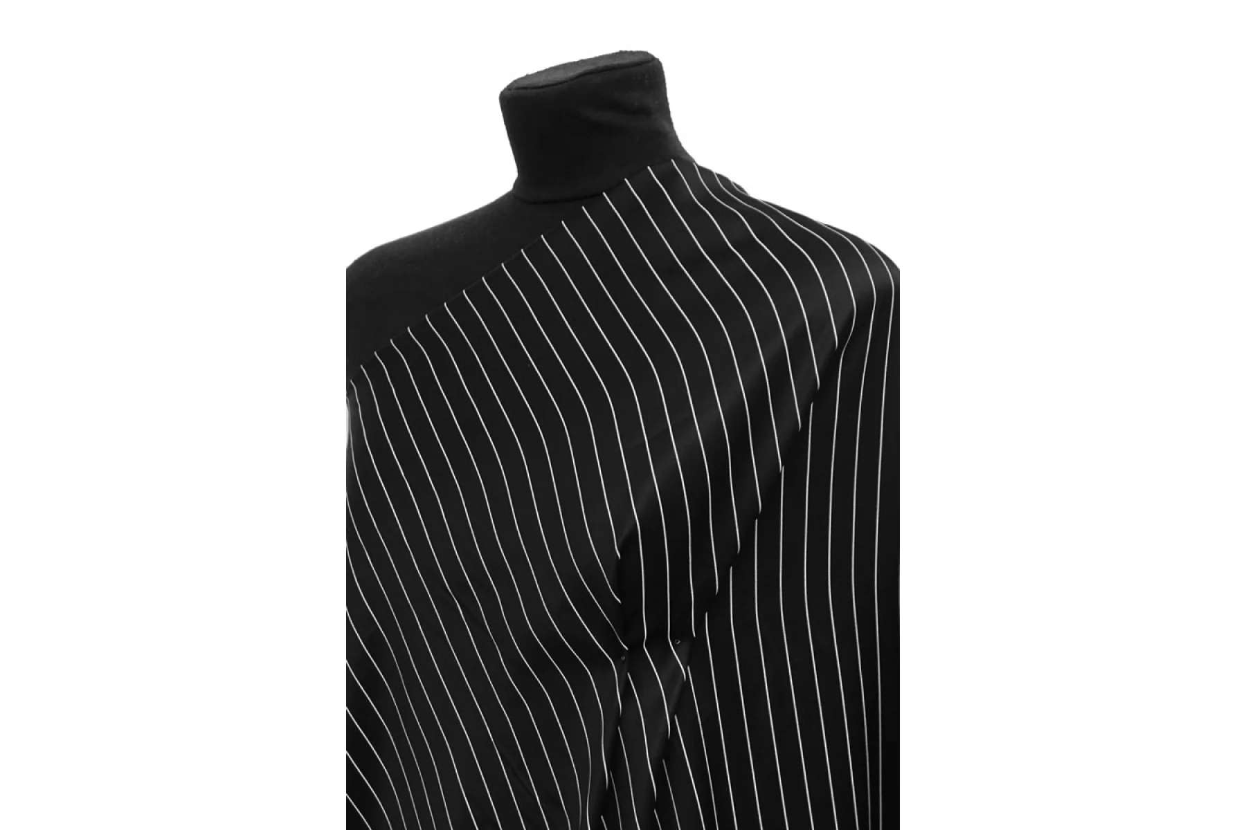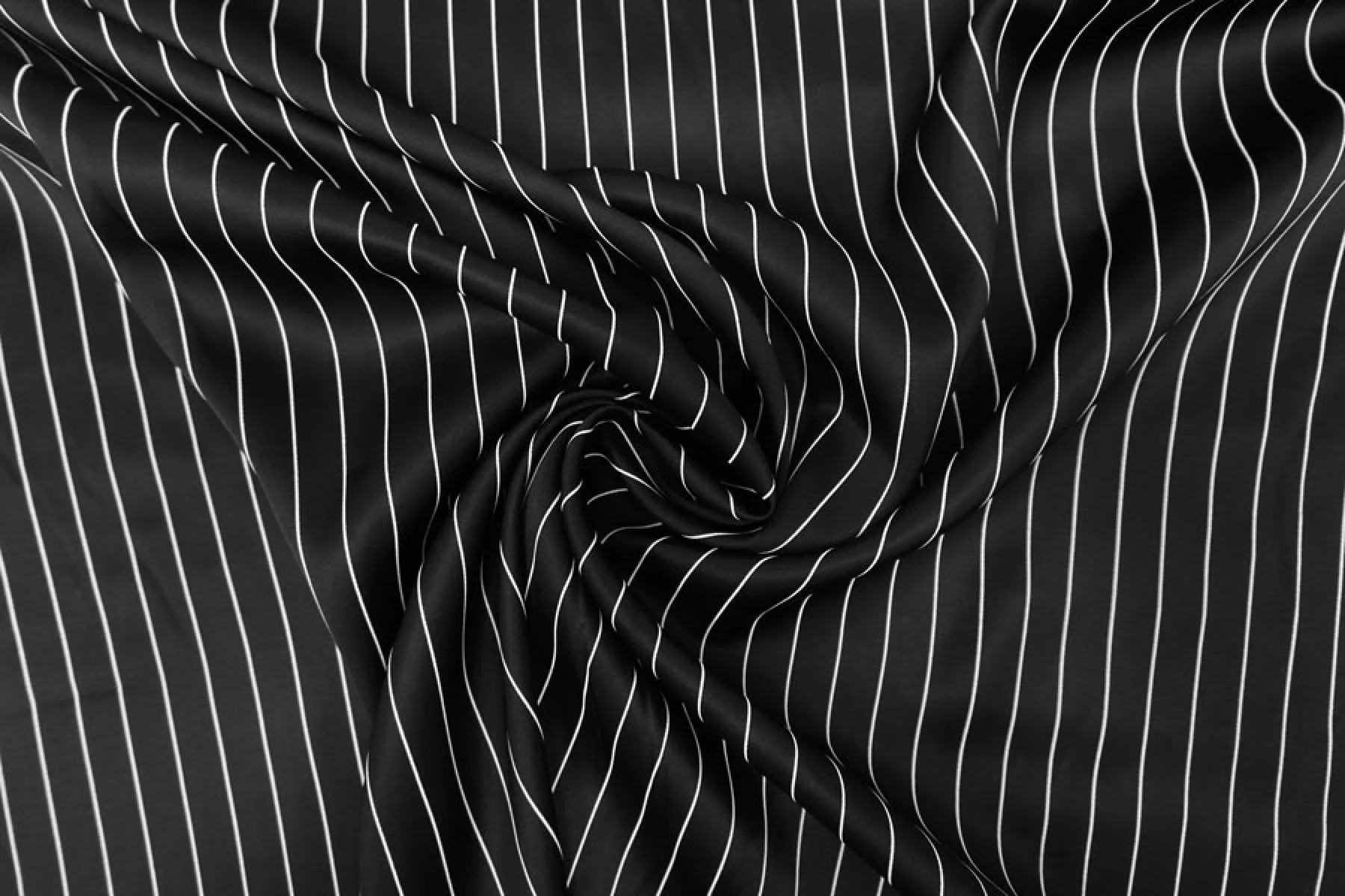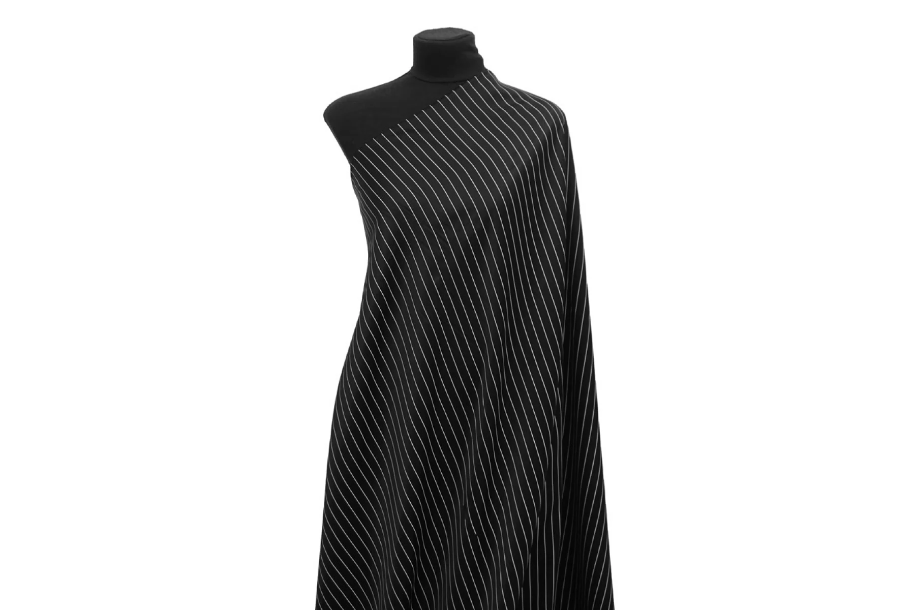 Плательно-костюмная вискоза черная в белую полоску. Тактильно приятная, мягкая, гладкая, с красивым лоском. Виднеется силуэт на просвет. Не тянется, мнется. С легким красивым лоском. Красиво смотрится в складках. Форму немного держит. Мнется. Достаточно плотненькая и подойдет, как на костюмы так и на платья. При необходимости используйте подкладочный материал. Обязательно учитывайте усадку 5-10% .Изделия из данного материала советуем шить тонкими иглами