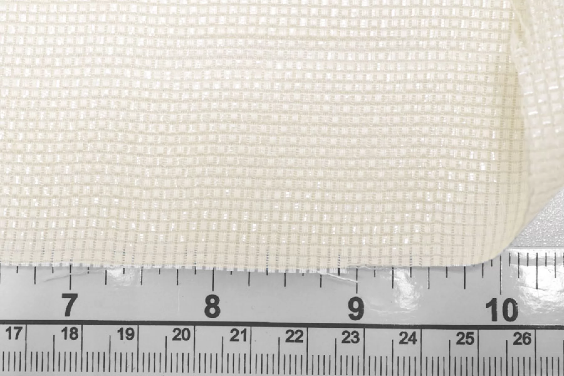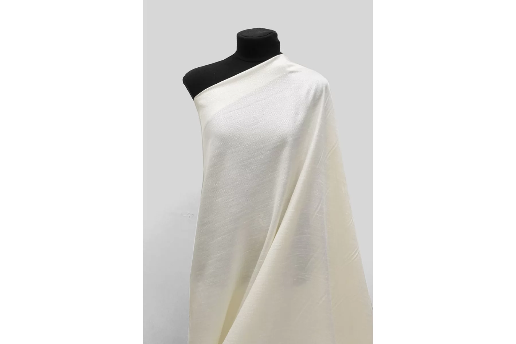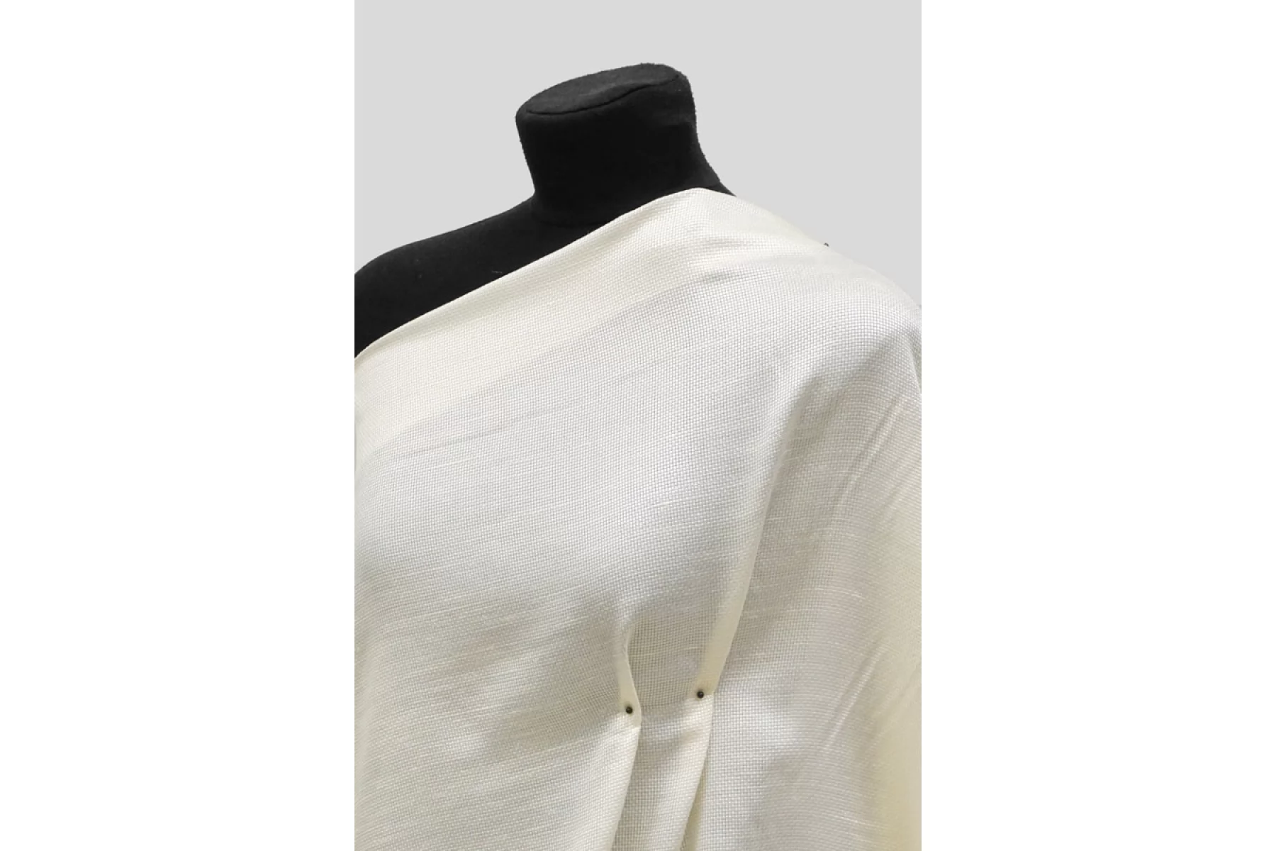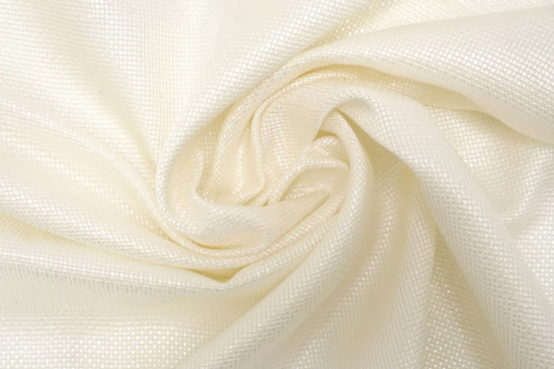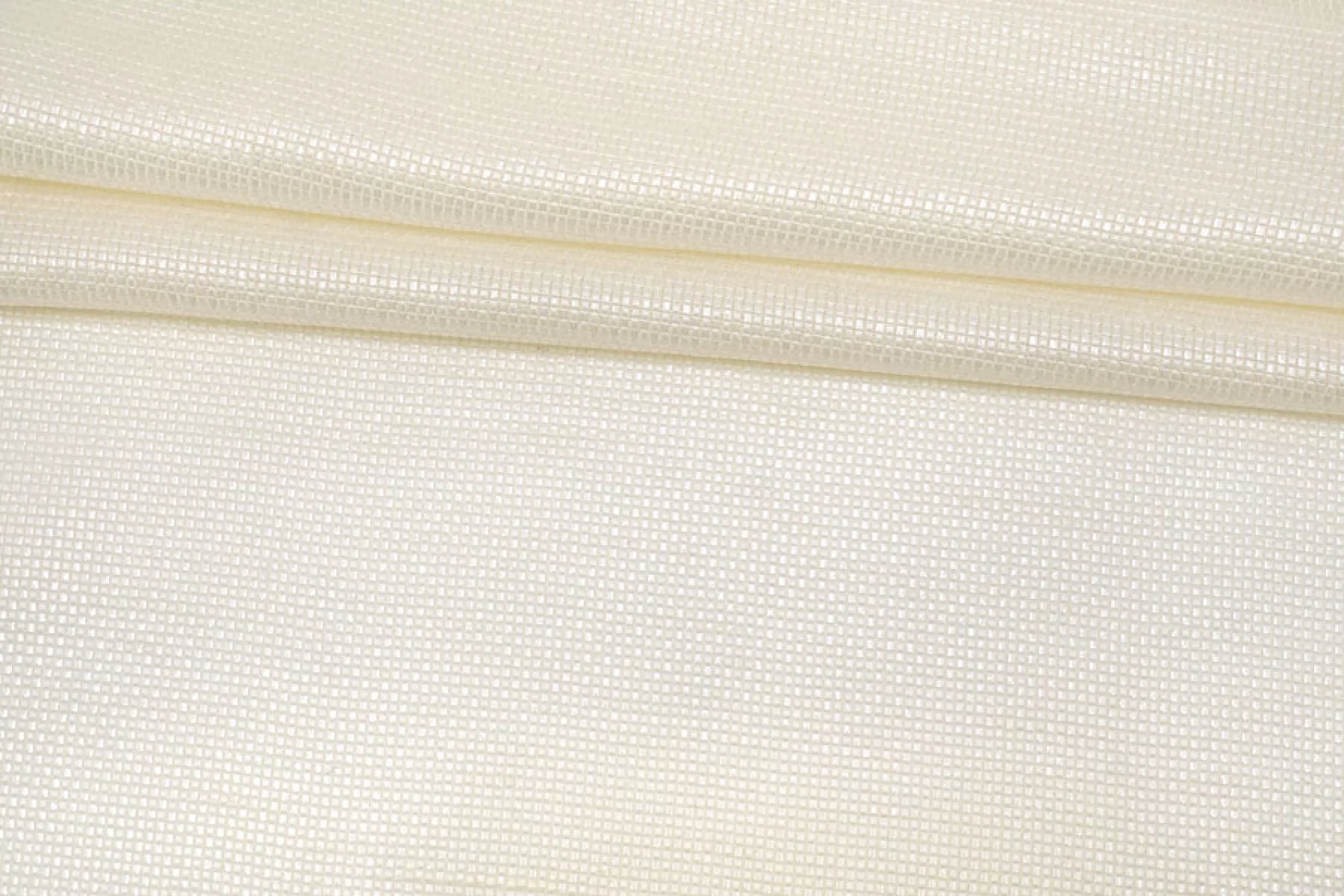Необычный хлопок со льном с добавлением прозрачного люрекса в молочно-белом оттенке. Плетение квадратиками, люрекс вплетен в шахматном порядке, что создает красивый перелив. Плетение немного разряженное, так что просвечивает. Тактильно люрекс ощущается. Ткань пластичная, не тянется, форму держит средне. Слегка мнётся. Подойдет для пошива нарядных платьев, юбок, костюмов мягкой формы. Может понадобиться подкладка.