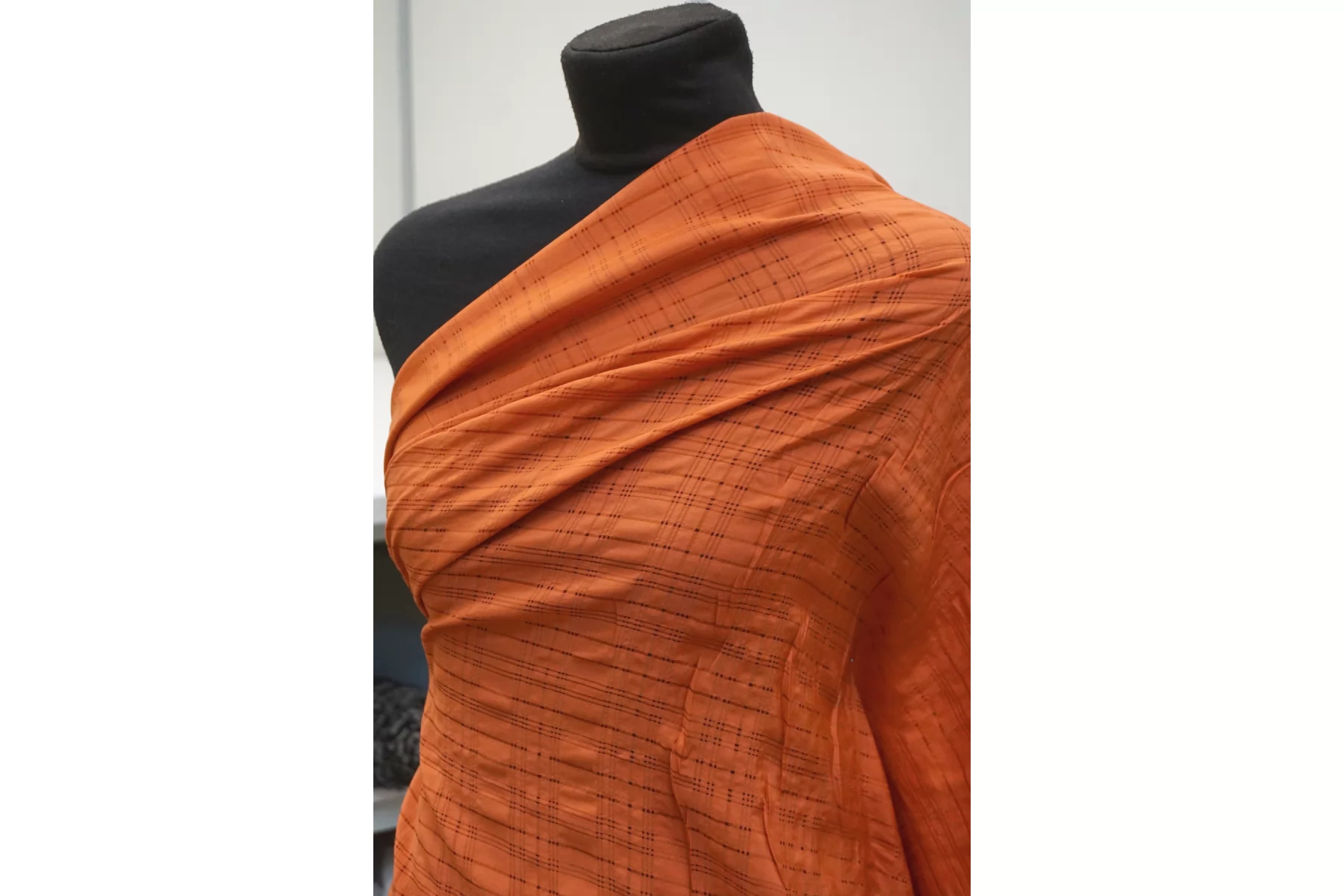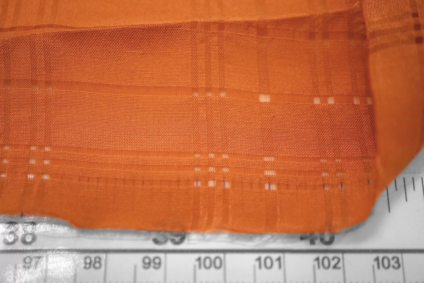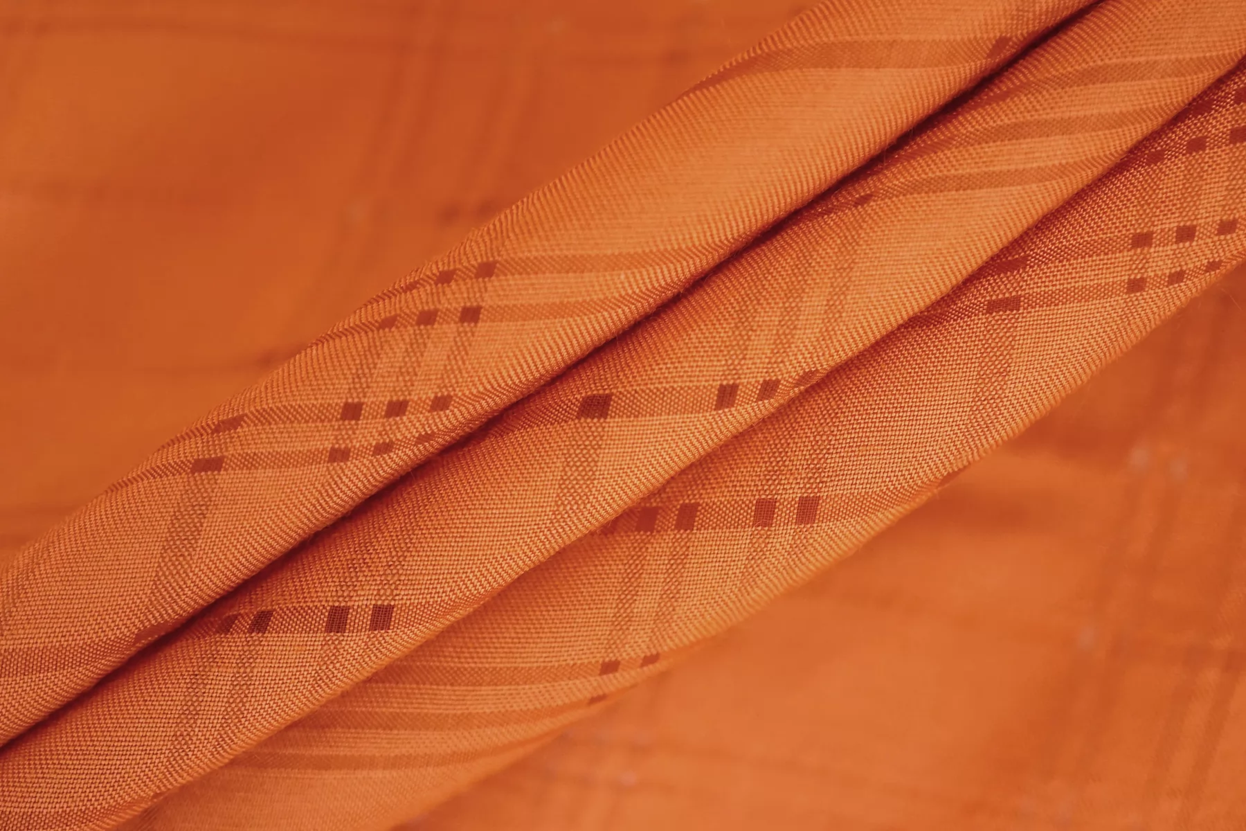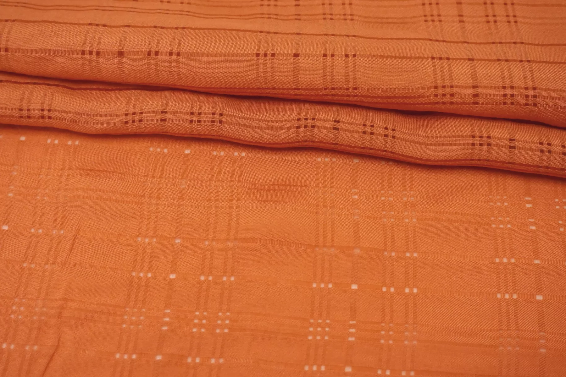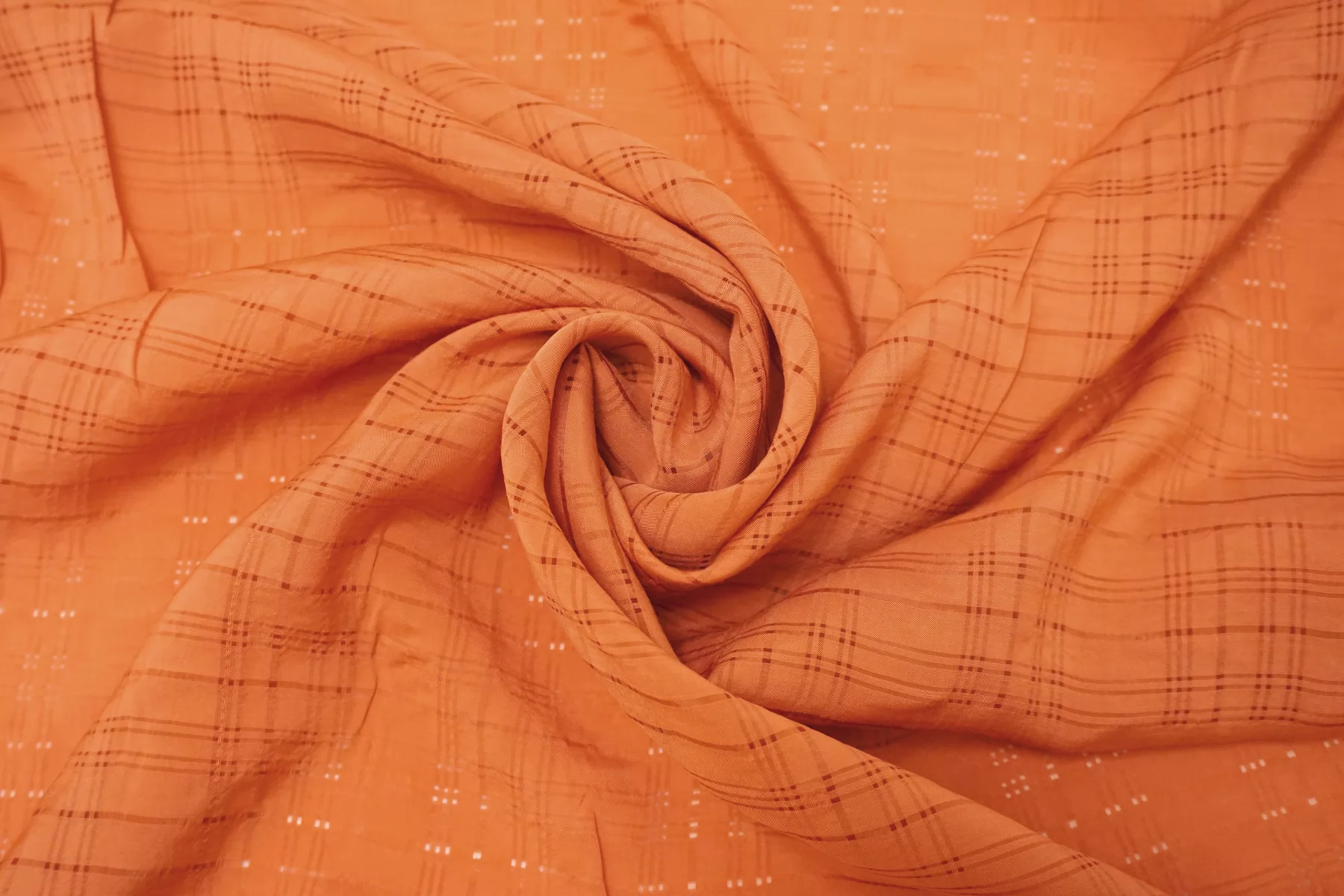 Прекрасная вискоза плательно-рубашечной плотности красивого, персиково-оранжевого цвета по типу мережки плетение образует мелкую клетку. Смотрится очень красиво. Тактильно материал очень приятный, мягкий. Не тянется, просвечивает. Форму не держит, пластичная. Шьем платье, рубашку, сарафан или юбку. Обязательно учитывайте усадку 5-10%. Шить изделия из данного материала рекомендуем тонкой иглой.