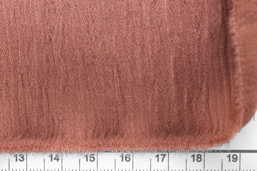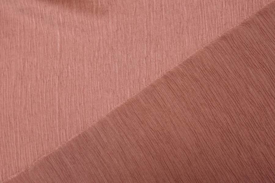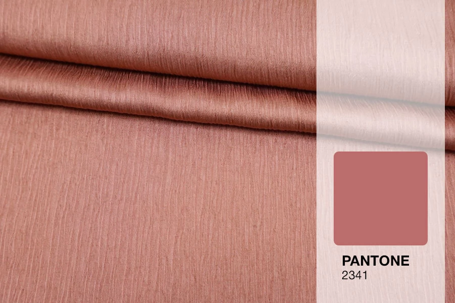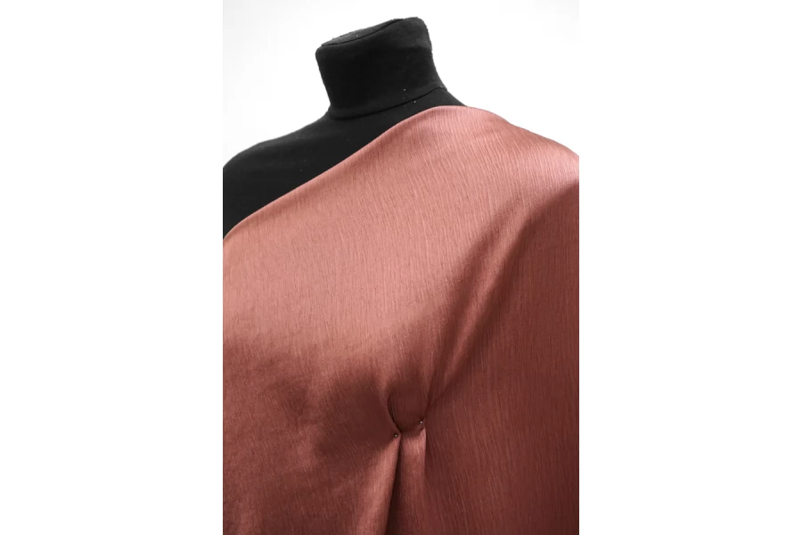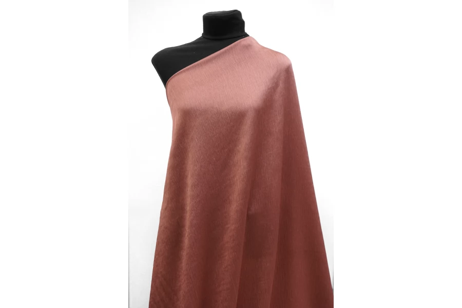 Роскошная вискоза с интересной жато-крешированной структурой. Очень красивый, сложный пыльно-розовый оттенок. Плетение с мягким отблеском. Пластичная, гладкая, тяжёленькая. Плетение совсем немного тянется (пружинит). Ткань минимально просвечивает силуэт в один слой. Подойдет для пошива платья, юбки, можно на костюм мягкой формы в пижамном стиле. При работе с этой тканью советуем использовать тонкие иглы и нитки.