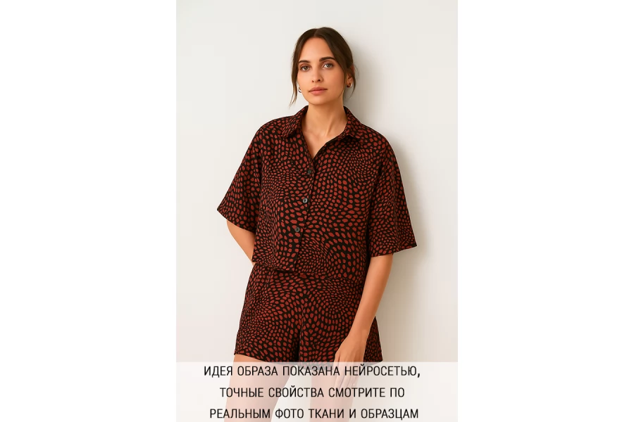 Необычная вискоза с хлопком в рубашечно-плательной группе Achille Pinto с абстрактным, напоминающим анималистичный, принтом в виде пятен разбеленного брусничного оттенка, на черном, с коричневым подтоном фоне. Полотняное плетение. Тактильно комфортный, тонкий, просвечивает силуэт на просвет. Не тянется. Не мнется. Немного держит форму, будет красиво смотреться в рукавах-фонариках. Интересный вариант на рубашки, юбки, платья, топа и не только. При необходимости используйте подкладочный материал. Обязательно учитывайте усадку.
