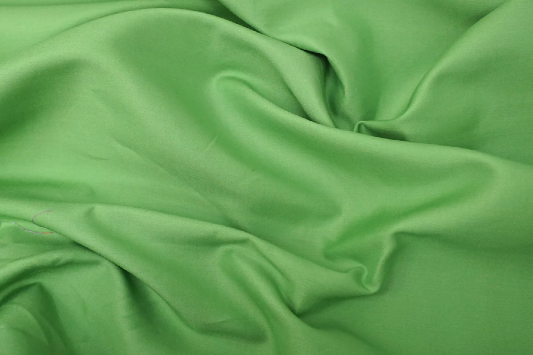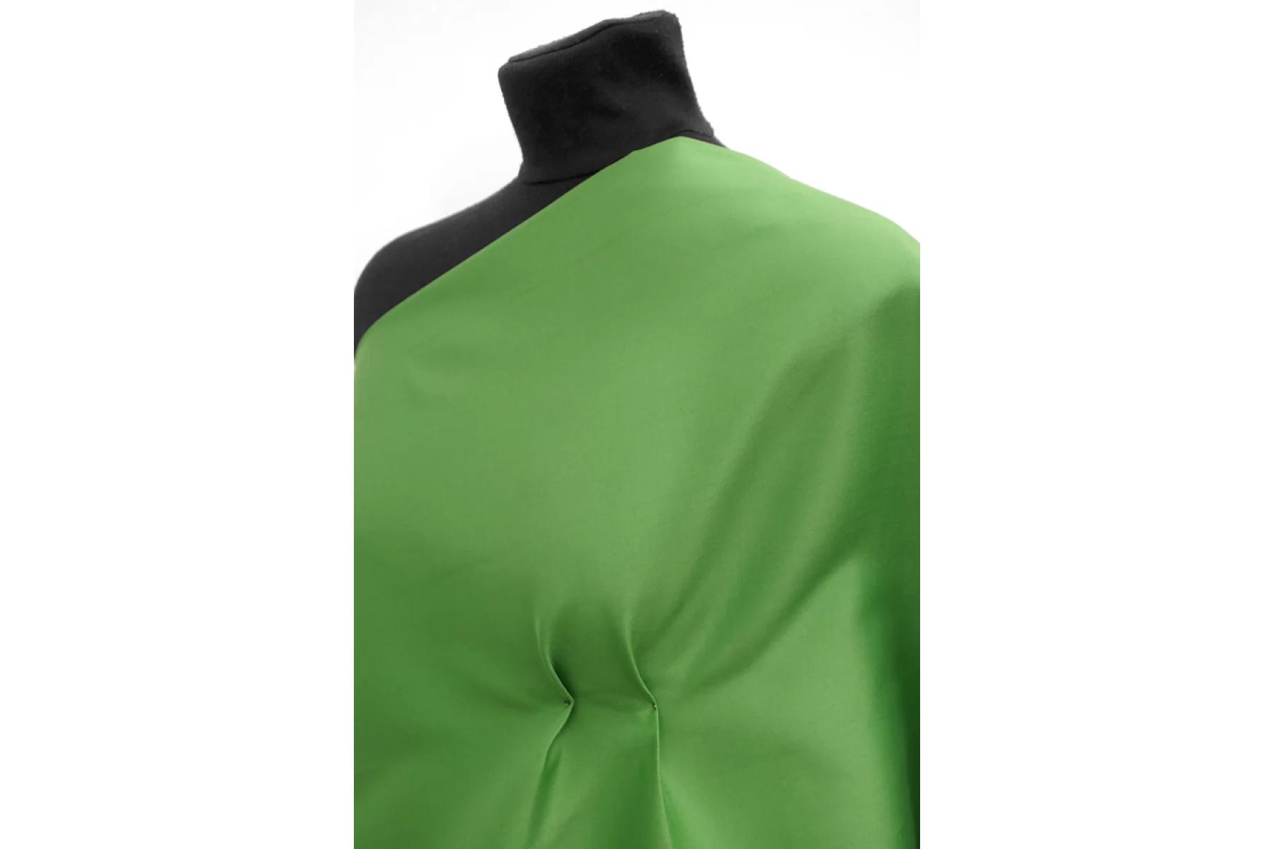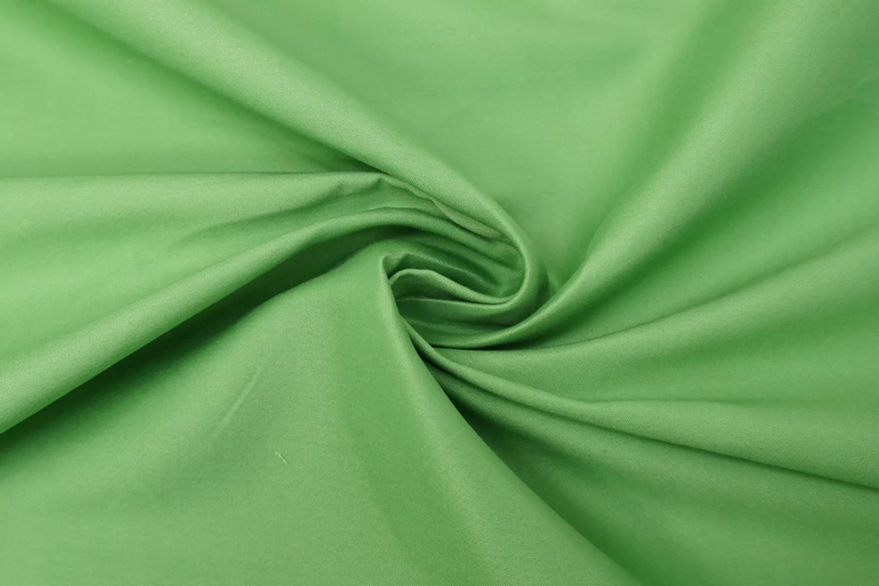 Красивая вискоза с шелком костюмно-плательной плотности, в салатово-зеленом оттенке. Материал на ощупь гладкий и мягкий. Форму держит. Не просвечивает, с мягким лоском. Не тянется. Немного мнется. Отлично подойдет на платья, юбки, нарядные костюмы. Уход деликатный.