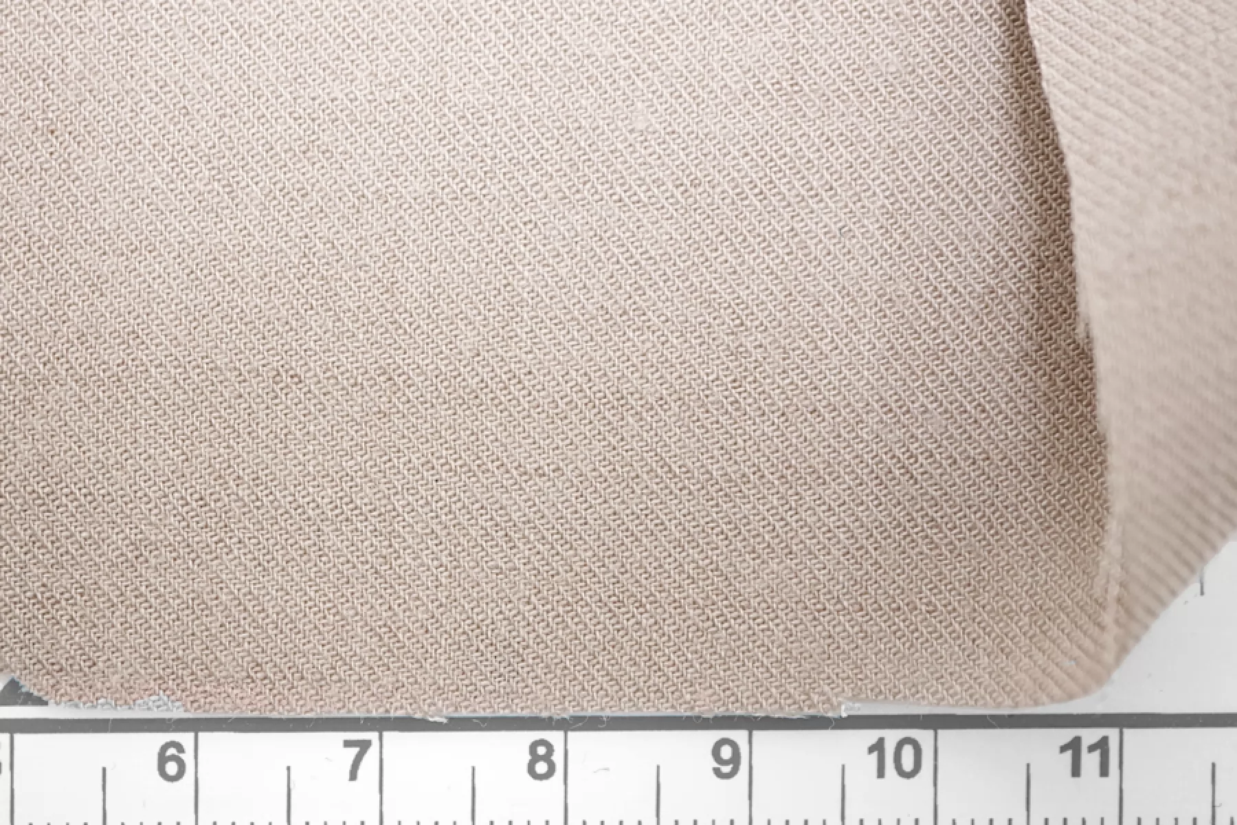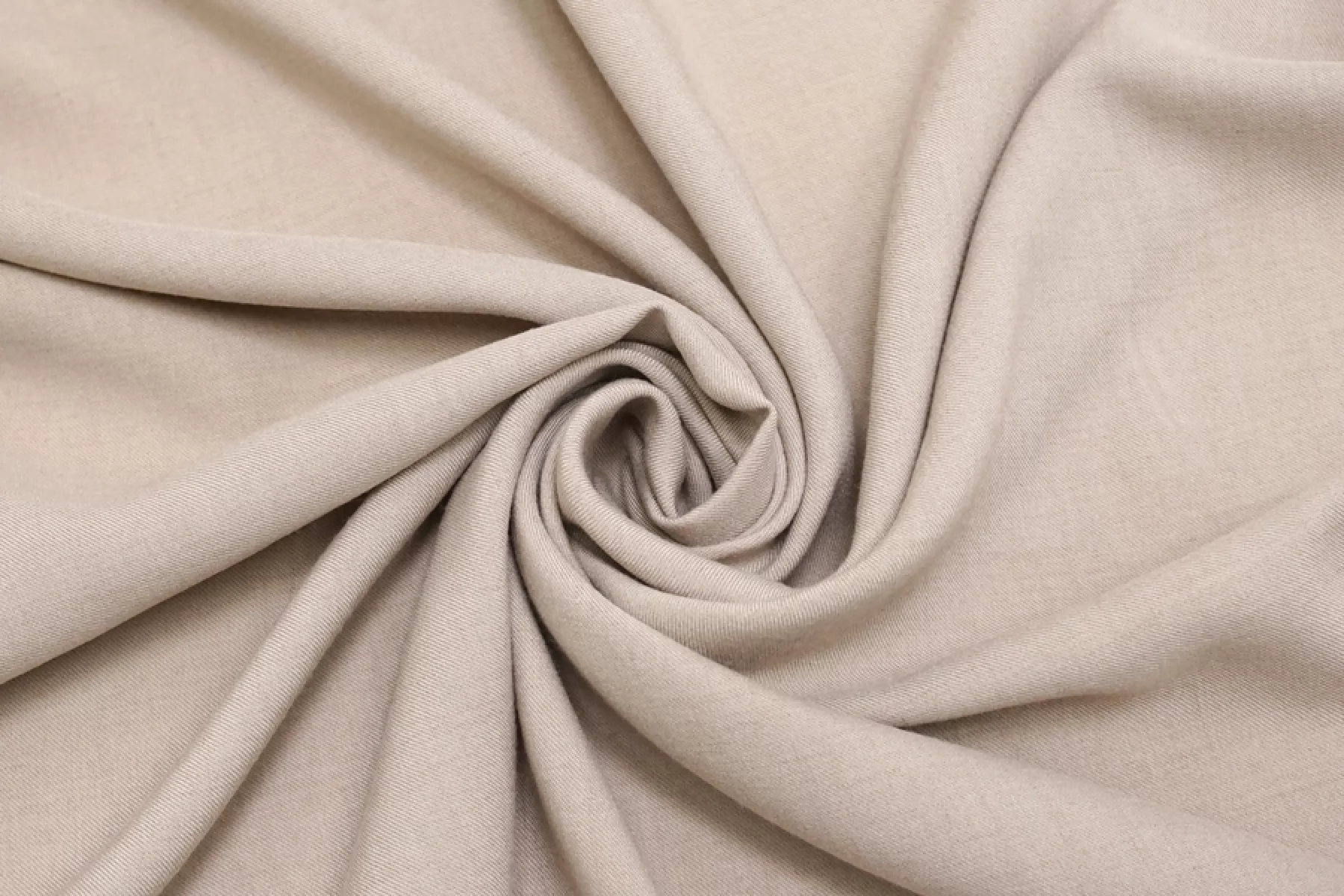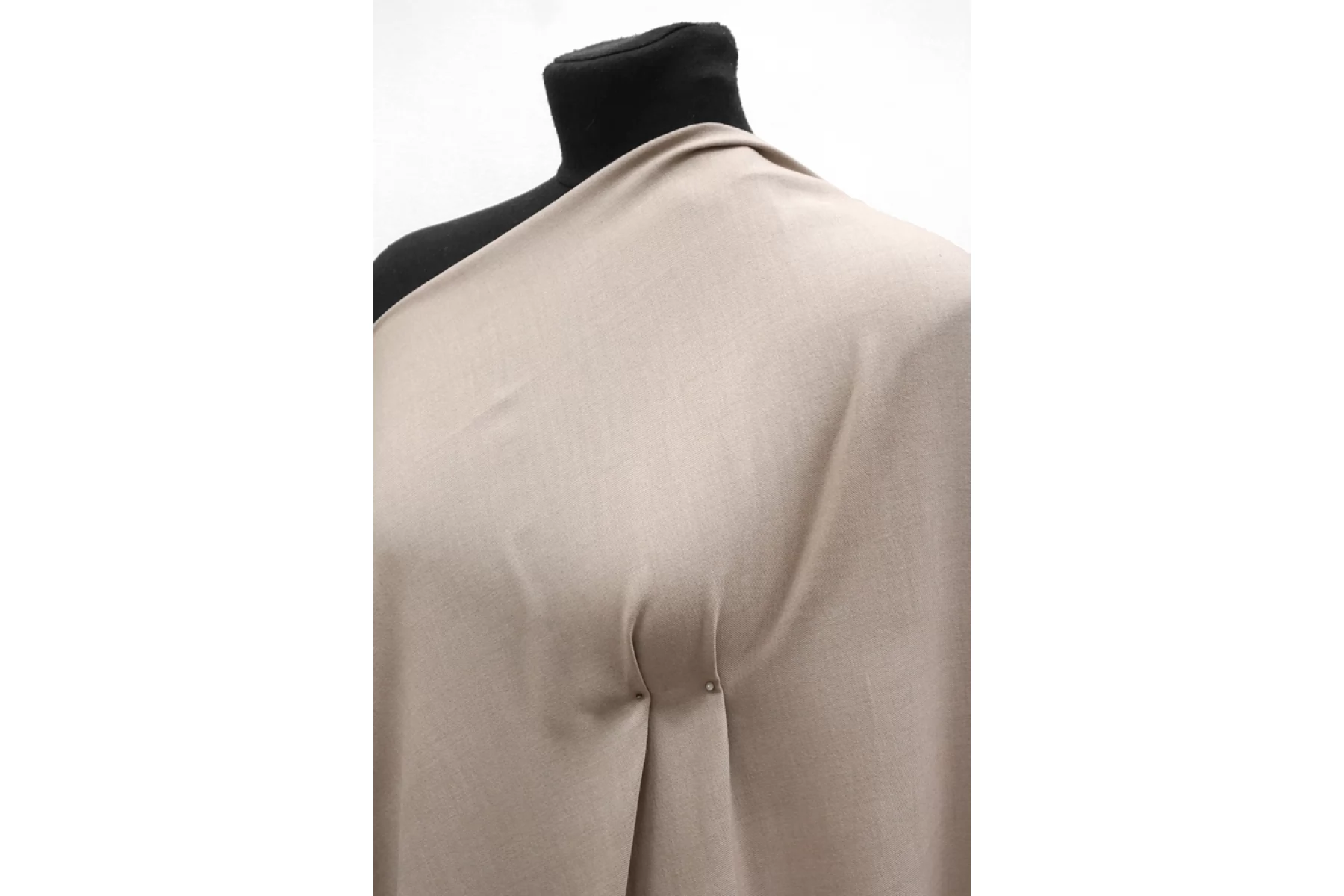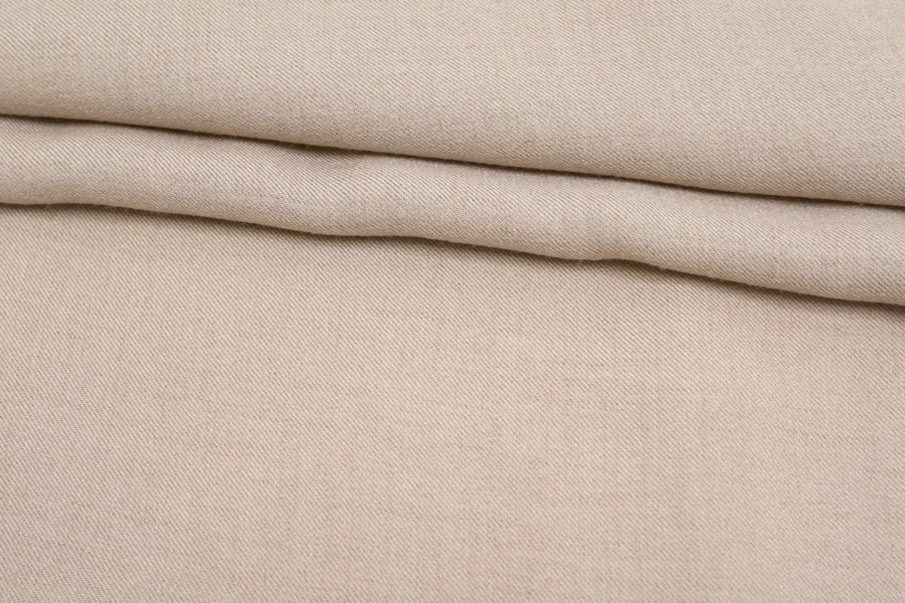 Тонкая вискоза с добавлением вирджинской шерсти, диагонального плетения в серо-бежевом приглушённом цвете (подтон ближе к холодному, с розовинкой). Тонкая, пластичная, не колючая, но шерсть слегка ощущается. Плетение слегка тянется-пружинит. Немного просвечивает. Слегка мнется. Не держит форму. Подойдет для пошива тёплых рубашек, юбок, платьев. При необходимости используйте подкладочный материал. Обязательно учитывайте усадку 5-10%.
