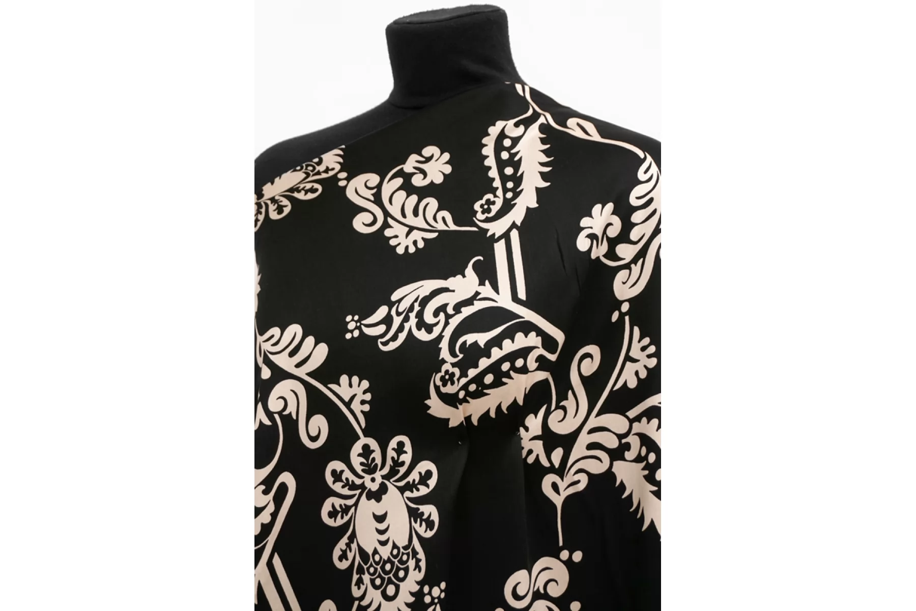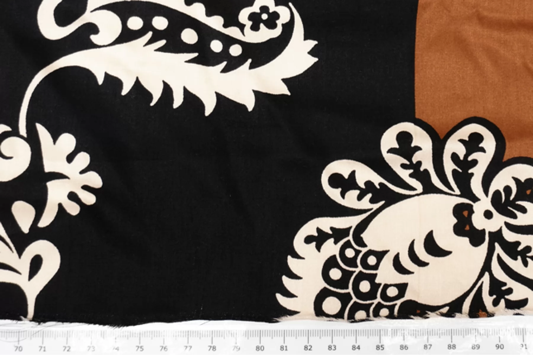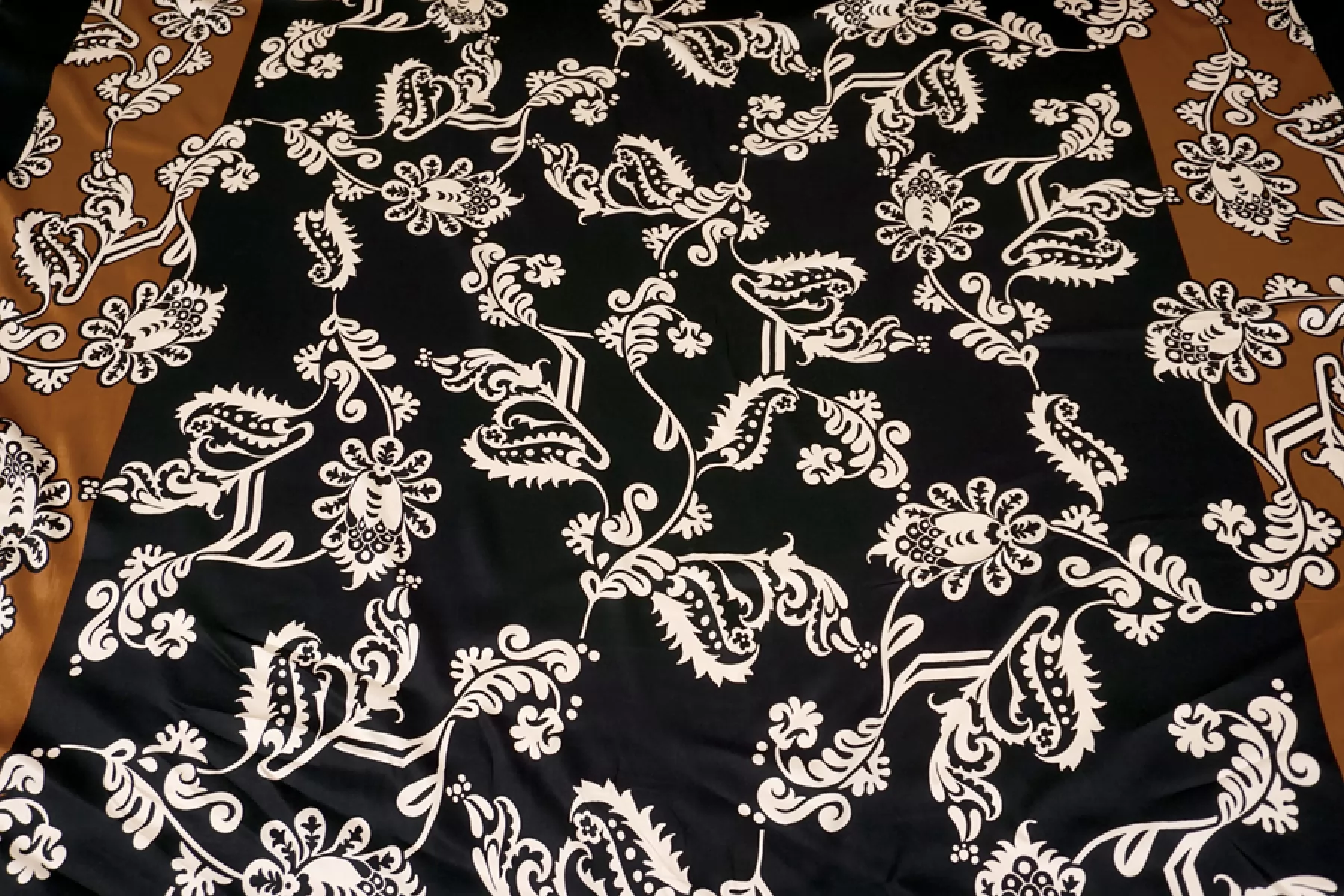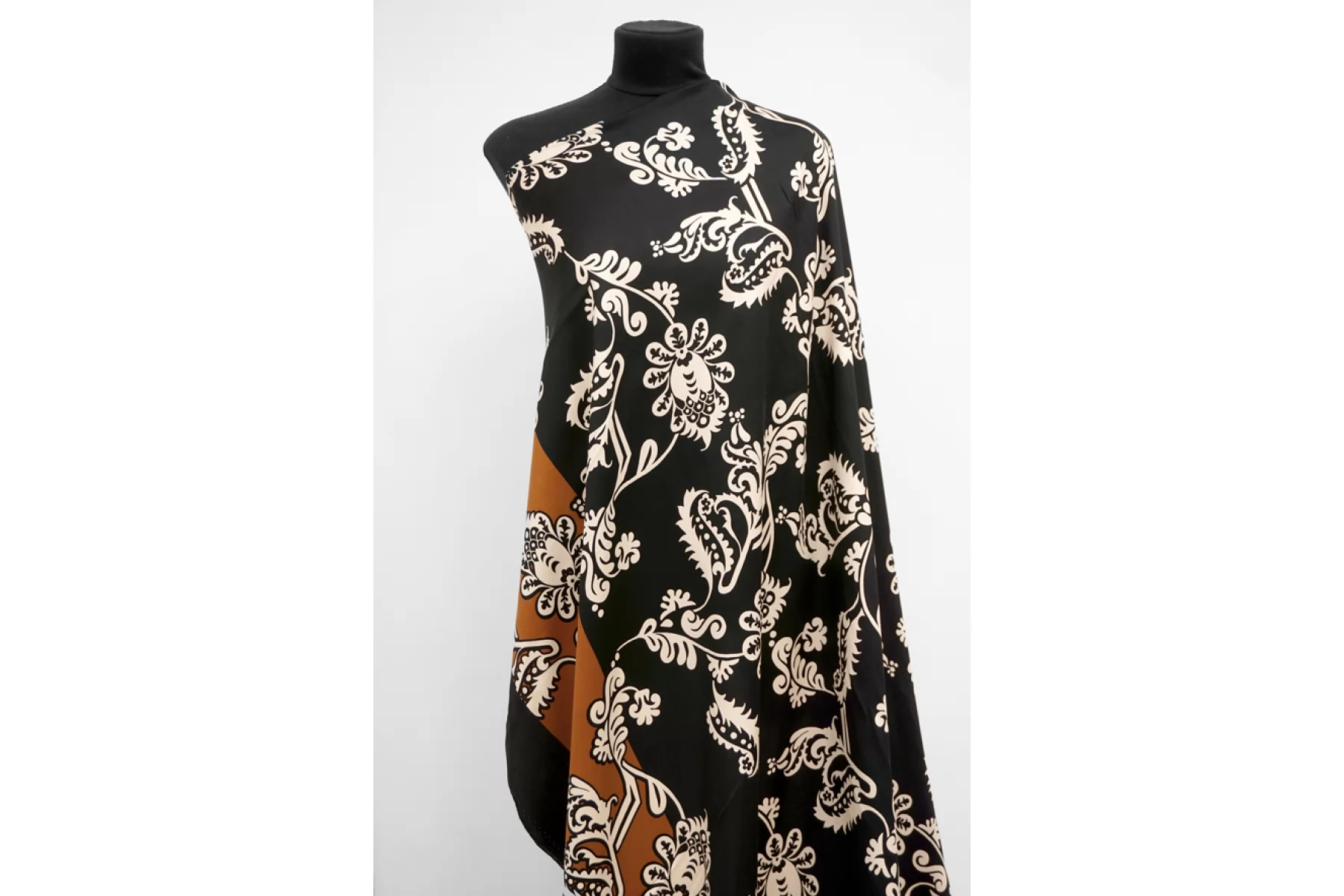 Вискоза сатинового плетения бренда Achille Pinto с достаточно крупным, светло-бежевым цветочным принтом на черном фоне, переходящим на широкие полосы оттенка молочный шоколад вдоль кромки. Тактильно очень приятная, мягкая, гладкая. Легкая, красиво струится и прекрасна в своей пластике. Обладает небольшим сатиновым лоском. Форму не держит, но красива в драпировке. Немного просвечивает силуэт на просвет. Не тянется, можно кроить в обе стороны. Немного мнется. Шьем платья, блузки и юбки, сарафаны, кимоно, брюки на резинке, красиво обрамляя каймой изделия, как вертикально, так и горизонтально. При необходимости используйте подкладочный материал. Обязательно учитывайте усадку 5-10 см