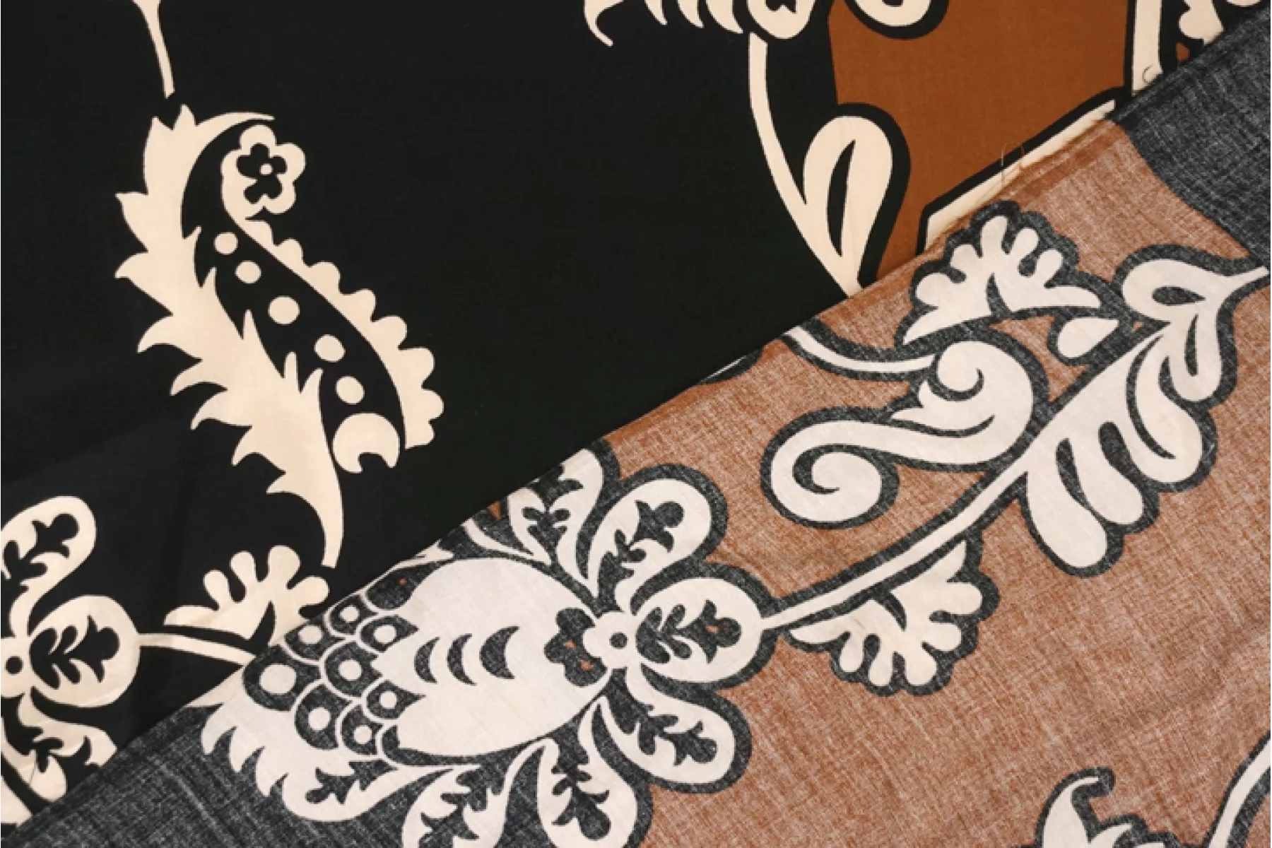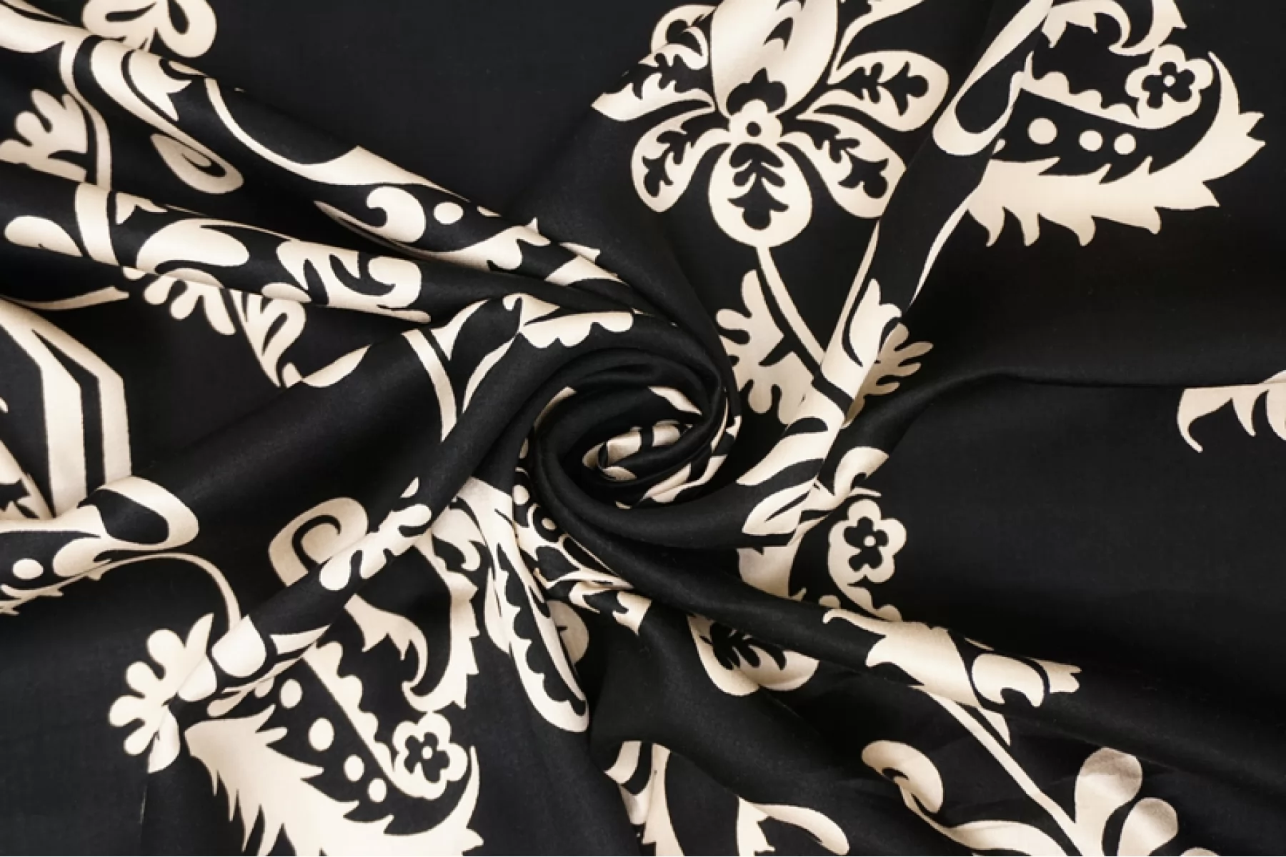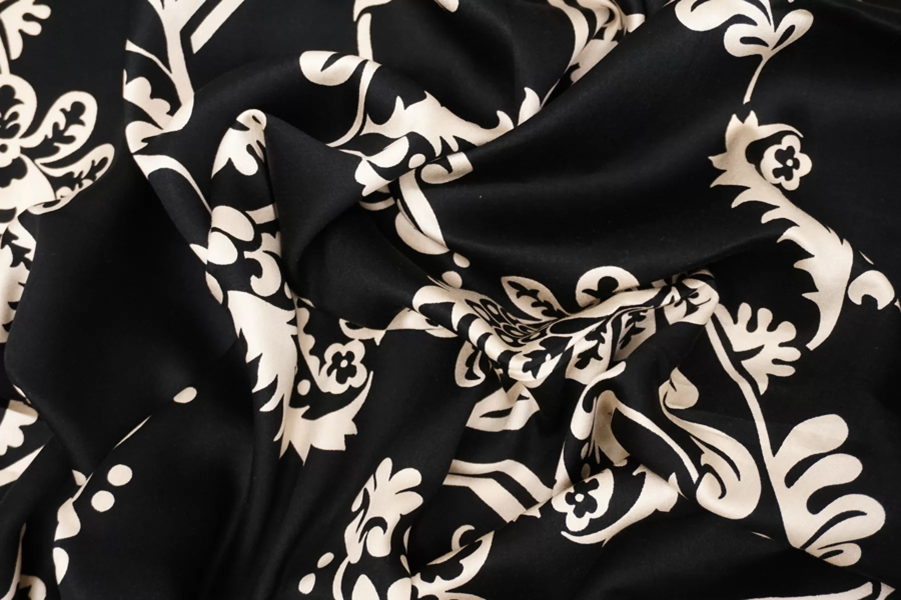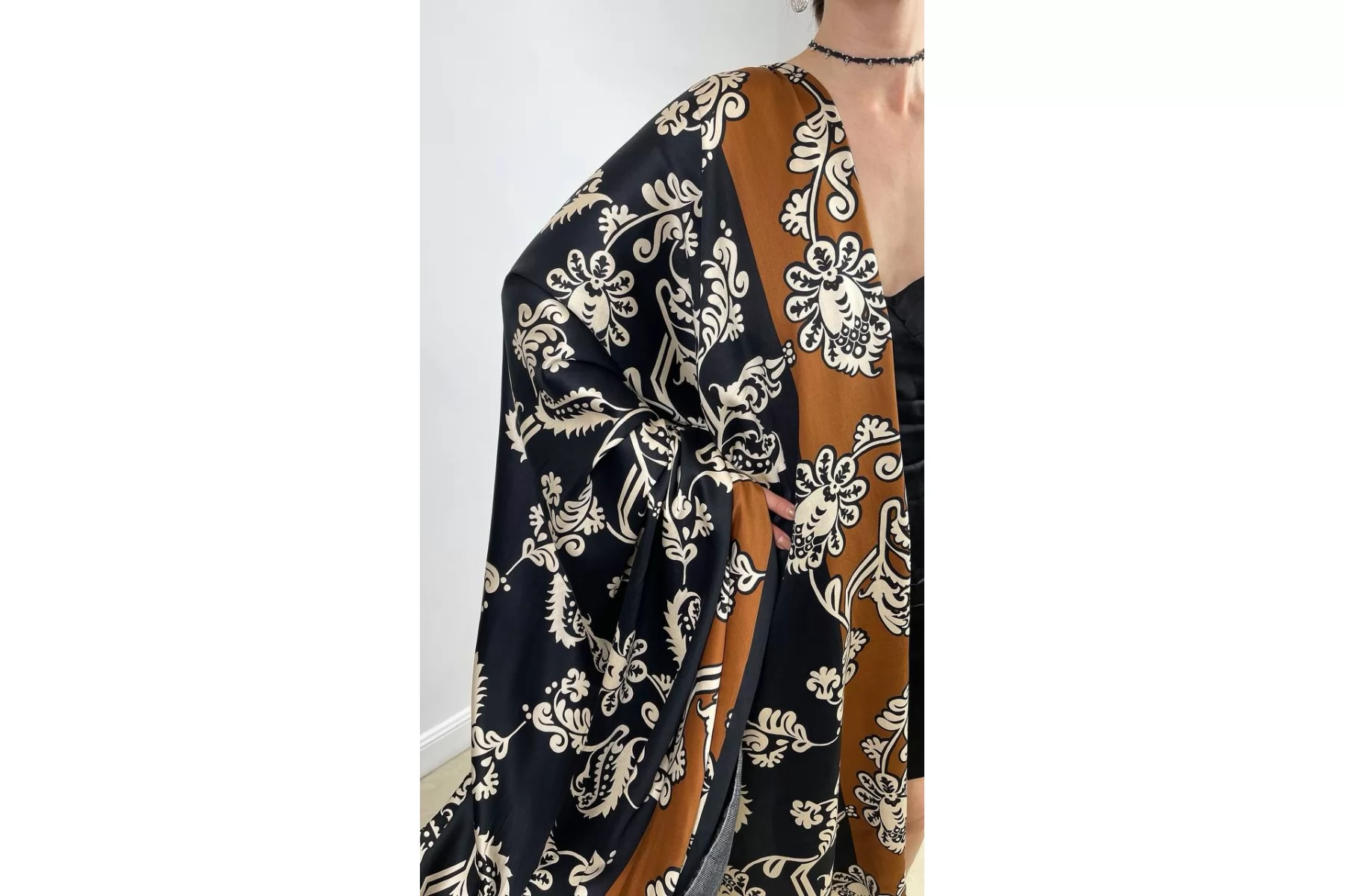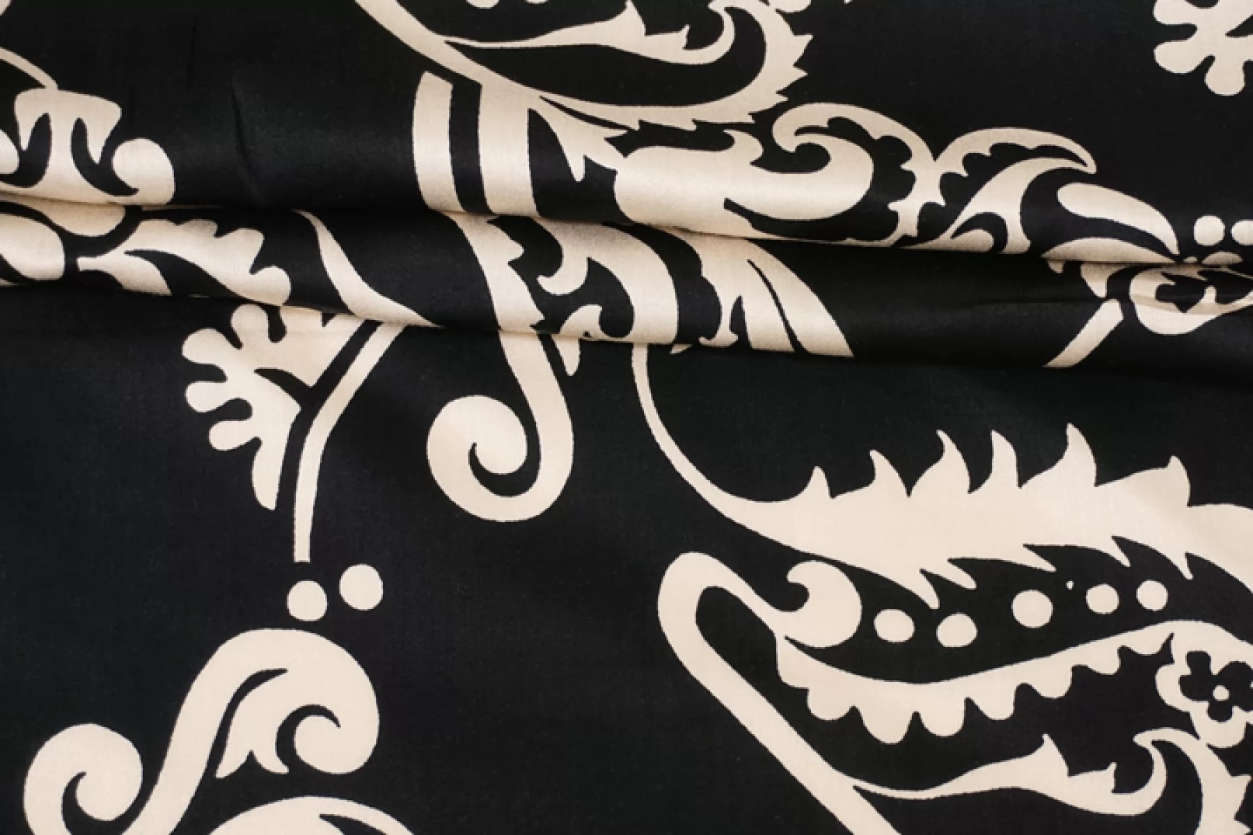 Вискоза сатинового плетения бренда Achille Pinto с достаточно крупным, светло-бежевым цветочным принтом на черном фоне, переходящим на широкие полосы оттенка молочный шоколад вдоль кромки. Тактильно очень приятная, мягкая, гладкая. Легкая, красиво струится и прекрасна в своей пластике. Обладает небольшим сатиновым лоском. Форму не держит, но красива в драпировке. Немного просвечивает силуэт на просвет. Не тянется, можно кроить в обе стороны. Немного мнется. Шьем платья, блузки и юбки, сарафаны, кимоно, брюки на резинке, красиво обрамляя каймой изделия, как вертикально, так и горизонтально. При необходимости используйте подкладочный материал. Обязательно учитывайте усадку 5-10 см