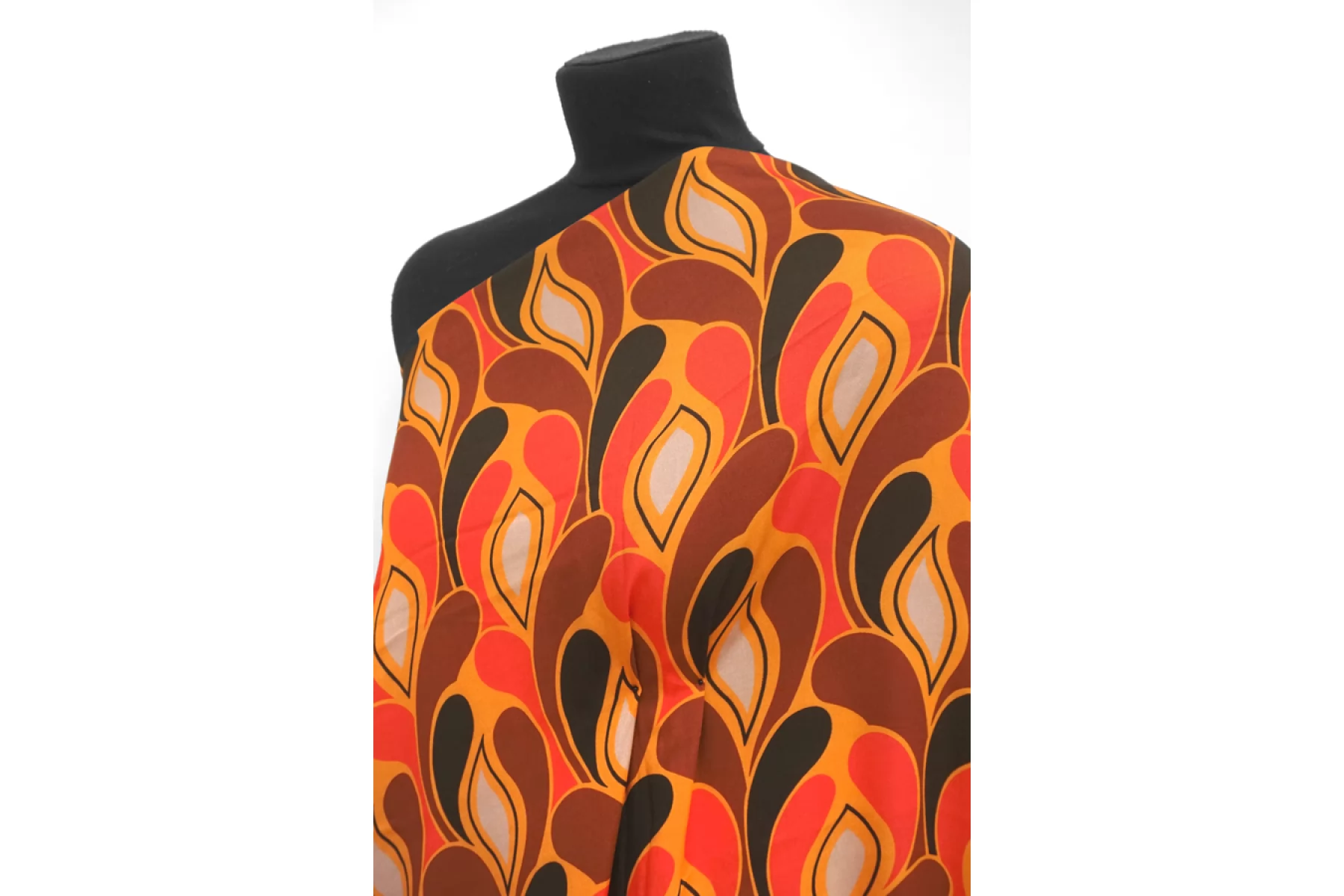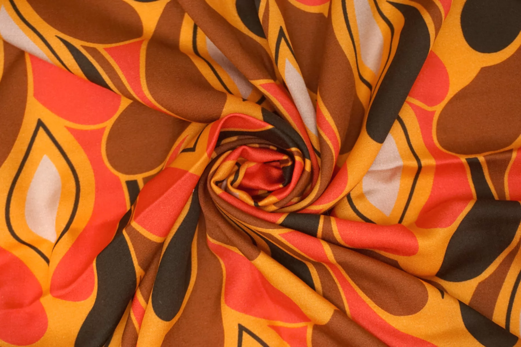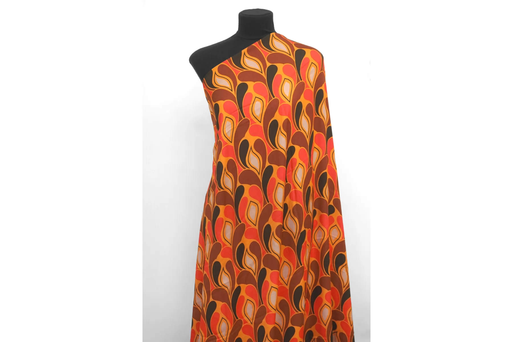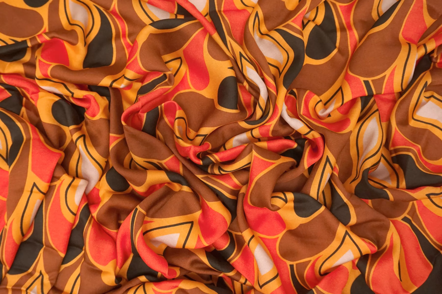 Плательный вискозный сатин с абстрактно-орнаментальным принтом, с золотисто-оранжевым оттенком в основе и красных, коричневых, черных и серо-розоватых оттенках. Тактильно вискоза очень приятная, мягкая, гладкая. Легкая, красиво струится и хороша в своей пластике и складках. Слегка просвечивает контур силуэта на просвет. Не тянется, но немного пружинит за счет плетения. Немного сминается. Отлично подойдет на платья, блузки и юбки, а также одежду в бельевом стиле. При необходимости используйте подкладочный материал. Обязательно учитывайте усадку 5-10%. Шить изделия из данного материала рекомендуем тонкой иглой.