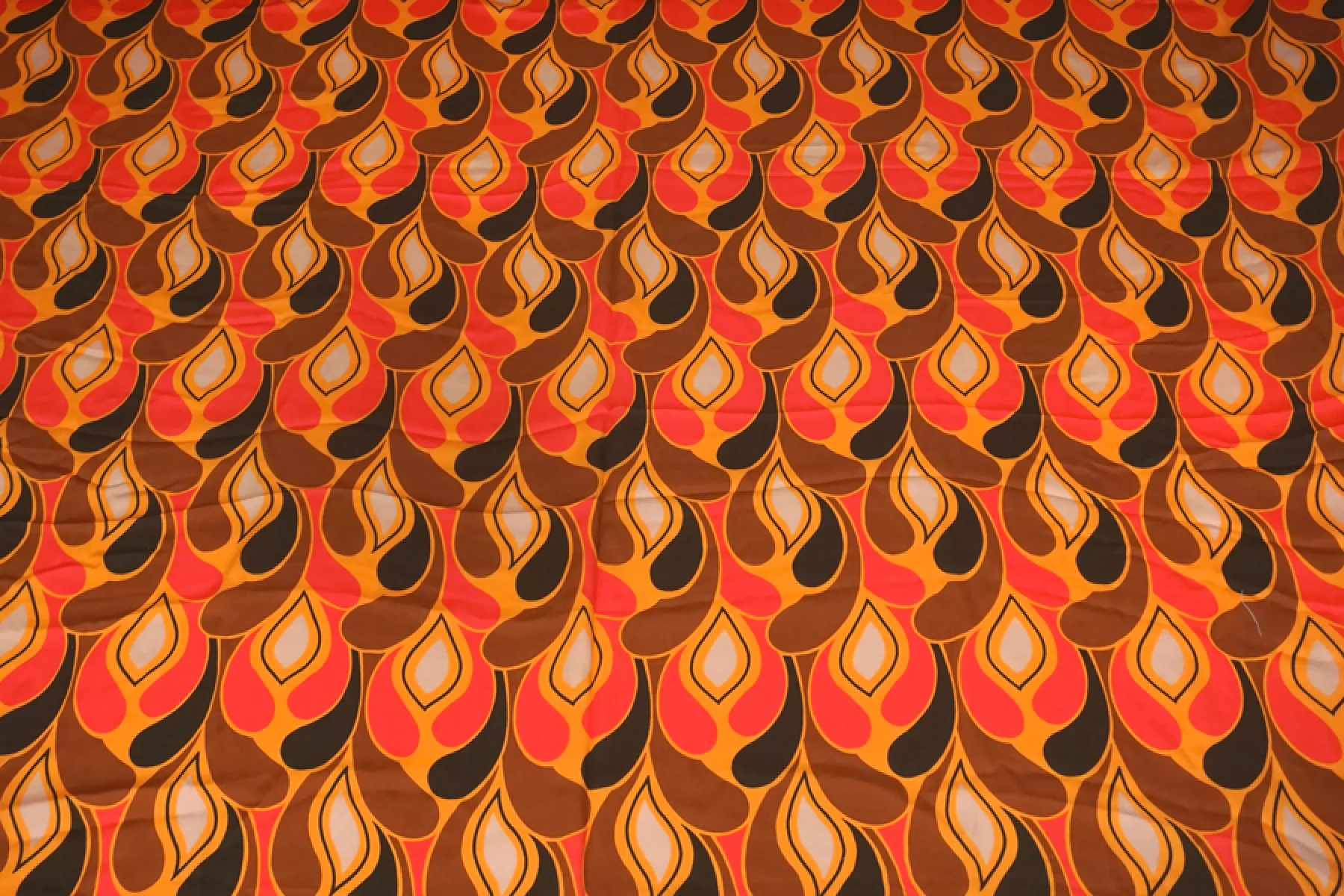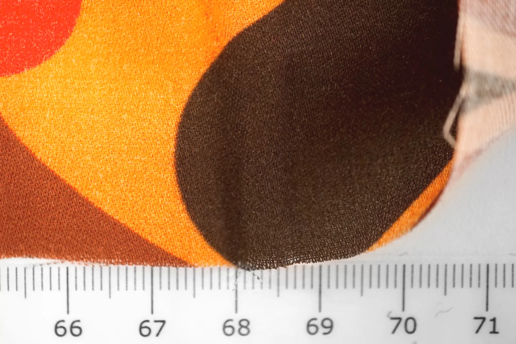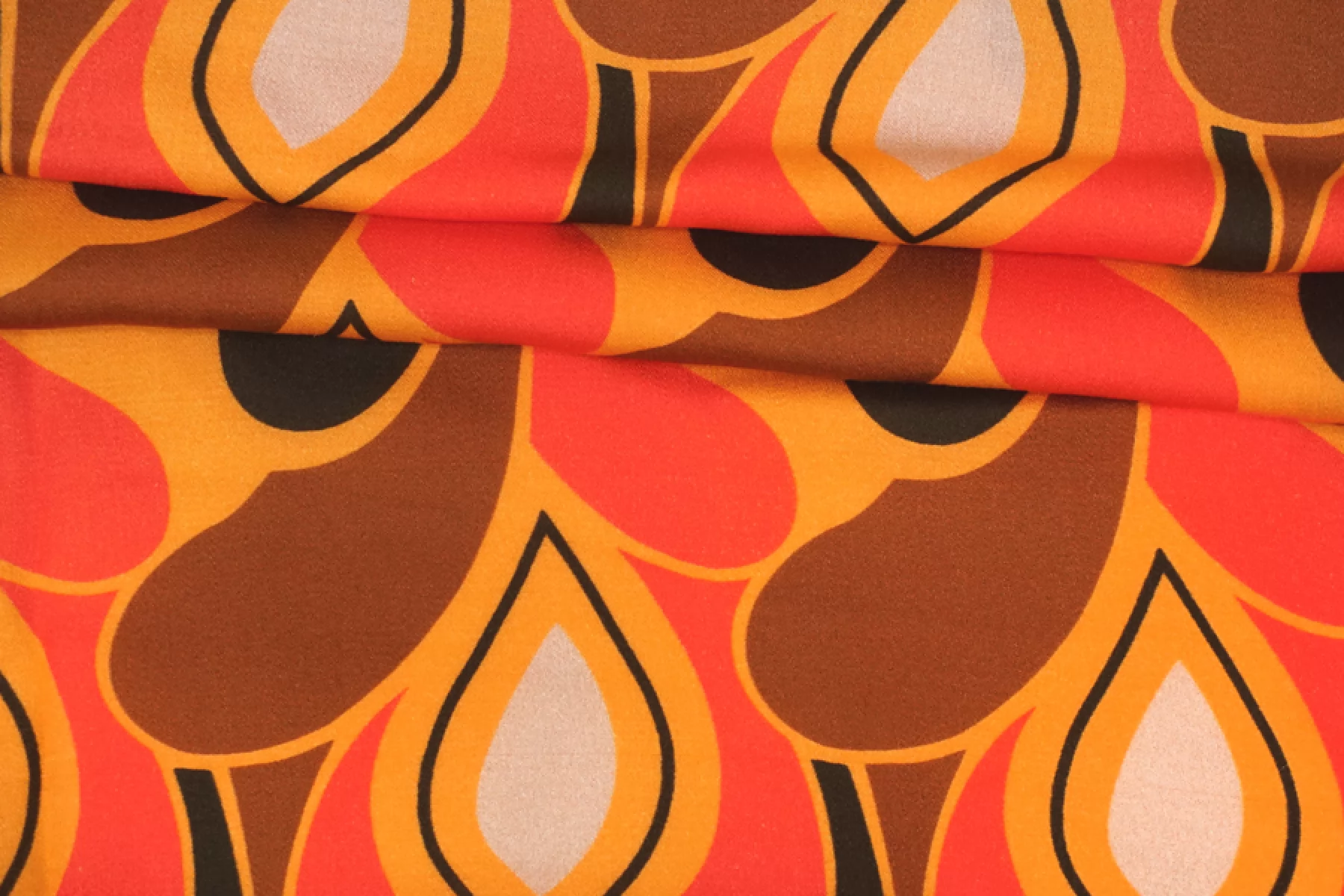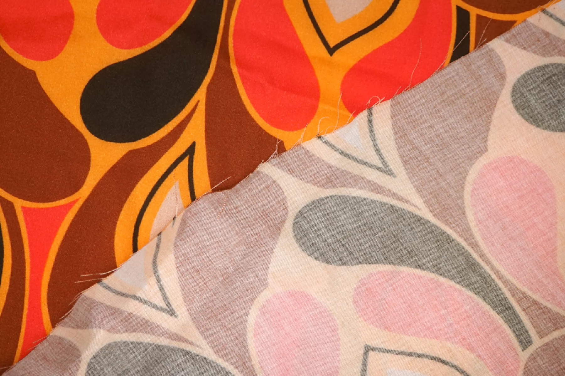 Плательный вискозный сатин с абстрактно-орнаментальным принтом, с золотисто-оранжевым оттенком в основе и красных, коричневых, черных и серо-розоватых оттенках. Тактильно вискоза очень приятная, мягкая, гладкая. Легкая, красиво струится и хороша в своей пластике и складках. Слегка просвечивает контур силуэта на просвет. Не тянется, но немного пружинит за счет плетения. Немного сминается. Отлично подойдет на платья, блузки и юбки, а также одежду в бельевом стиле. При необходимости используйте подкладочный материал. Обязательно учитывайте усадку 5-10%. Шить изделия из данного материала рекомендуем тонкой иглой.