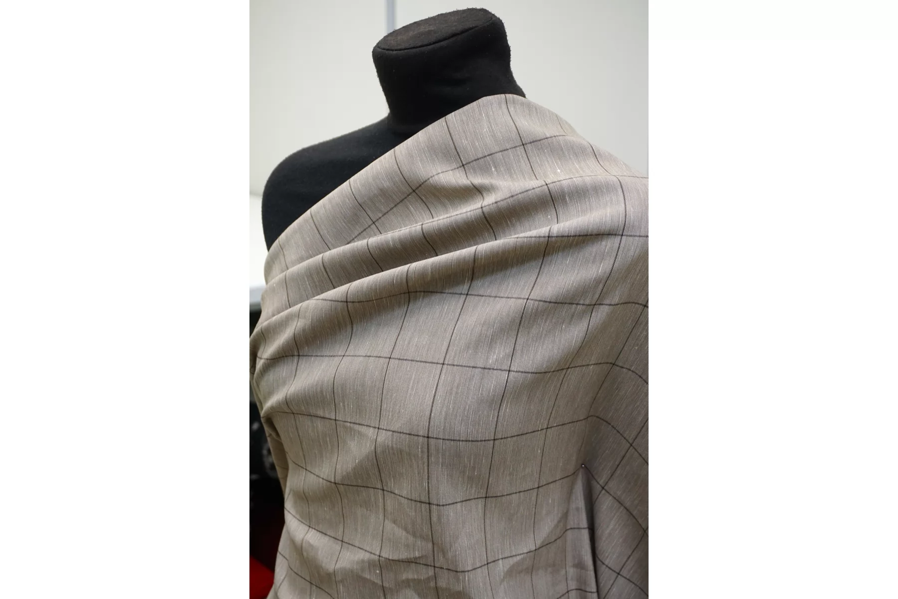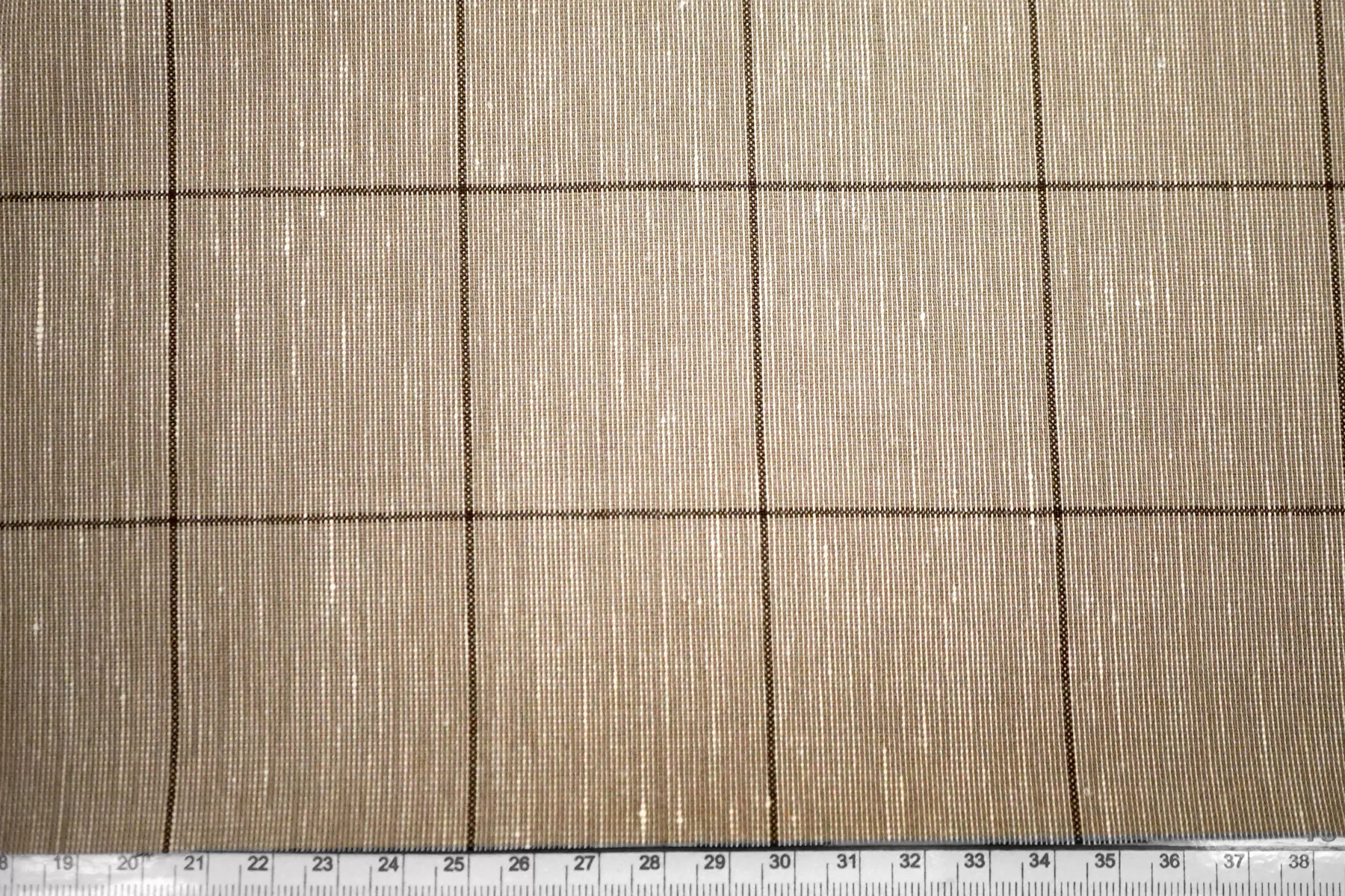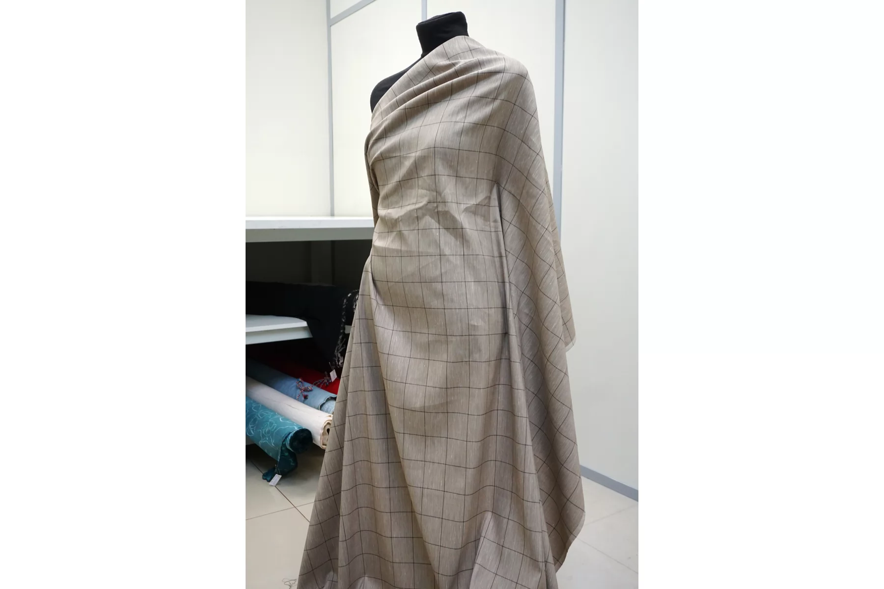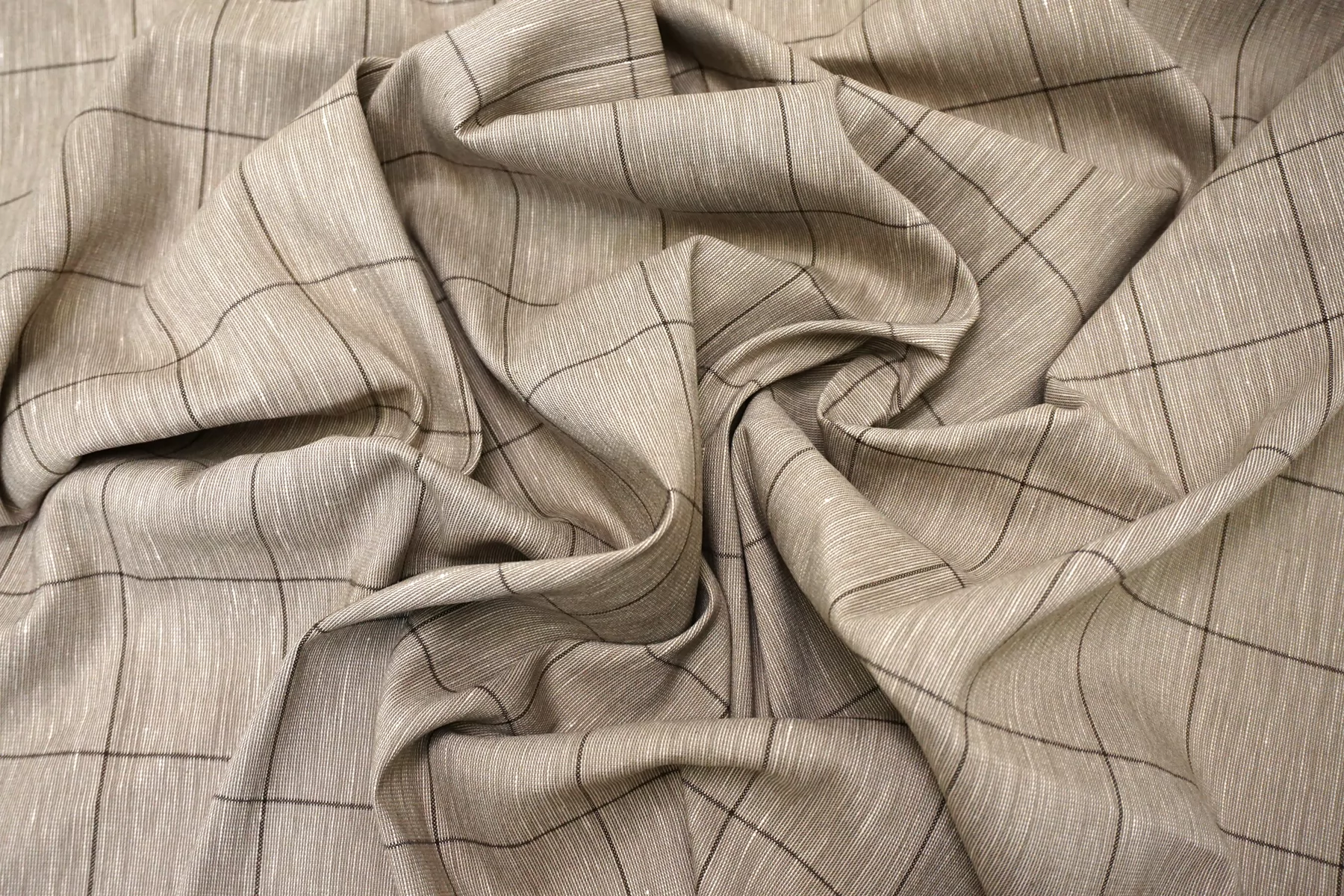 Вискоза со льном костюмно-плательной плотности, узор - клетка, нити бежевого, молочного и тёмно-коричневого цвета. Гладкий и приятный наощупь. Встречаются уплотнения. Минимально просвечивает силуэт на просвет. Хорошо тянется. Сминается. Пластичный. Отличный вариант на костюмы, брюки, платья, юбки, мягкие жакеты. Учитывайте возможную усадку.