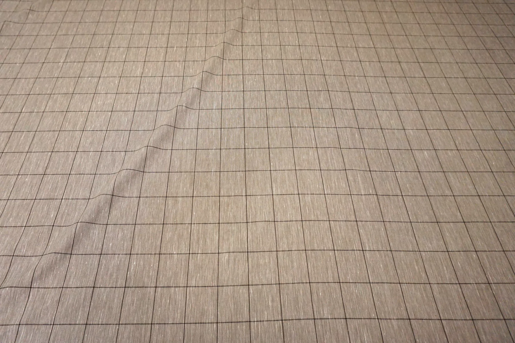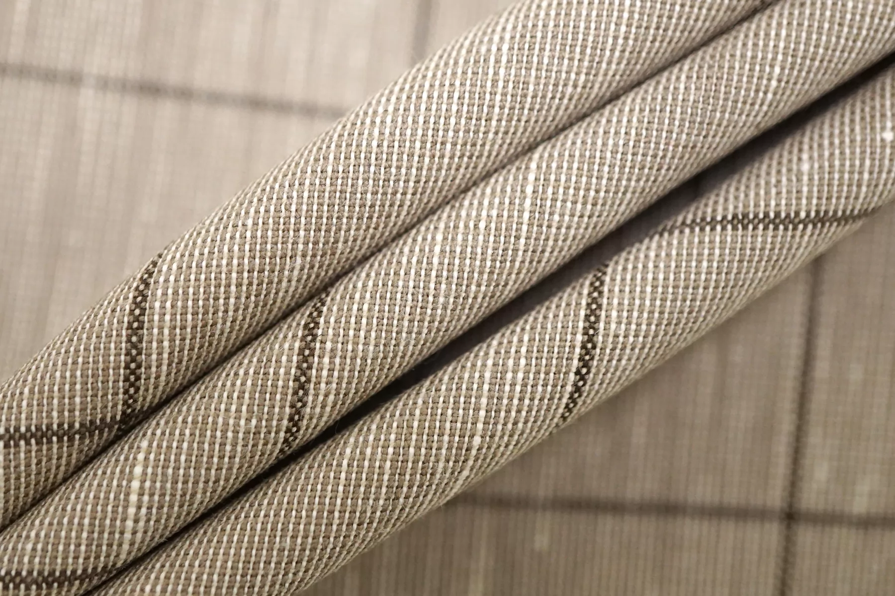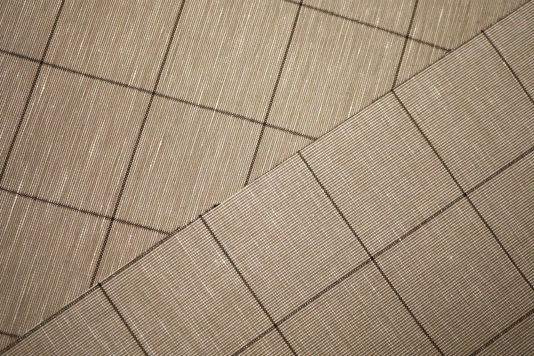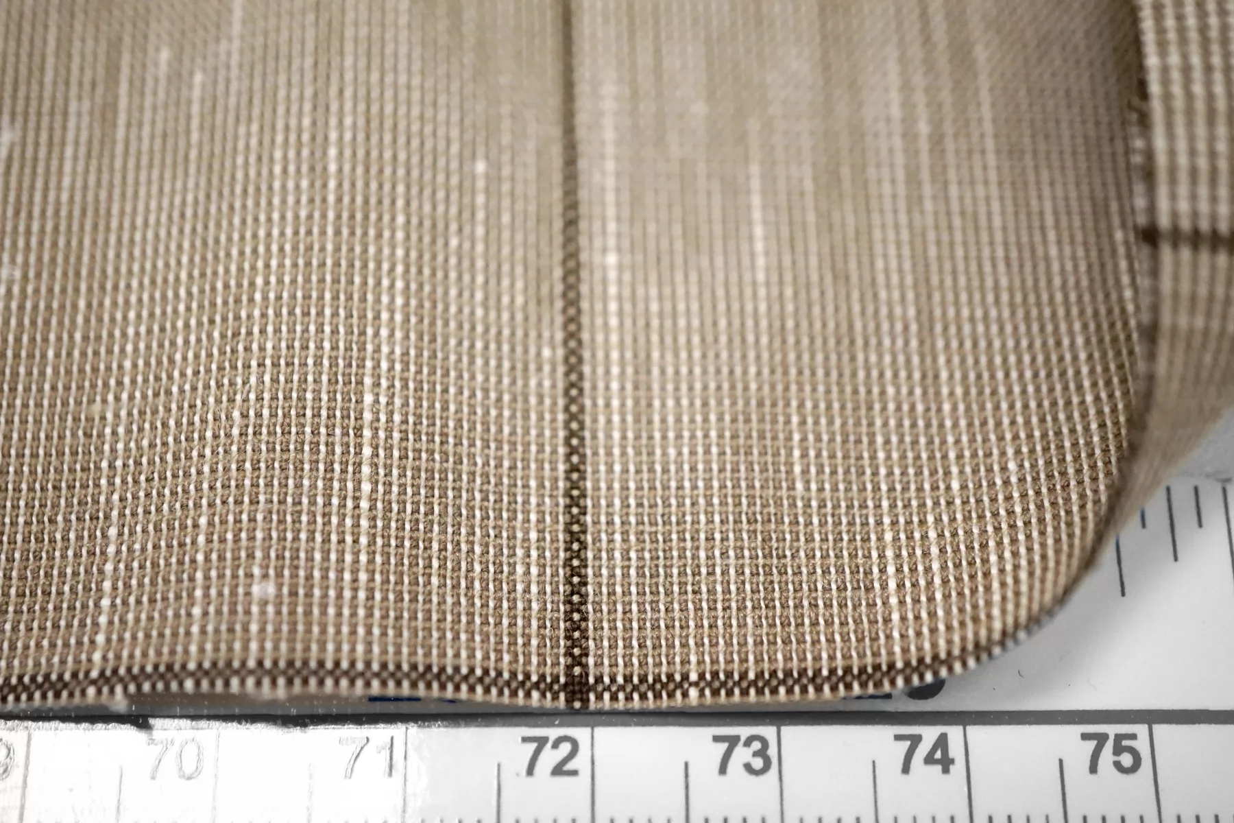 Вискоза со льном костюмно-плательной плотности, узор - клетка, нити бежевого, молочного и тёмно-коричневого цвета. Гладкий и приятный наощупь. Встречаются уплотнения. Минимально просвечивает силуэт на просвет. Хорошо тянется. Сминается. Пластичный. Отличный вариант на костюмы, брюки, платья, юбки, мягкие жакеты. Учитывайте возможную усадку.