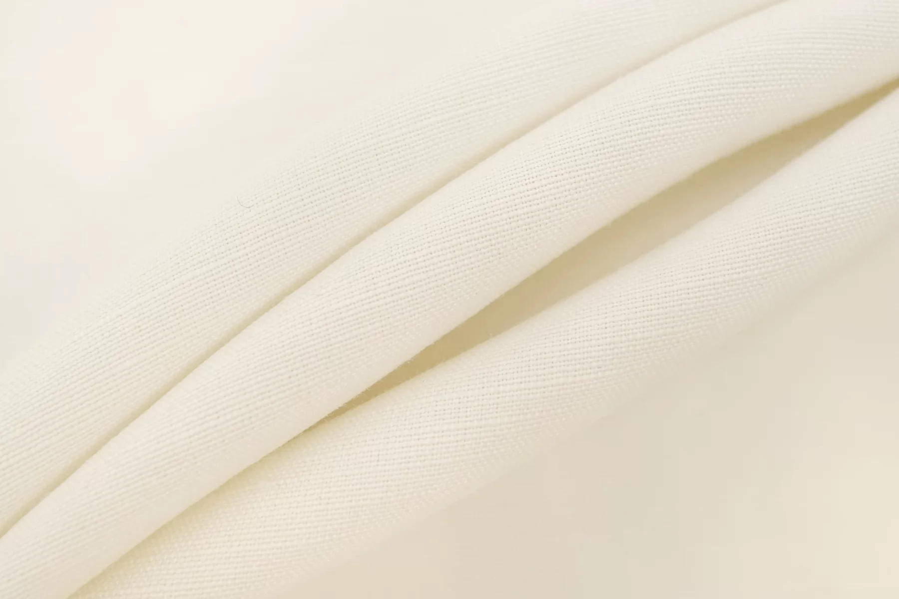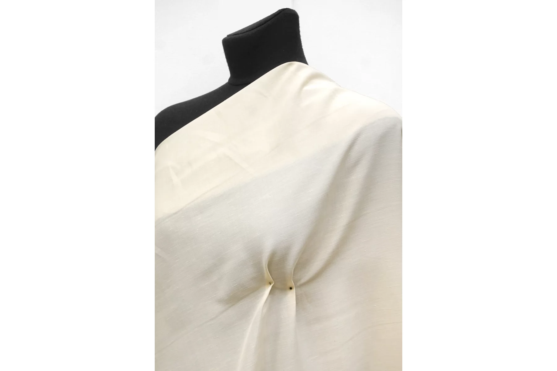 Прекрасная плательно-рубашечная вискоза со льном от бренда Max Mara, в белом цвете с легким бежевым подтоном. С фактурными льняными утолщениями нити. Не тянется, немного просвечивает силуэт. Мягкая, гладкая, тактильно лен слегка ощущается. Сминаемость средняя. Пластичная, форму держит средне. Вариант на платья, кимоно, рубашки второго слоя, юбки, брюки. Будет круто смотреться в комплекте рубашка + шорты, рубашка + брюки-палаццо.