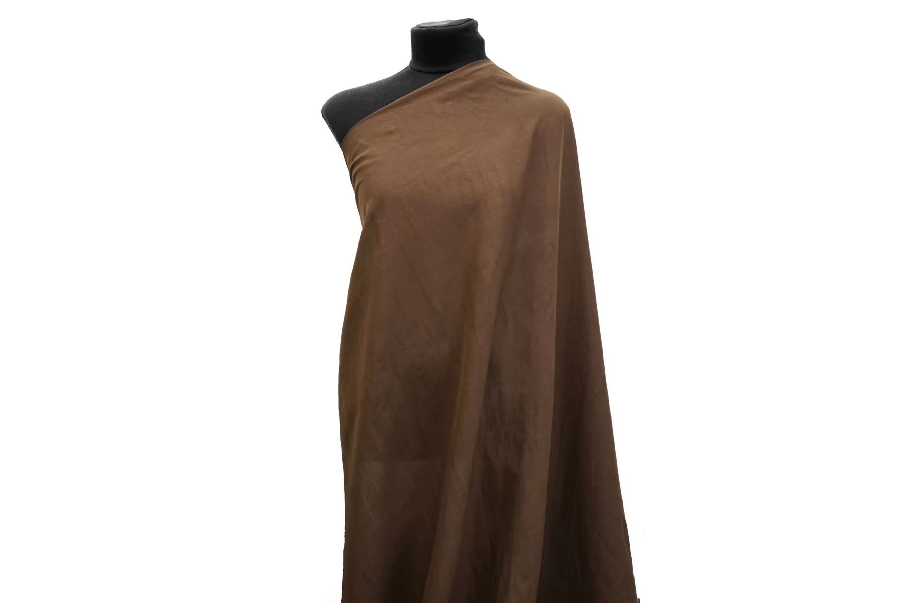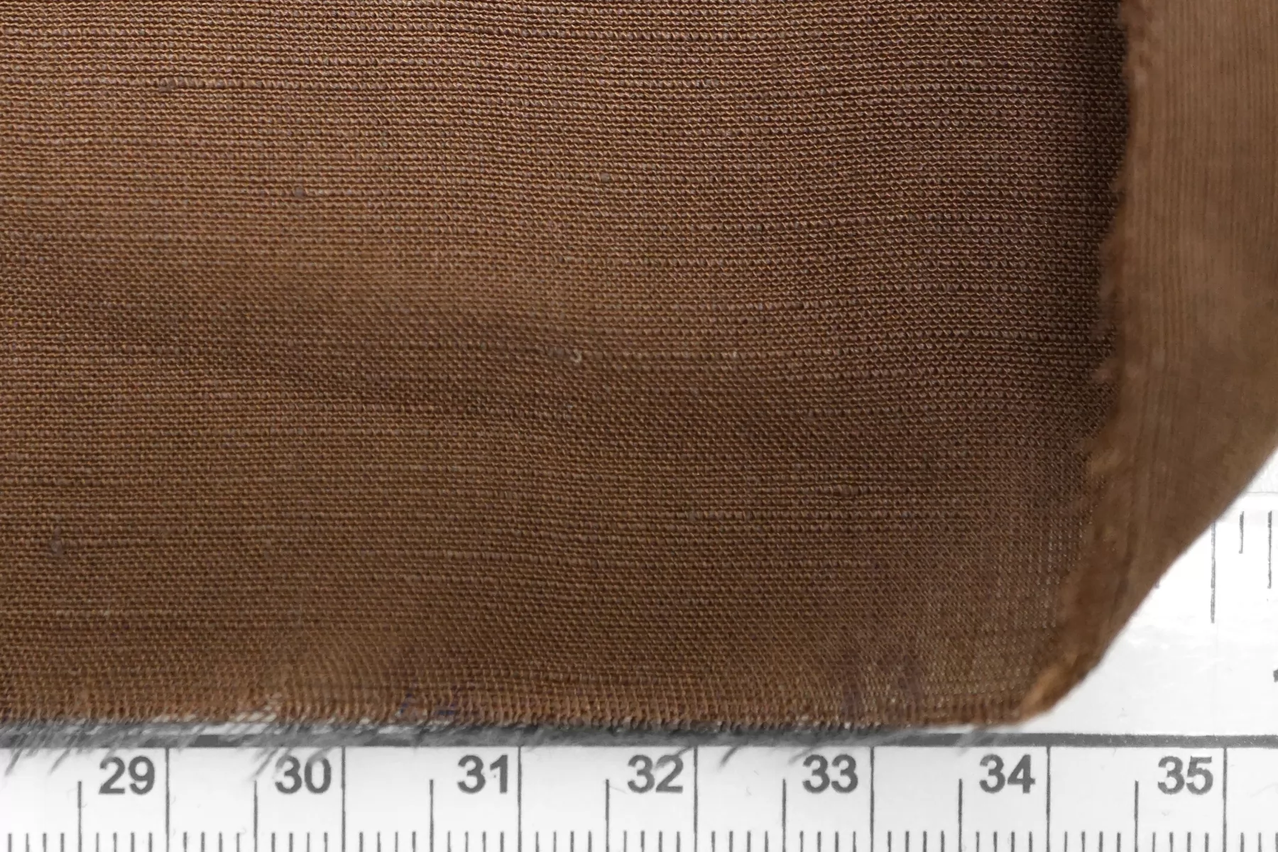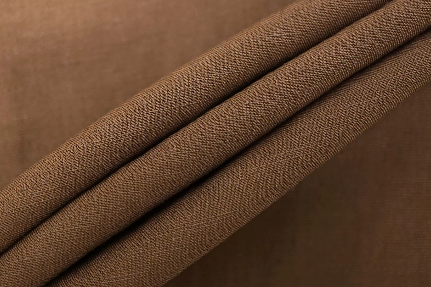 Рубашечно-плательная вискоза со льном, в коричневом цвете. С фактурными льняными утолщениями нити. Плетение не плотное, тонкая. Не тянется, немного просвечивает. Мягкая, тактильно лен слегка ощущается. Мнётся. Пластичная, форму практически не держит. Вариант на платья, рубашки, юбки, сарафаны. При необходимости используйте подкладку.