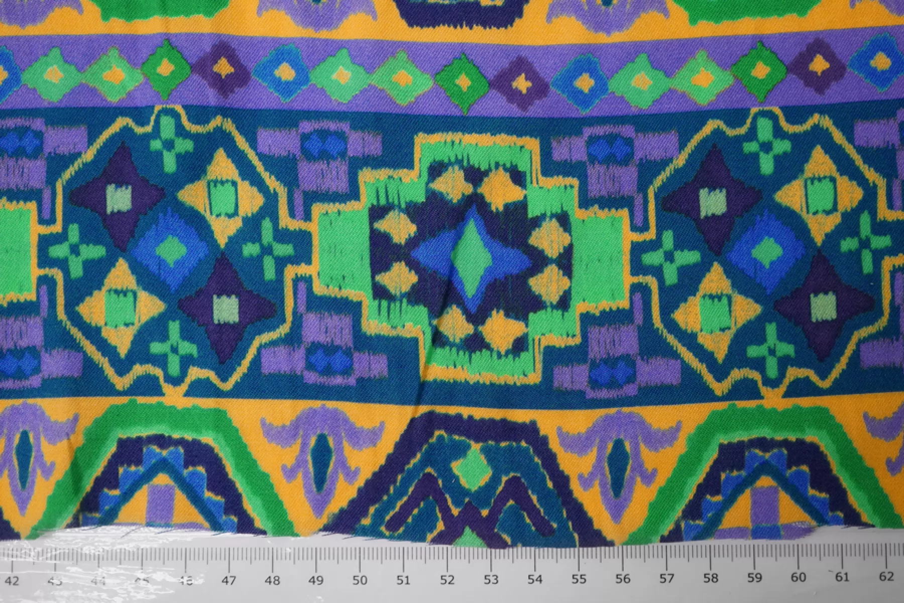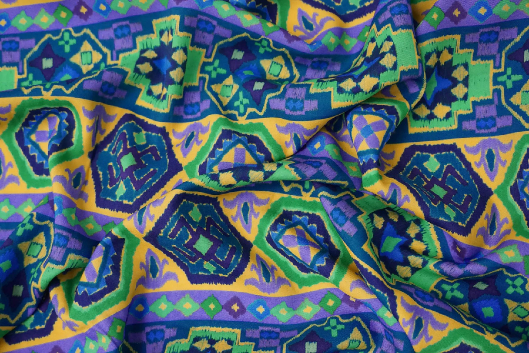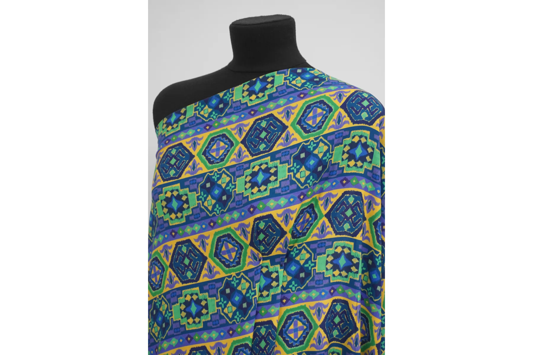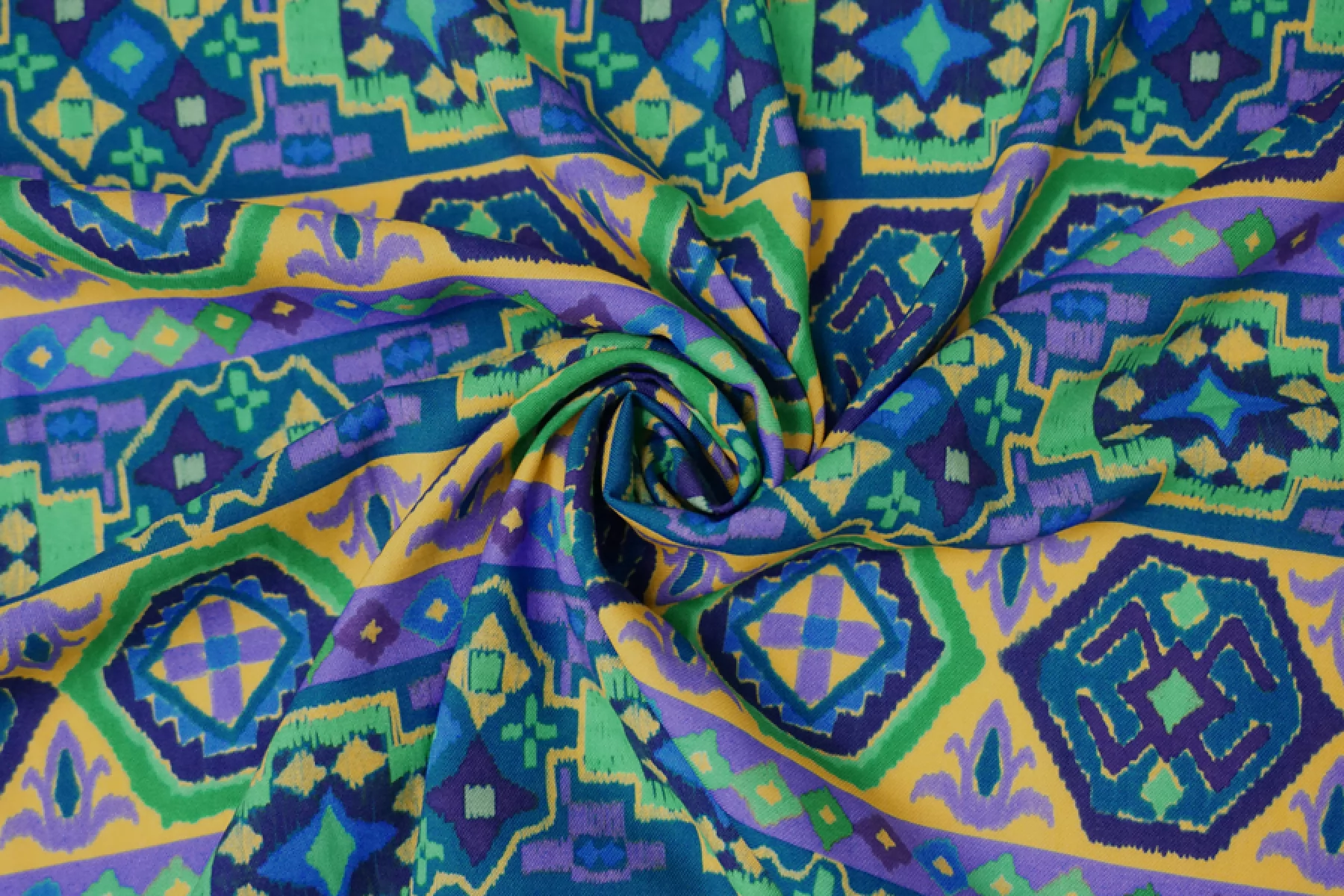 Плательная вискоза диагонального плетения с повторяющимися полосами орнамента в оттенках желтого, сиреневого, зеленого и синего. Материал мягкий и очень приятный. Отлично тянется за счет эластана. Слегка просвечивает силуэт, если смотреть прямо на просвет. Форму не держит. Немного мнется. Используем на платье, блузку или юбку. Обязательно учитывайте усадку 5-10%.