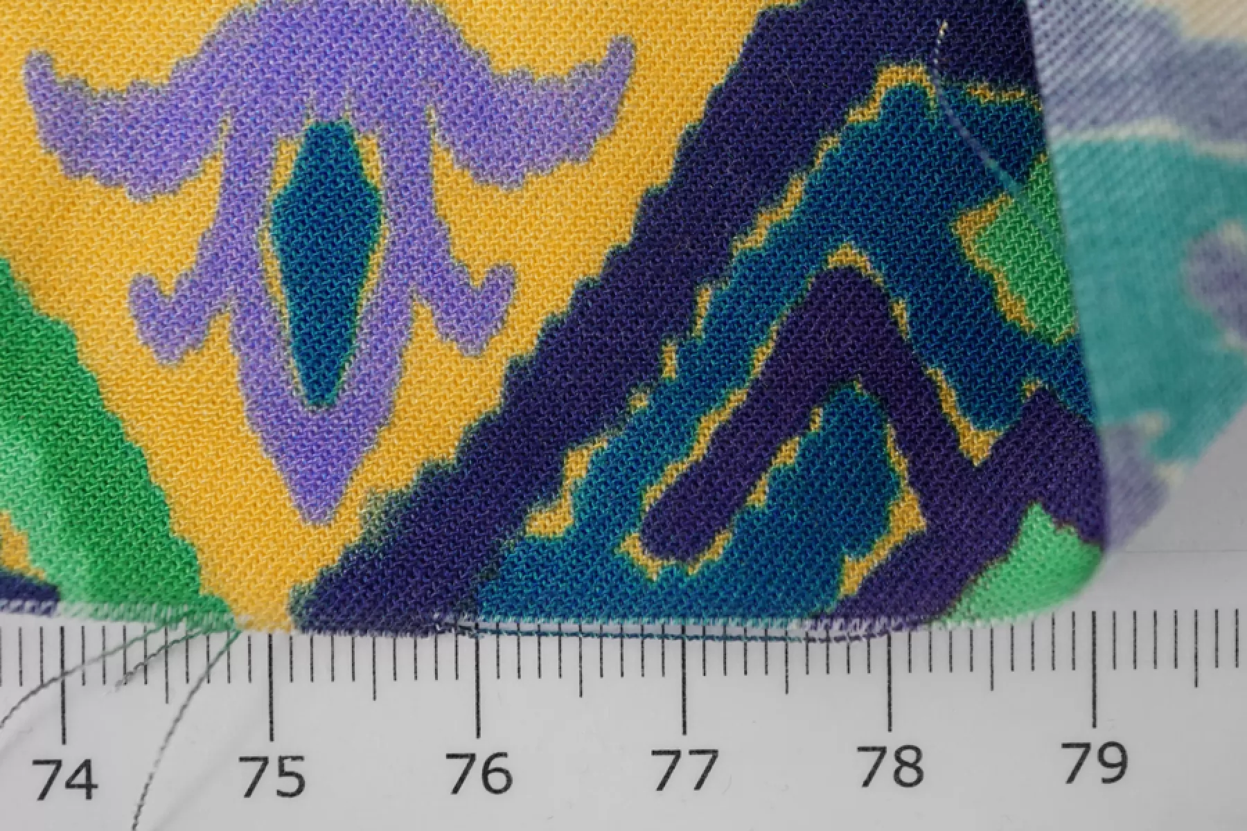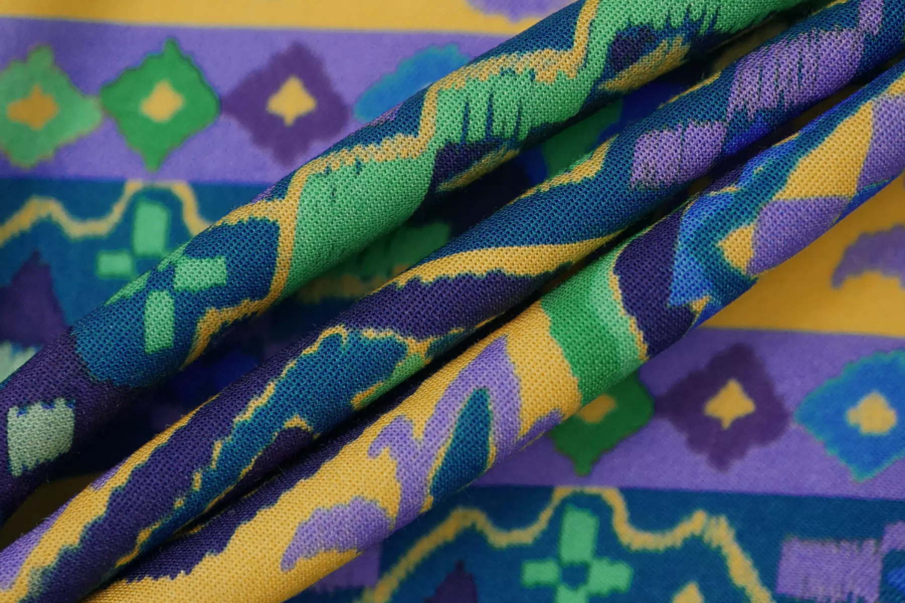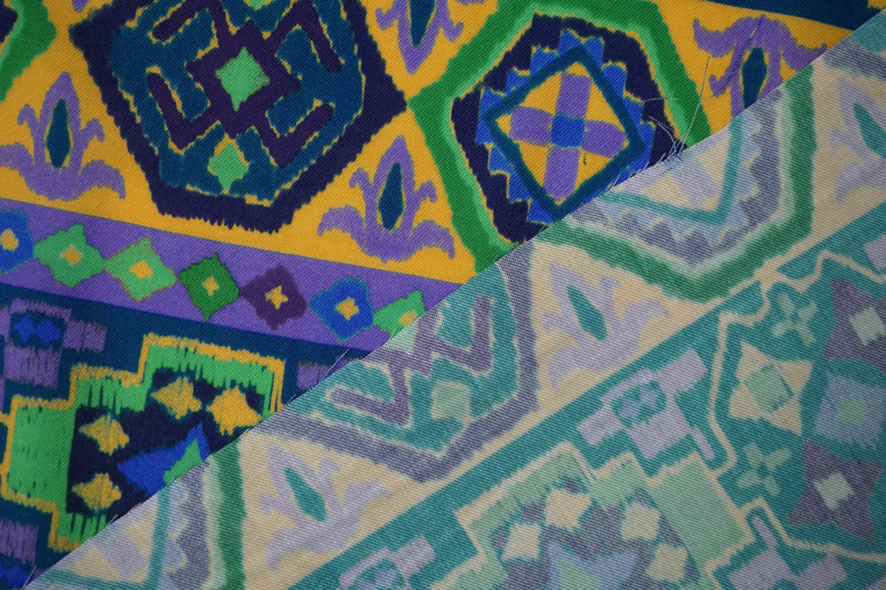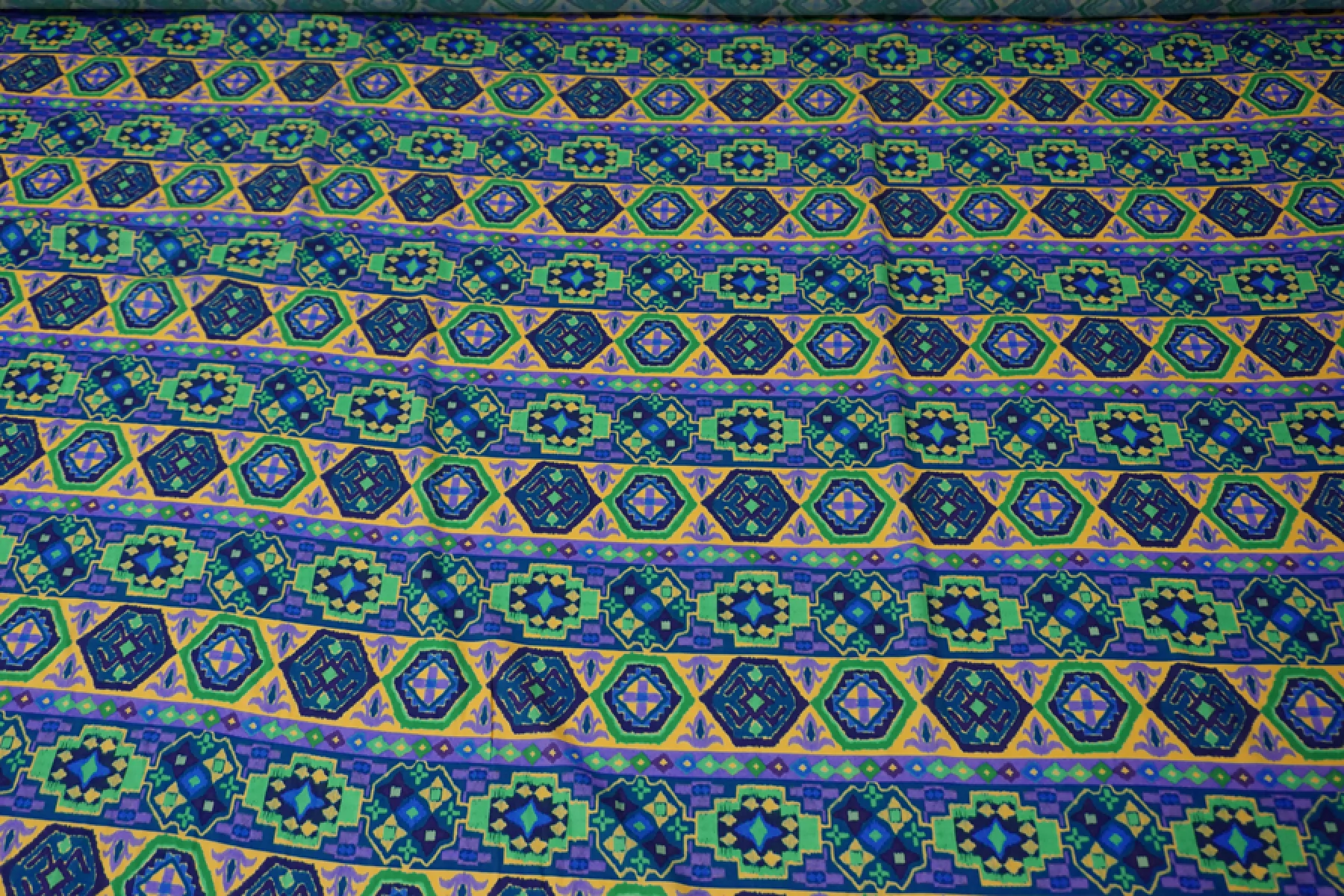Плательная вискоза диагонального плетения с повторяющимися полосами орнамента в оттенках желтого, сиреневого, зеленого и синего. Материал мягкий и очень приятный. Отлично тянется за счет эластана. Слегка просвечивает силуэт, если смотреть прямо на просвет. Форму не держит. Немного мнется. Используем на платье, блузку или юбку. Обязательно учитывайте усадку 5-10%.