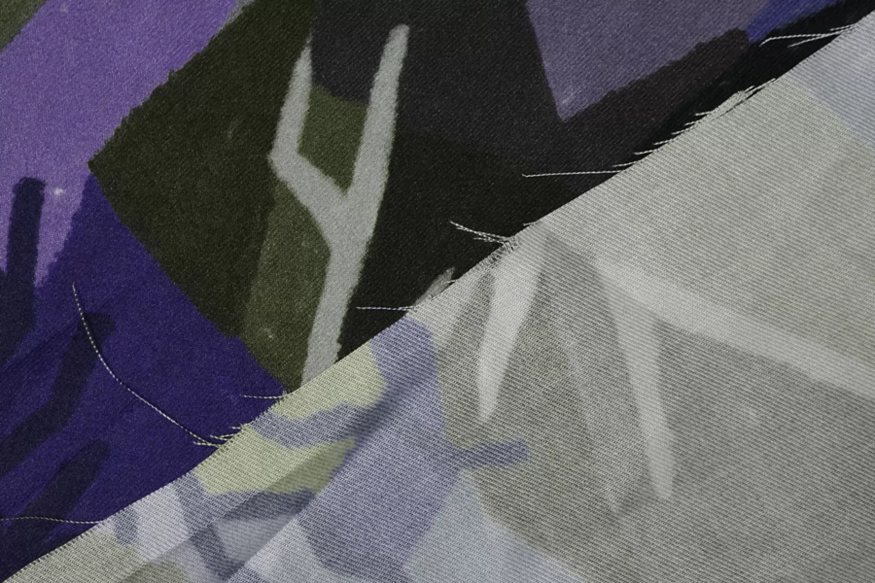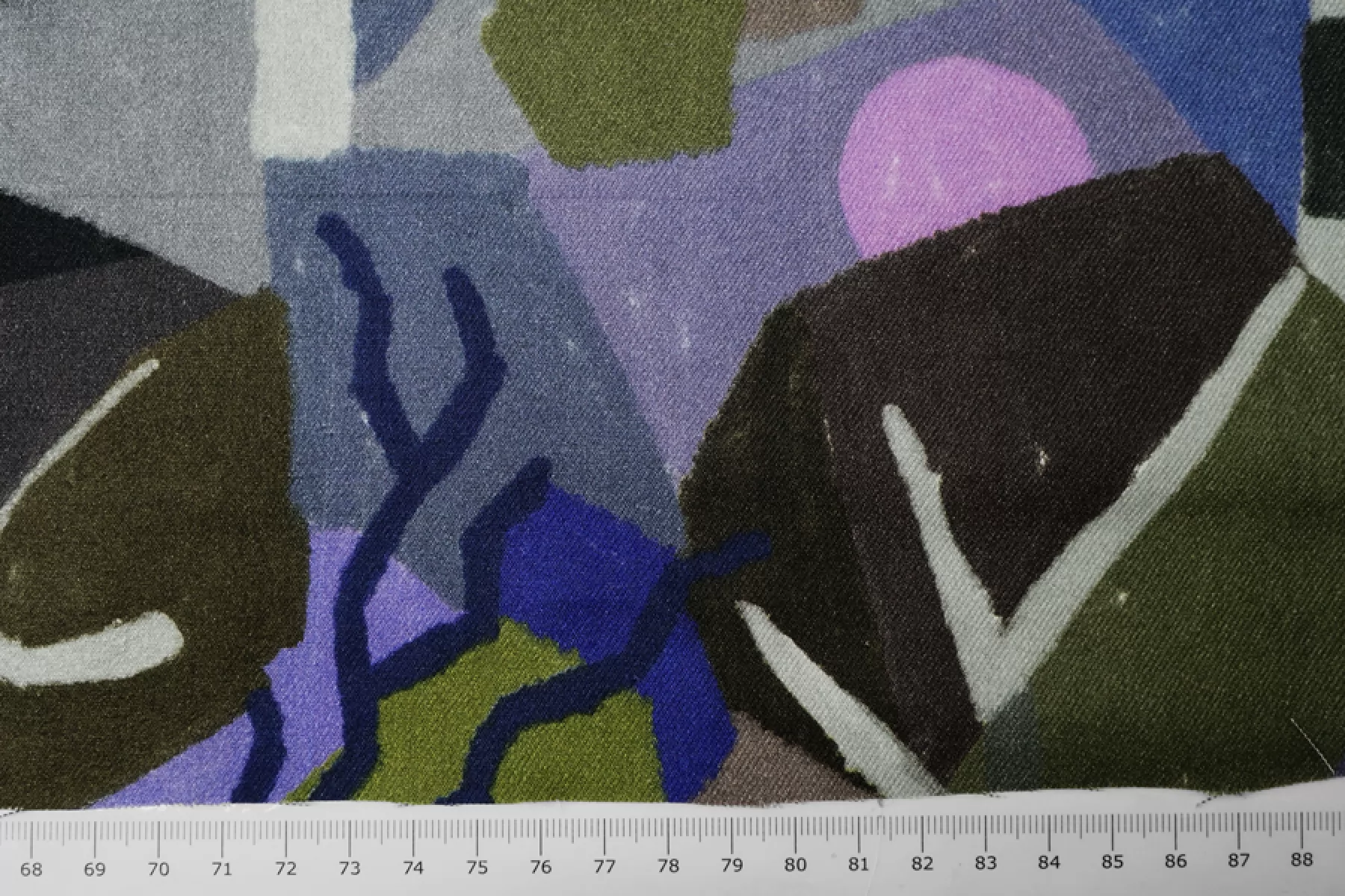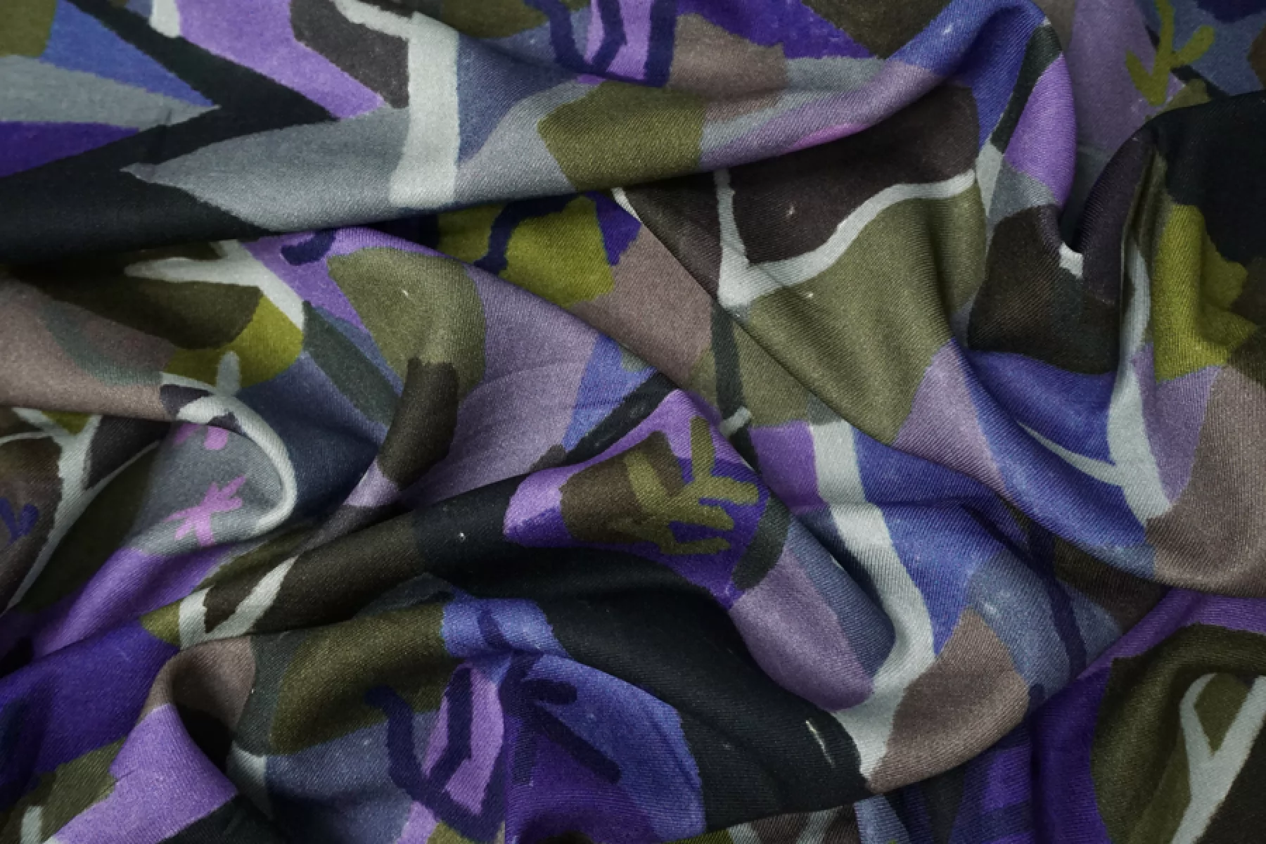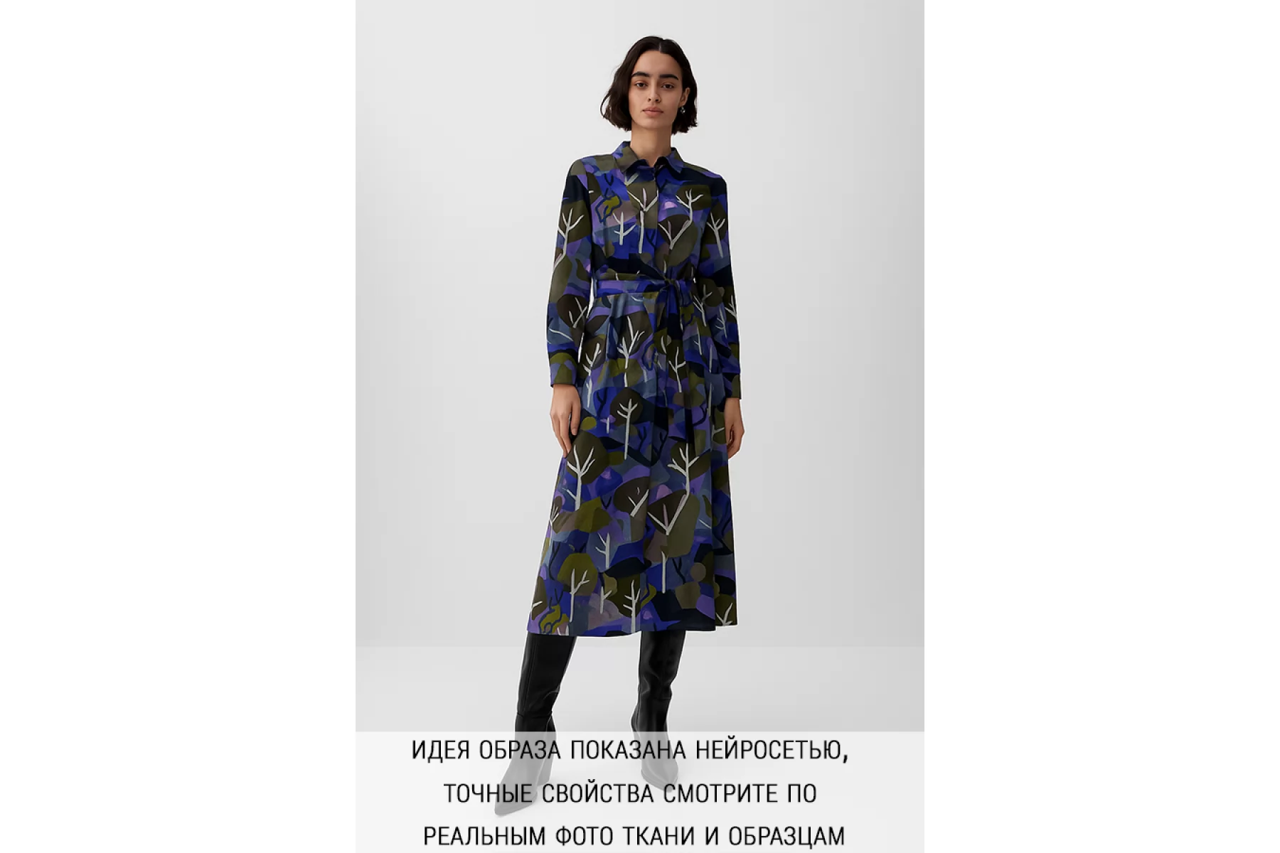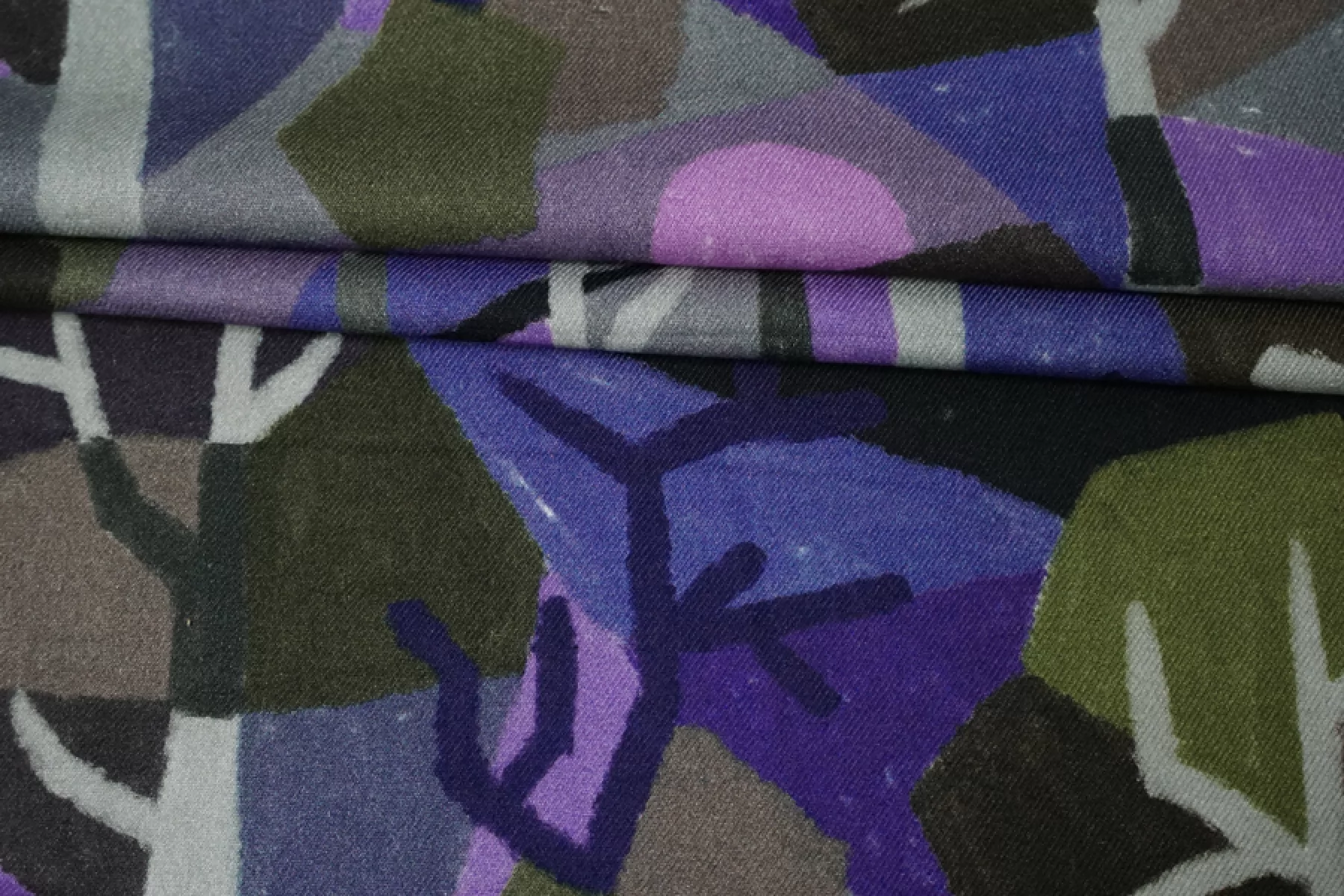 Вискозный твил с абстрактным рисунком леса в оттенках хаки, фиолетового, черного, синего и серого. Смотрится очень необычно и интересно! Материал тактильно очень приятный, мягкий. Струящийся. Не просвечивает, не тянется, немного держит форму. Сминается, но восстанавливается практически полностью. Вариант на рубашки, платья, юбки и не только. Обязательно учитывайте усадку 5-10%