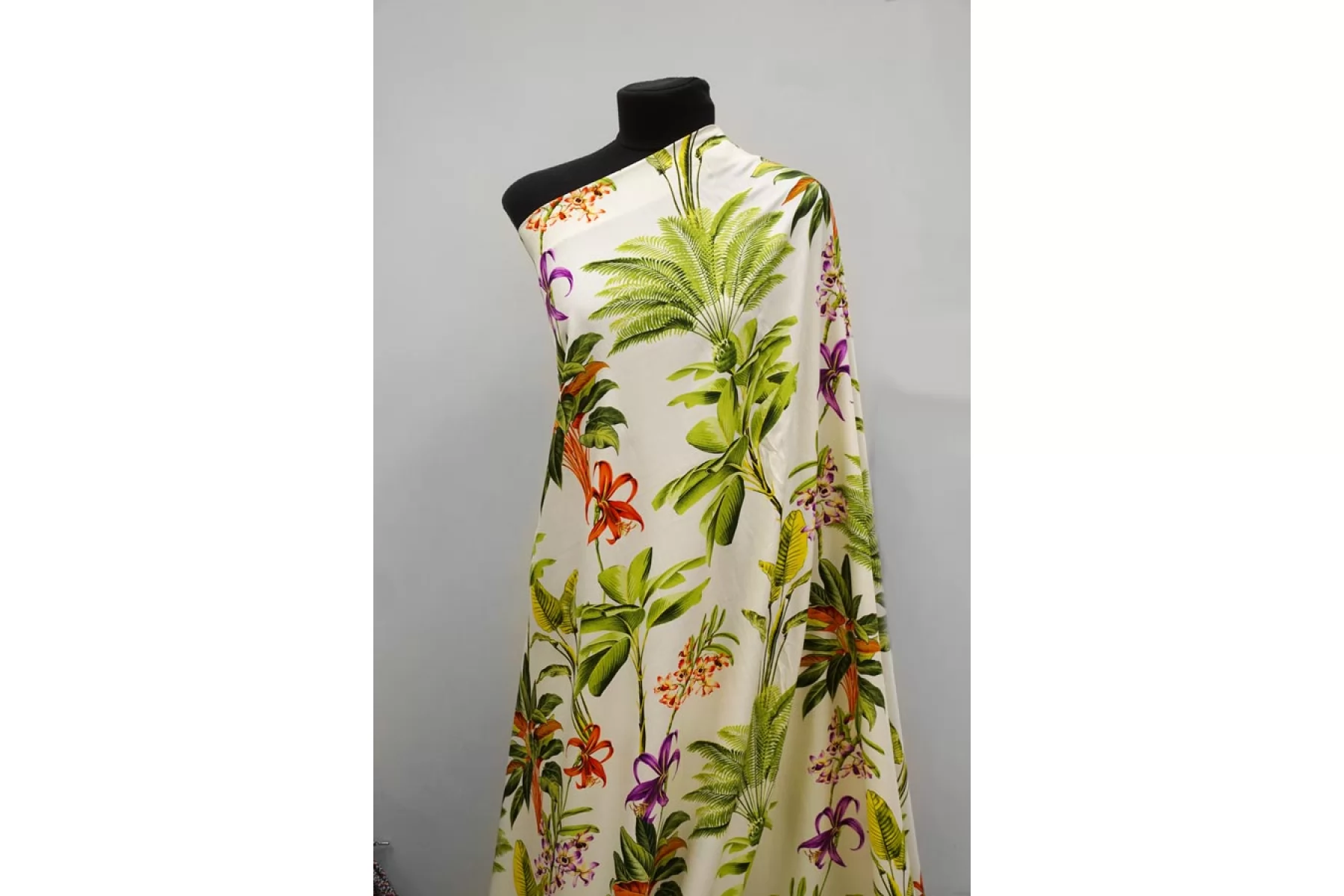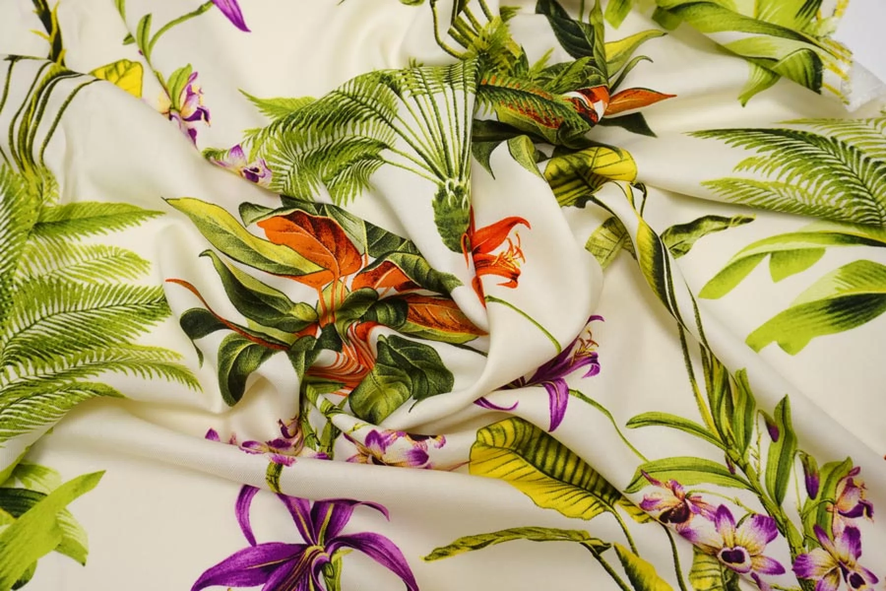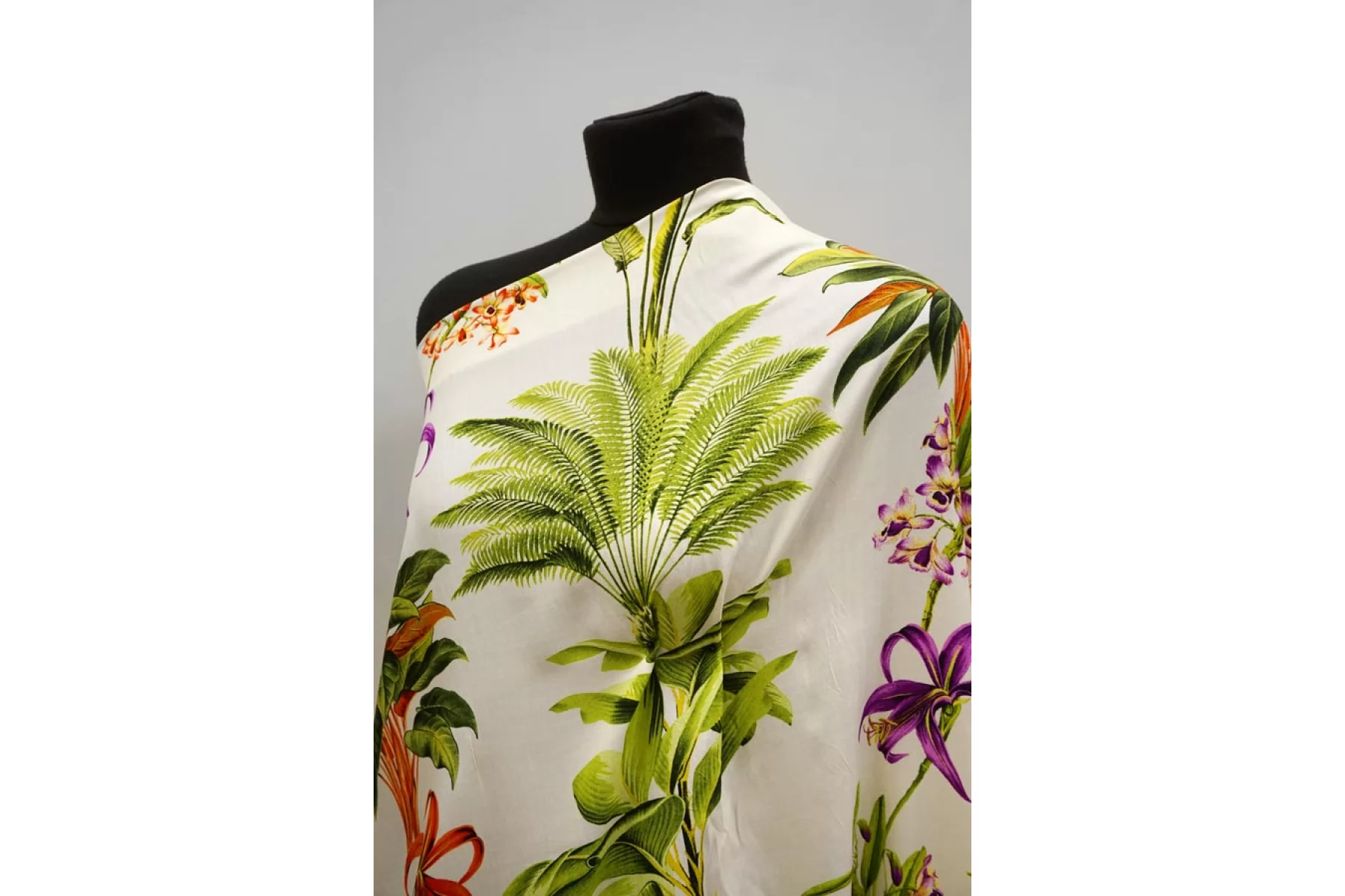 Красивая плательная вискоза твилового (диагонального) плетения, с принтом в виде тропических цветов на молочном фоне. Гладкая, мягкая, приятная тактильно. Пластичная. Немного просвечивает силуэт. Не тянется. Немного мнется. Красива в движении. Форму не держит. Прекрасно подойдет на платья, блузки, юбки. При необходимости используйте подкладочный материал. Обязательно учитывайте усадку порядка 5-10%.