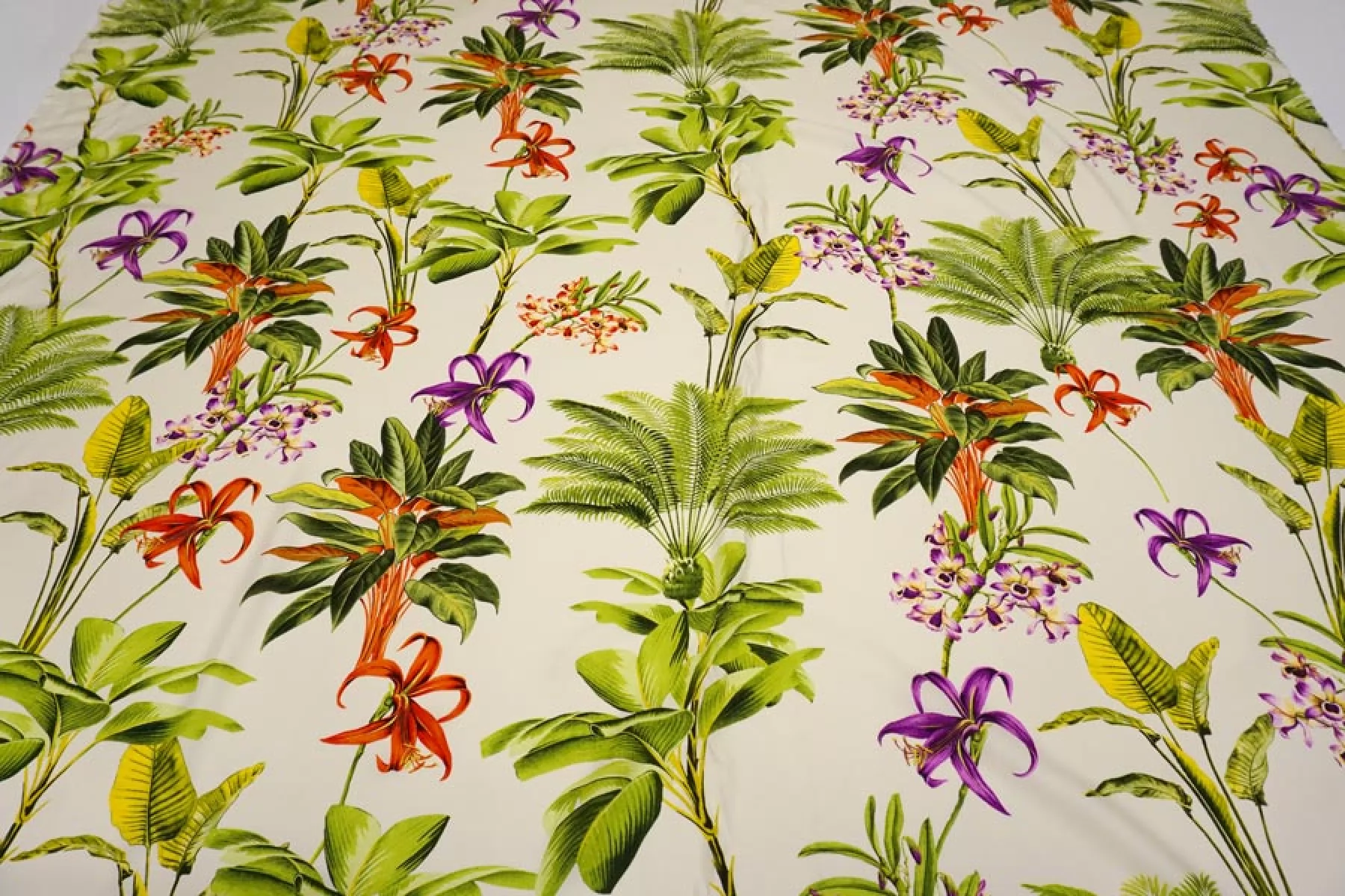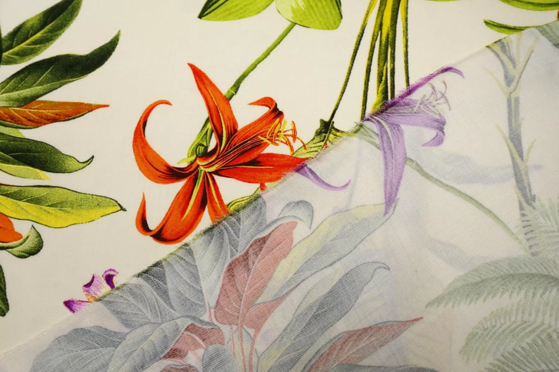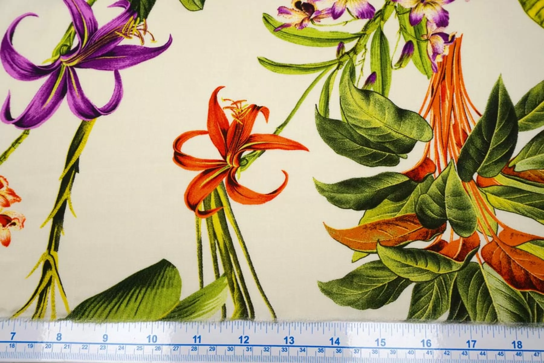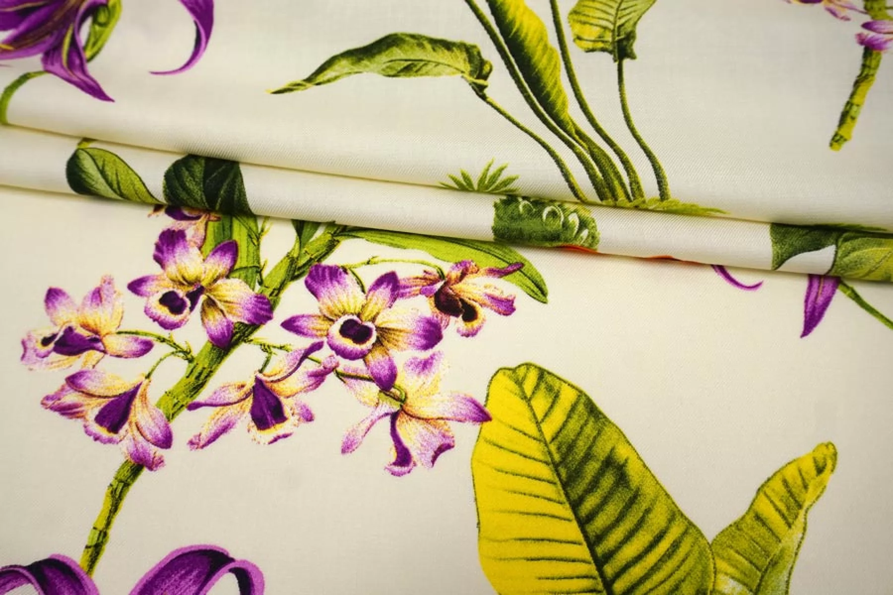 Красивая плательная вискоза твилового (диагонального) плетения, с принтом в виде тропических цветов на молочном фоне. Гладкая, мягкая, приятная тактильно. Пластичная. Немного просвечивает силуэт. Не тянется. Немного мнется. Красива в движении. Форму не держит. Прекрасно подойдет на платья, блузки, юбки. При необходимости используйте подкладочный материал. Обязательно учитывайте усадку порядка 5-10%.