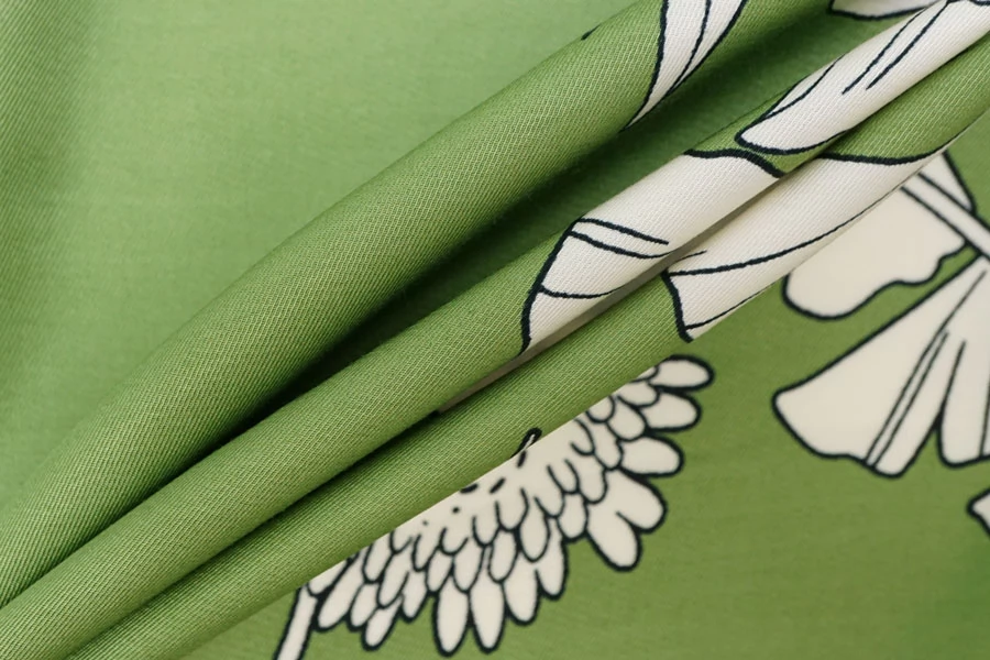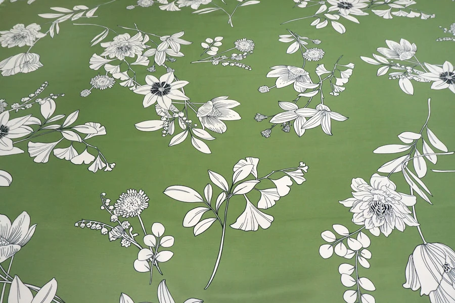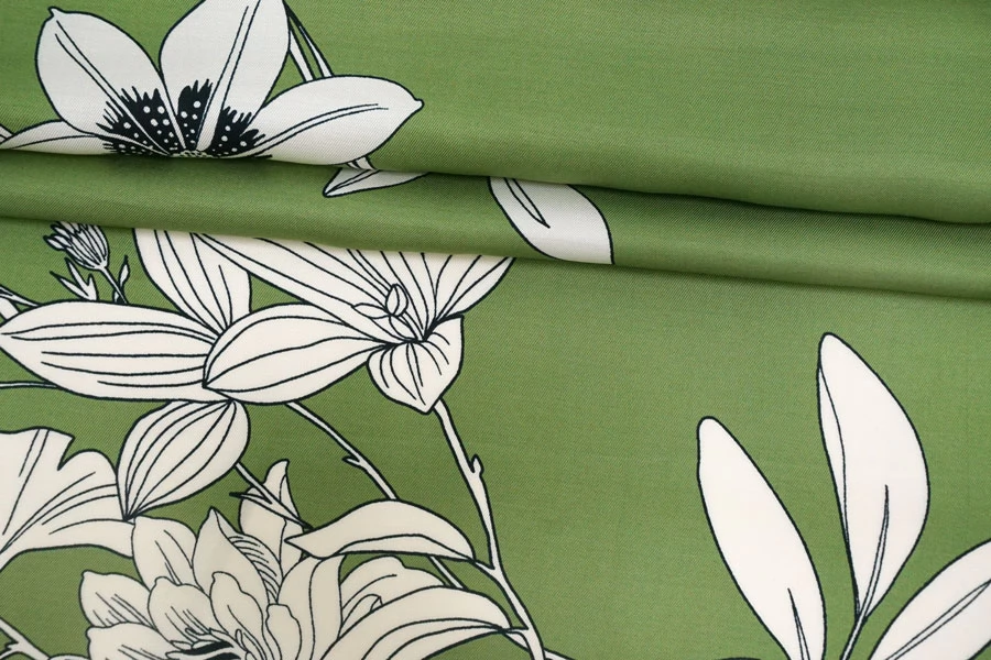 Красивая плательная вискоза твилового (диагонального) плетения от бренда Max Mara, с белым цветочным принтом на зелёном фоне. Гладкая, мягкая, приятная тактильно. Пластичная. Немного просвечивает силуэт. Не тянется. Немного мнется. Красива в движении. Форму не держит. Прекрасно подойдет на платья, блузки, юбки и костюмы в пижамном стиле. При необходимости используйте подкладочный материал. Обязательно учитывайте усадку порядка 5-10%.