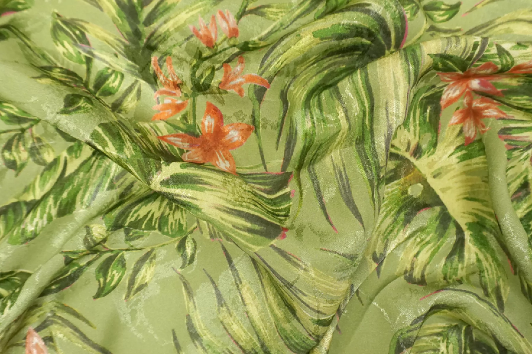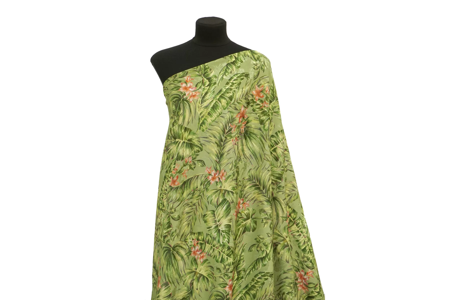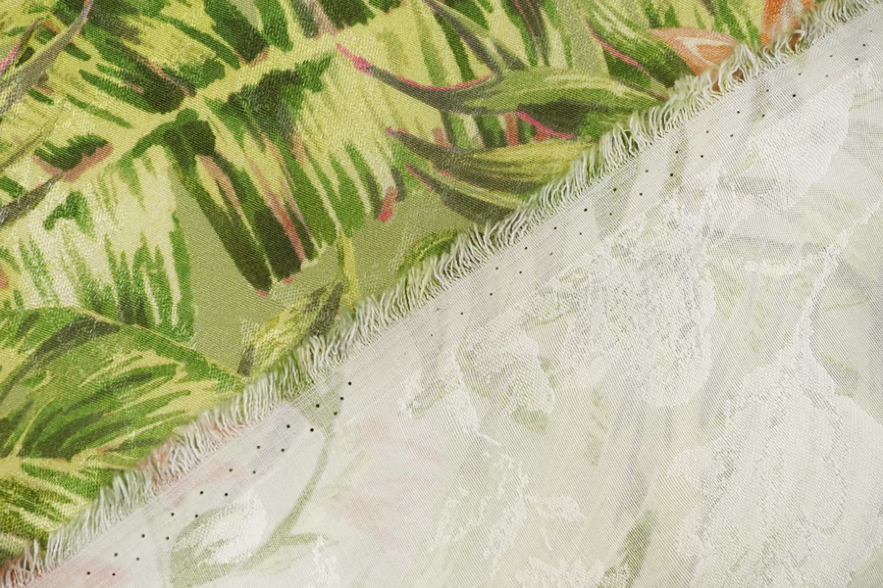 Вискозное полотно с цветочной жаккардовой выработкой, у которой есть легкий лоск, и достаточно крупным принтом в виде цветов и листьев. Материал фисташково-зеленого оттенка в основе и принт в зелено-терракотовой цветовой гамме. Вискоза приятная, мягкая. Тонкая, но плотная. Слегка просвечивает силуэт на просвет. Немного держит форму и красиво смотрится в складках и движении, практически не мнется. Не тянется. Шьем платья, блузки, юбки и изделия в бельевом стиле. Обязательно учитывайте усадку 5-10% . При необходимости используйте подкладочный материал.
