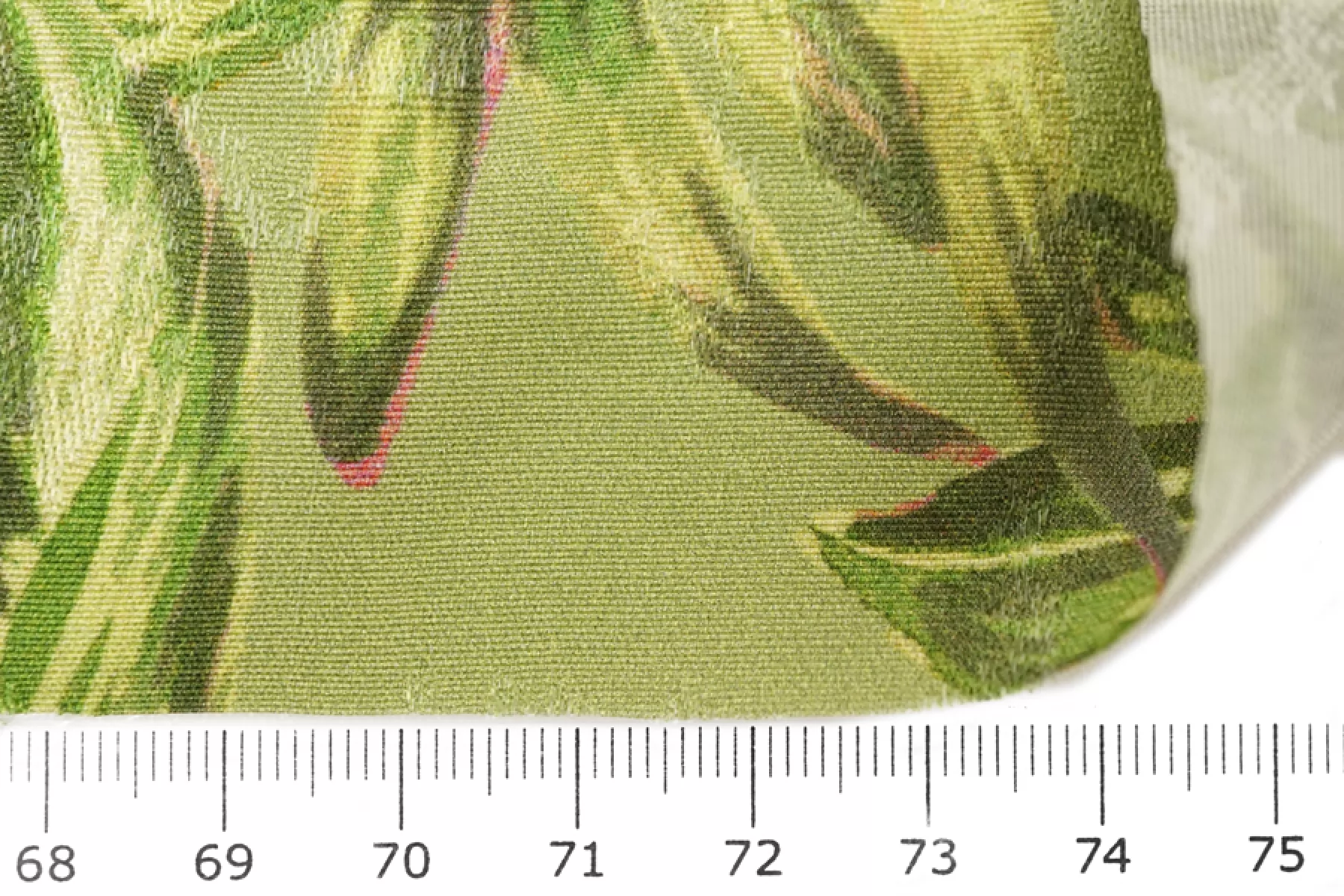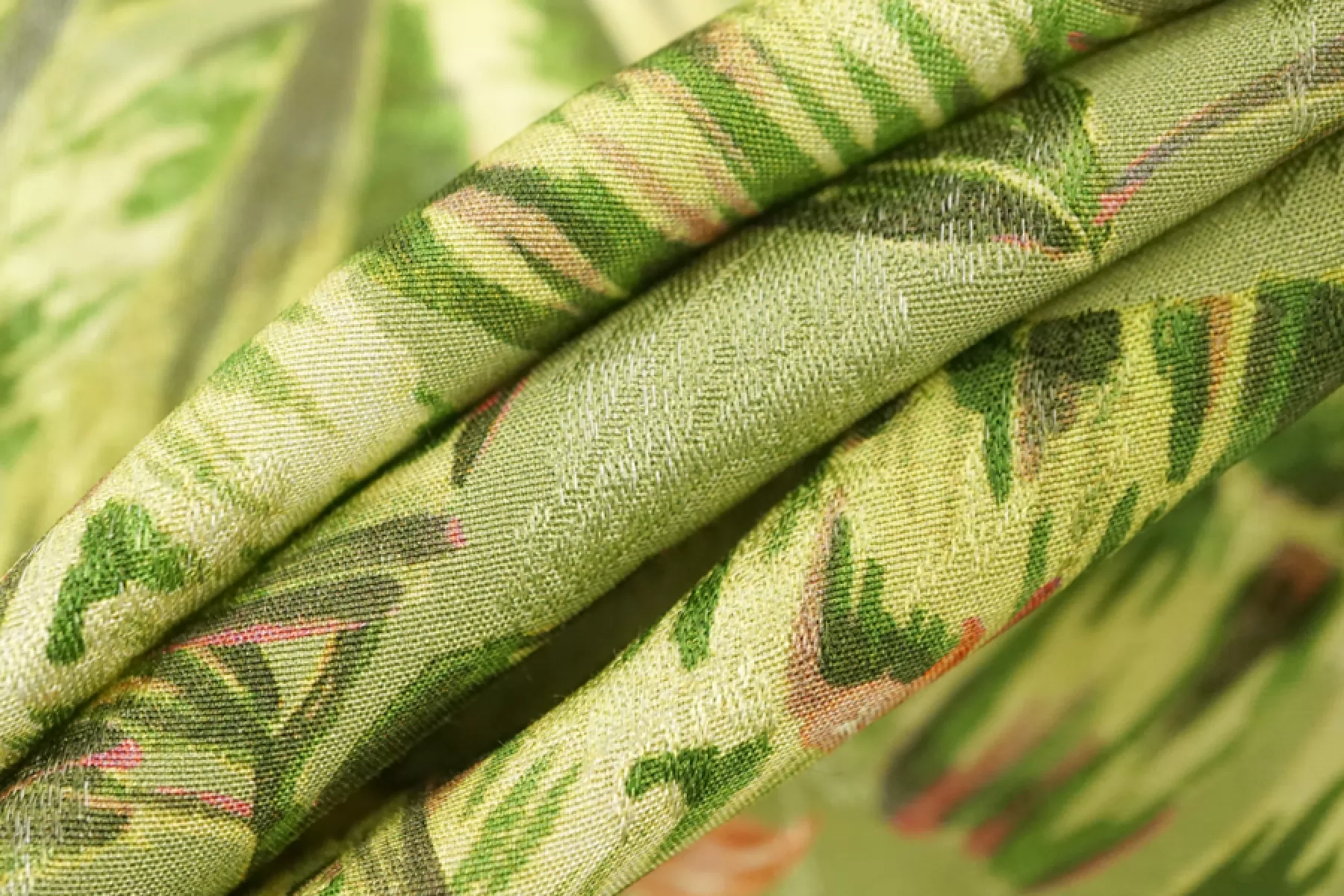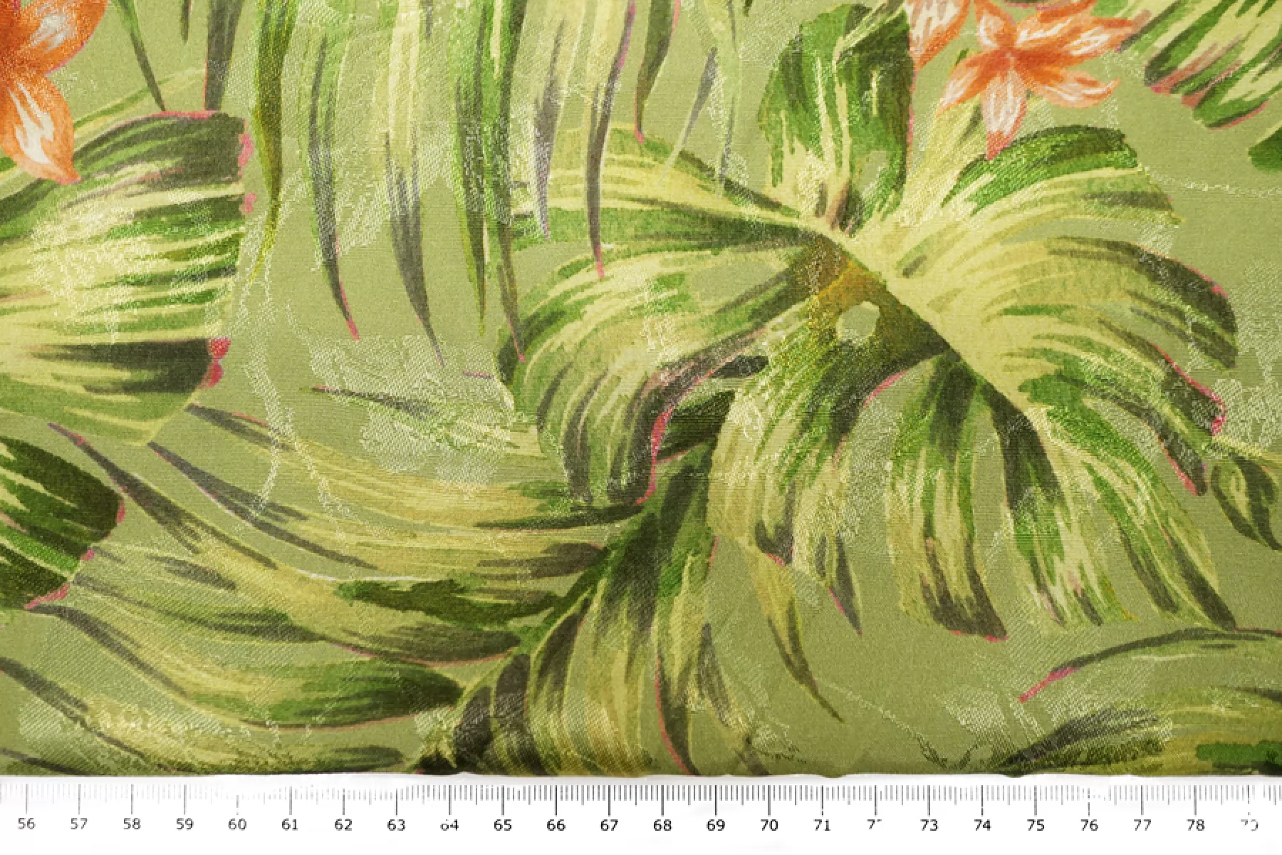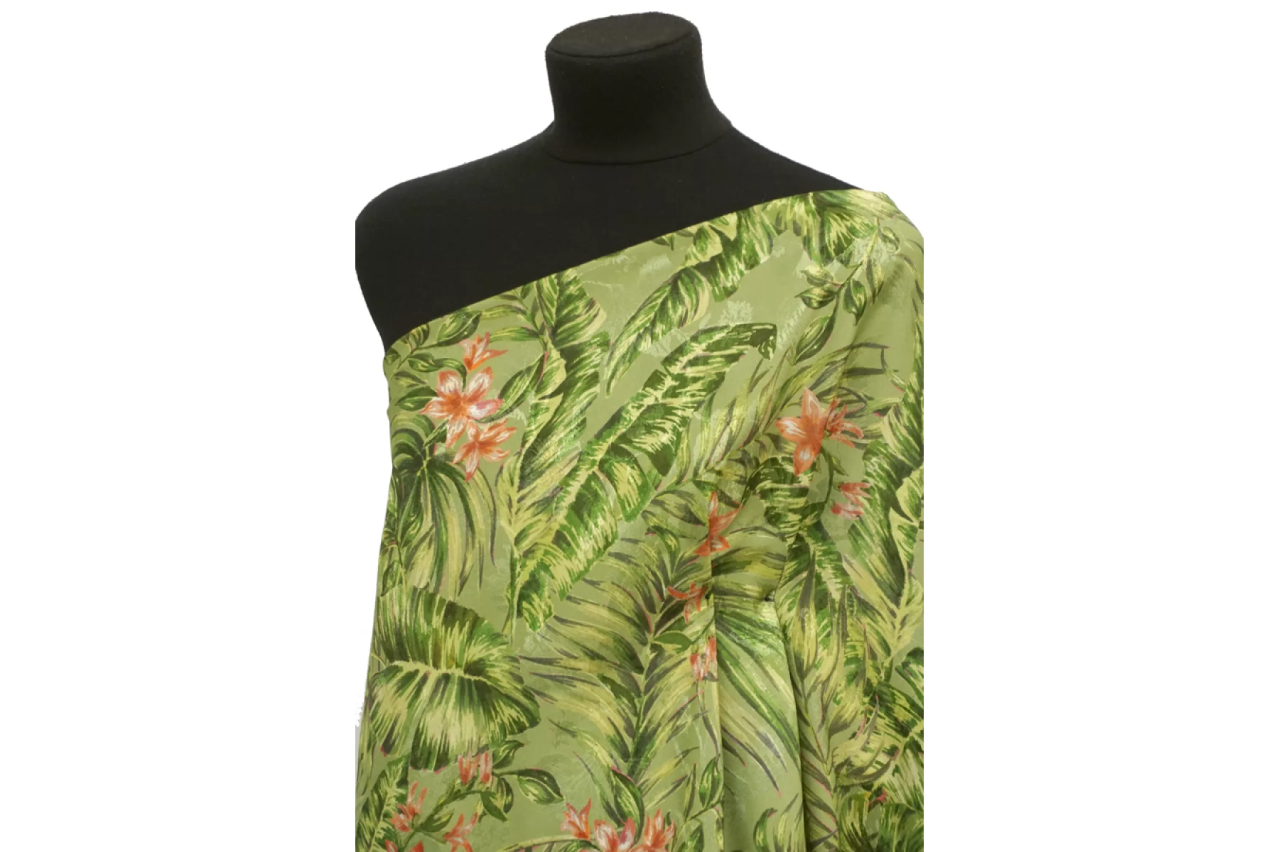 Вискозное полотно с цветочной жаккардовой выработкой, у которой есть легкий лоск, и достаточно крупным принтом в виде цветов и листьев. Материал фисташково-зеленого оттенка в основе и принт в зелено-терракотовой цветовой гамме. Вискоза приятная, мягкая. Тонкая, но плотная. Слегка просвечивает силуэт на просвет. Немного держит форму и красиво смотрится в складках и движении, практически не мнется. Не тянется. Шьем платья, блузки, юбки и изделия в бельевом стиле. Обязательно учитывайте усадку 5-10% . При необходимости используйте подкладочный материал.