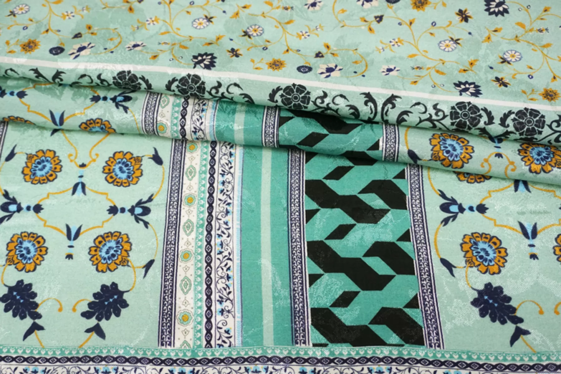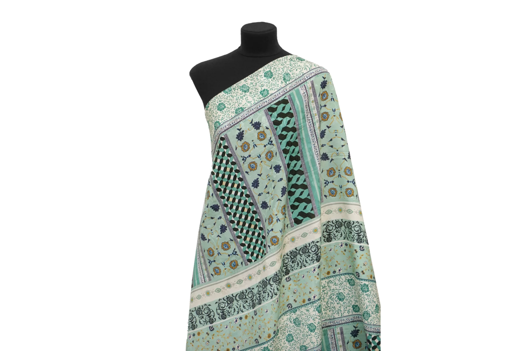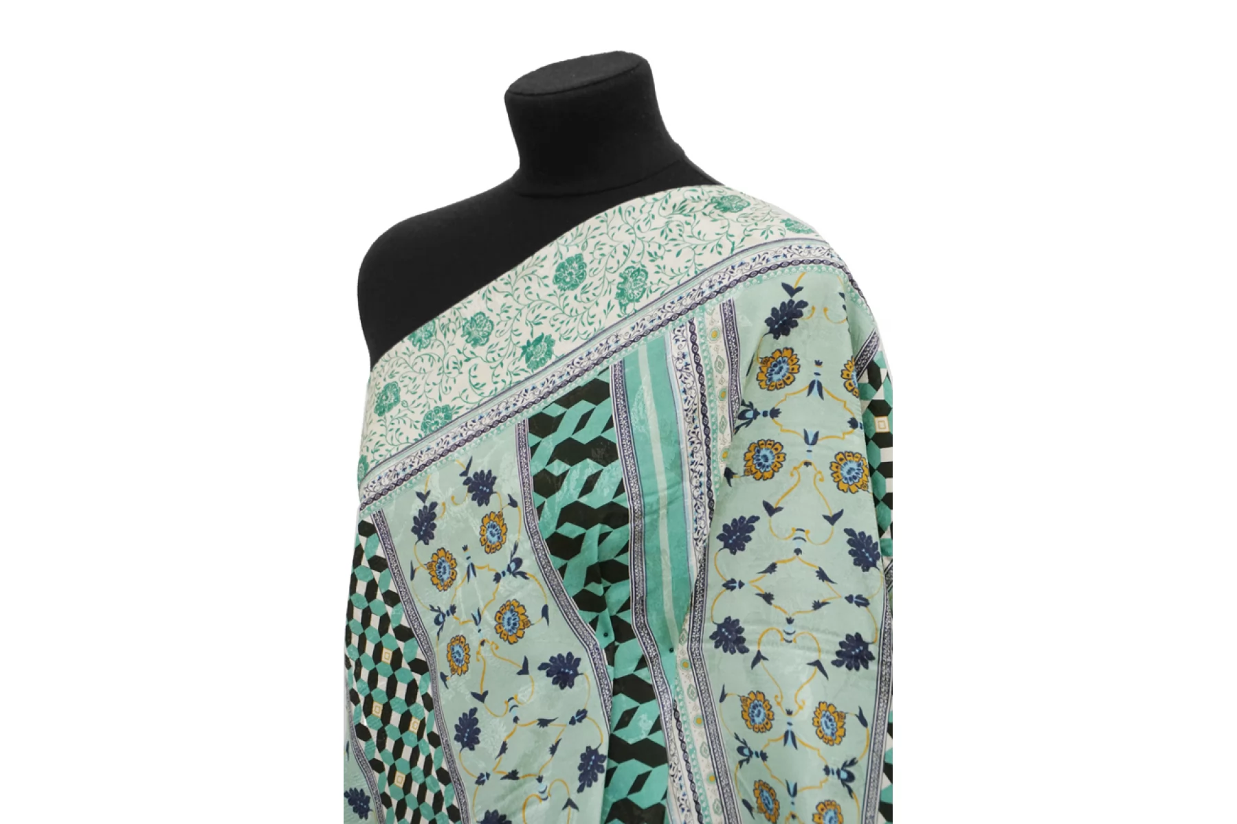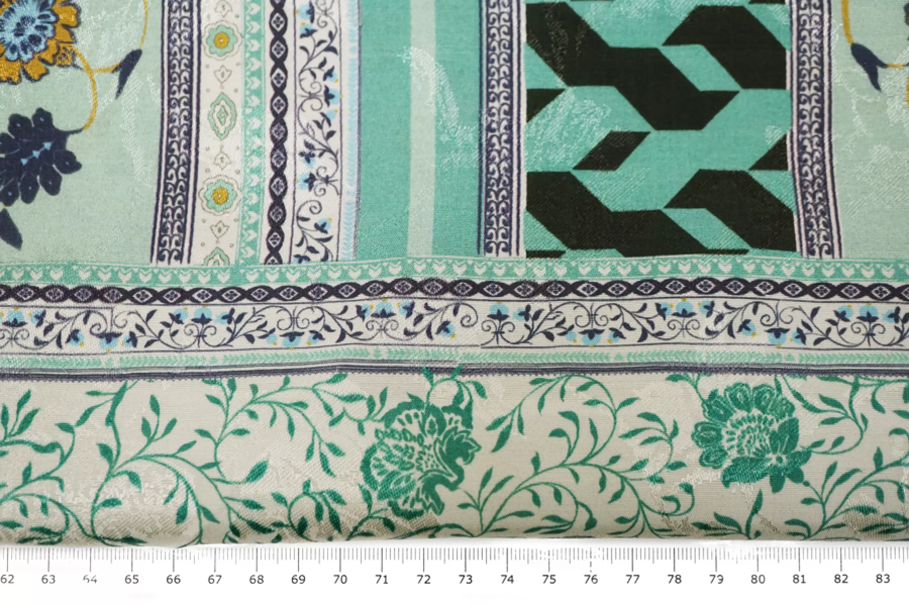 ВНИМАНИЕ! Ткань купонная, длина купона 72 см, цена за купон - 1 216 руб. Жаккардовая вискоза приятного мятного оттенка с принтом в виде орнамента, геометрии и цветов в молочных, горчичный, бирюзовых и синих оттенках. Тактильно приятная, с красивой пластикой. Выработка обладает приятным лоском. Просвечивает силуэт, если смотреть прямо на просвет. Не тянется. Слегка держит форму. Красивый вариант на платья, блузки, платки и юбки. Обязательно учитывайте возможную усадку порядка 5-10%
