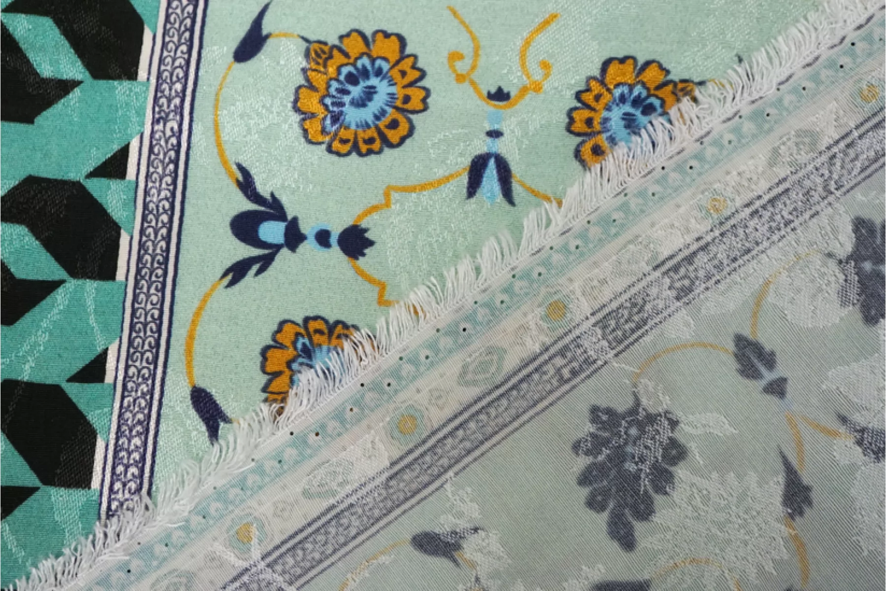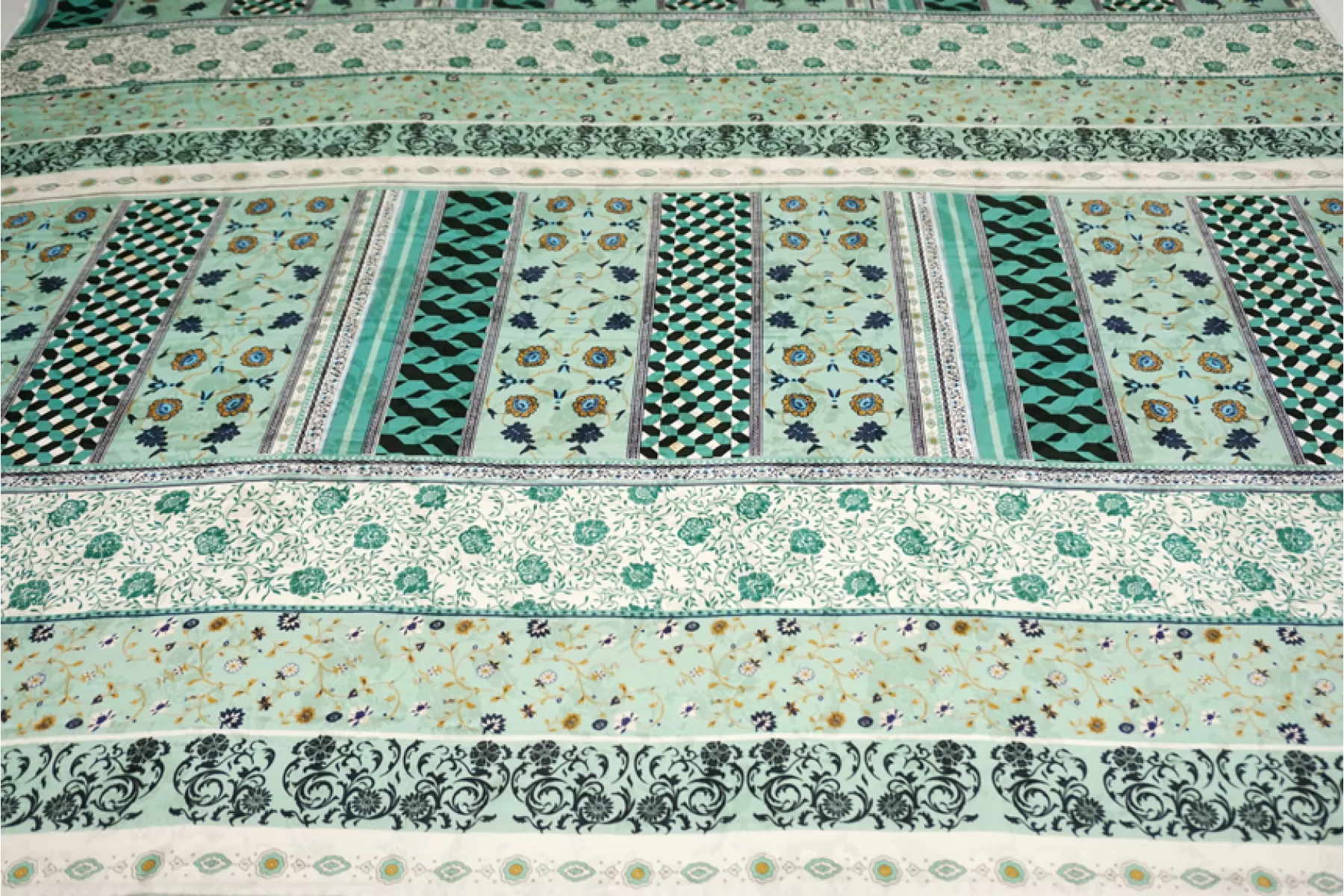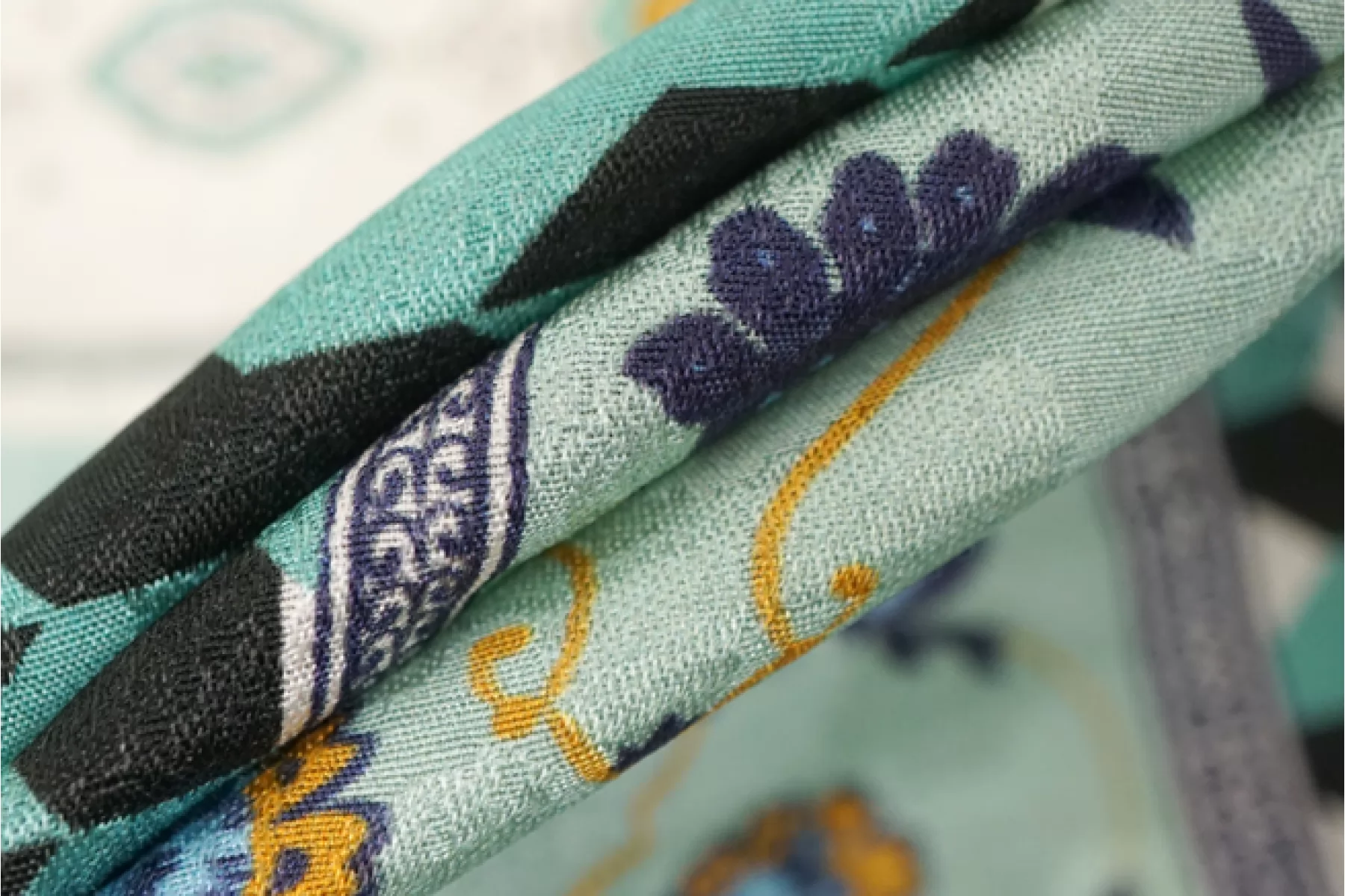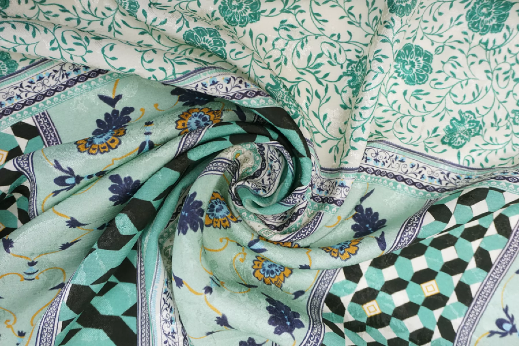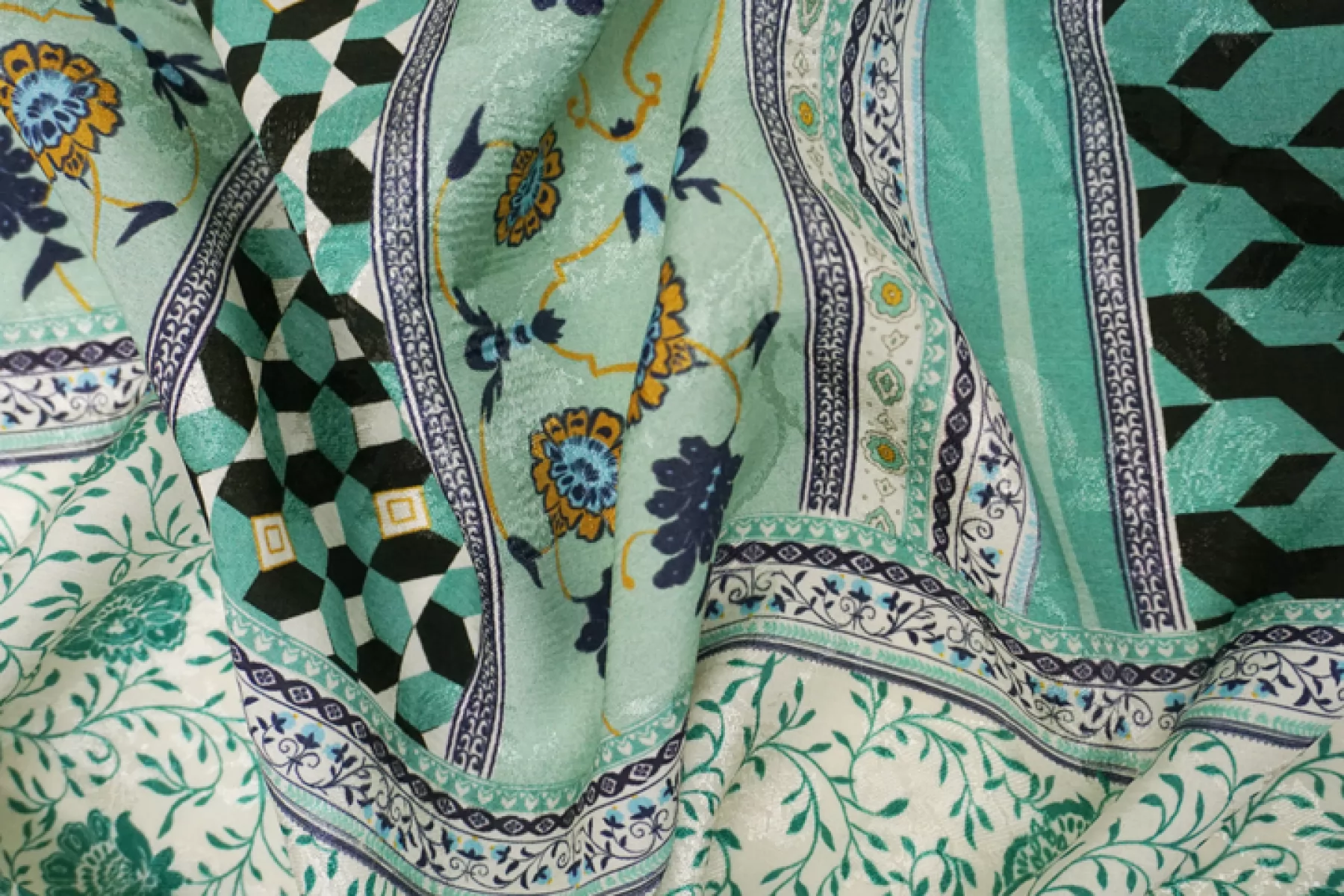 ВНИМАНИЕ! Ткань купонная, длина купона 72 см, цена за купон - 1 216 руб. Жаккардовая вискоза приятного мятного оттенка с принтом в виде орнамента, геометрии и цветов в молочных, горчичный, бирюзовых и синих оттенках. Тактильно приятная, с красивой пластикой. Выработка обладает приятным лоском. Просвечивает силуэт, если смотреть прямо на просвет. Не тянется. Слегка держит форму. Красивый вариант на платья, блузки, платки и юбки. Обязательно учитывайте возможную усадку порядка 5-10%