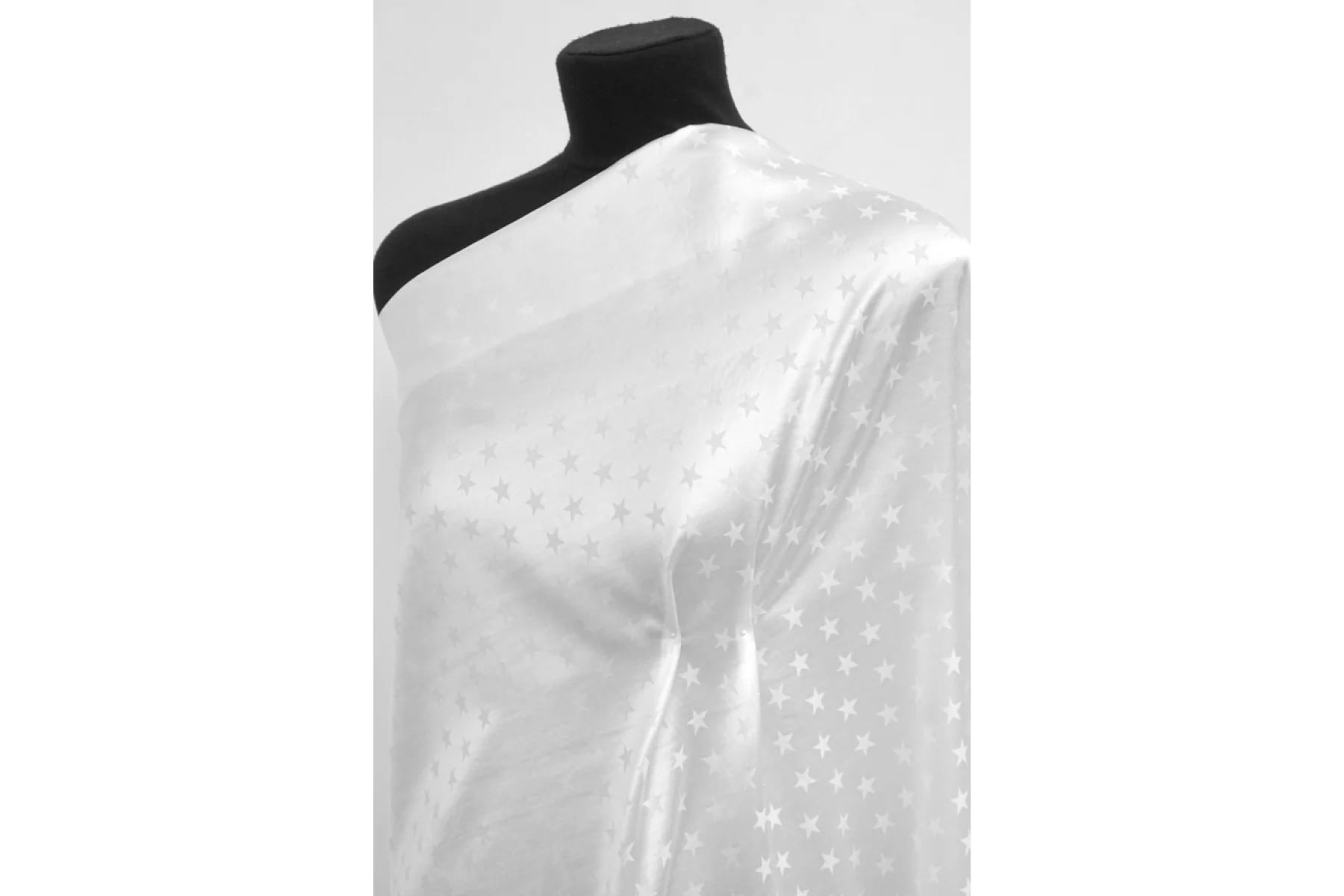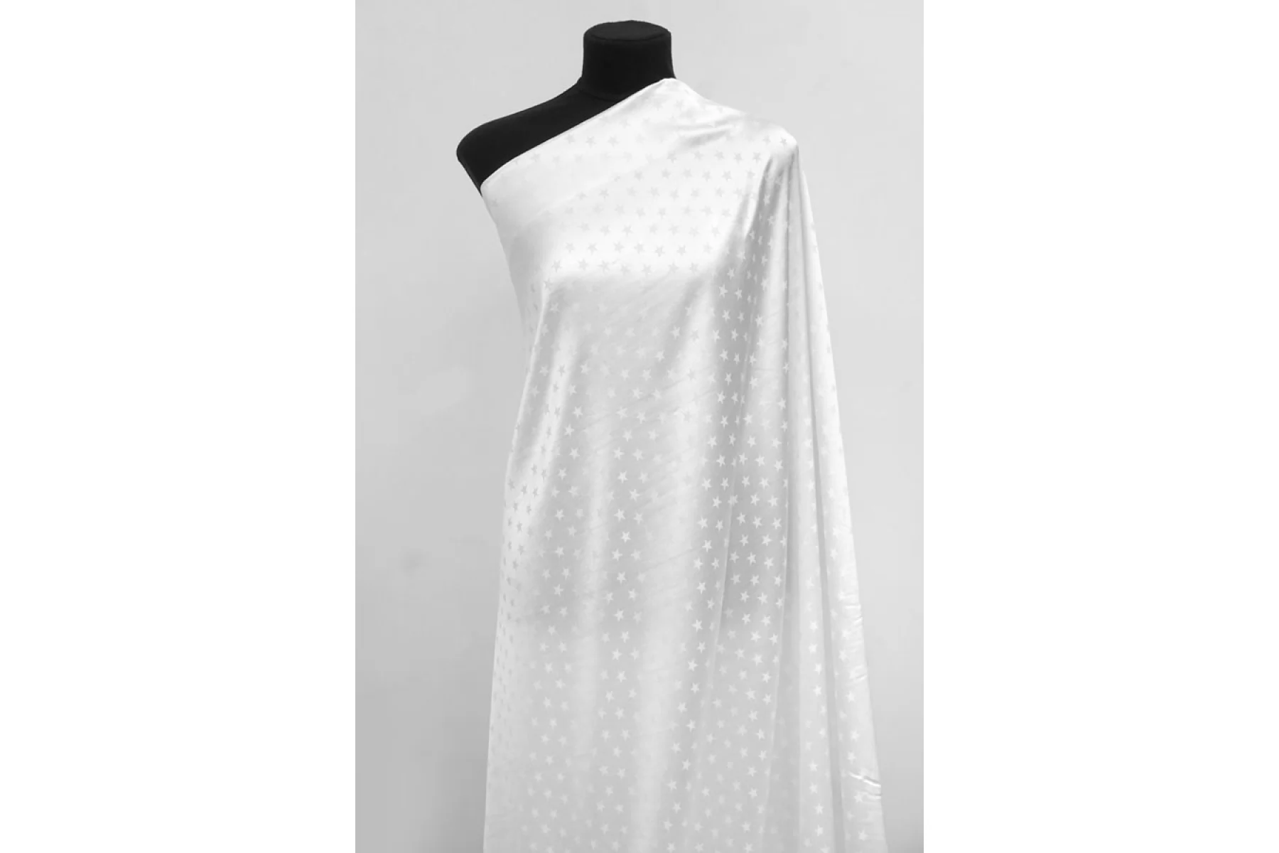 Очень красивая жаккардовая вискоза молочного оттенка с выработкой звезд (размер ~1,5 см). Тактильно приятная, гладкая и скользящая. Обладает атласным блеском. Мягкая. Форму держит слабо, но красива в складке и пластике. Сминается, но частично восстанавливается. Не тянется. Просвечивает силуэт темного. Красиво струится. Вариант на платья, юбки, блузки и одежду в бельевом стиле. При необходимости используйте подкладочный материал. Обязательно учитывайте усадку 5-10%.
