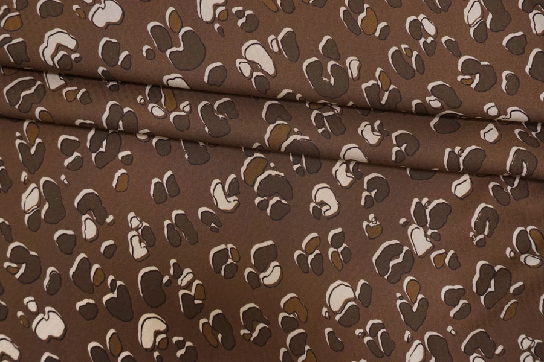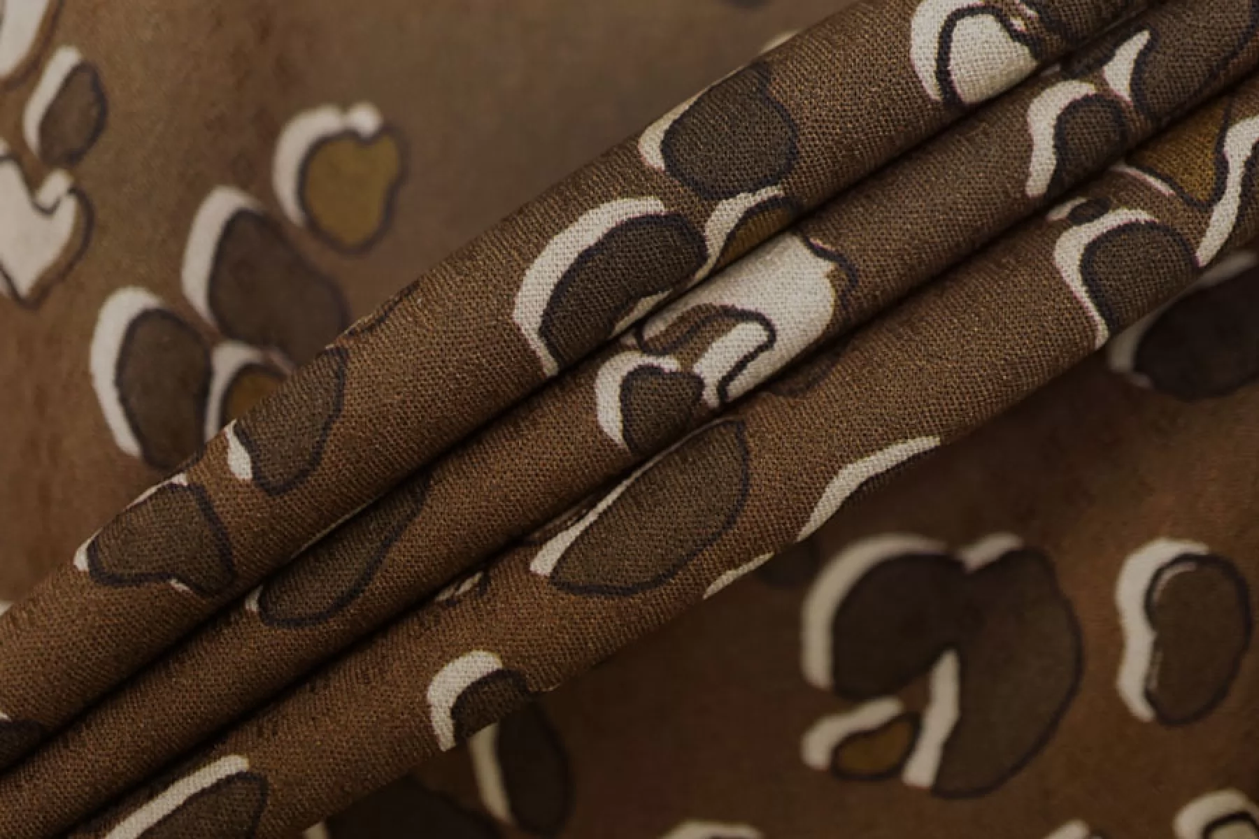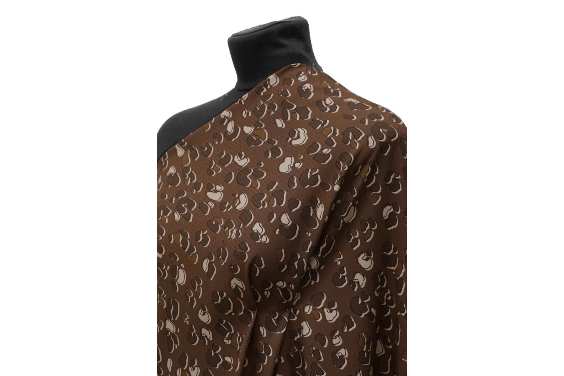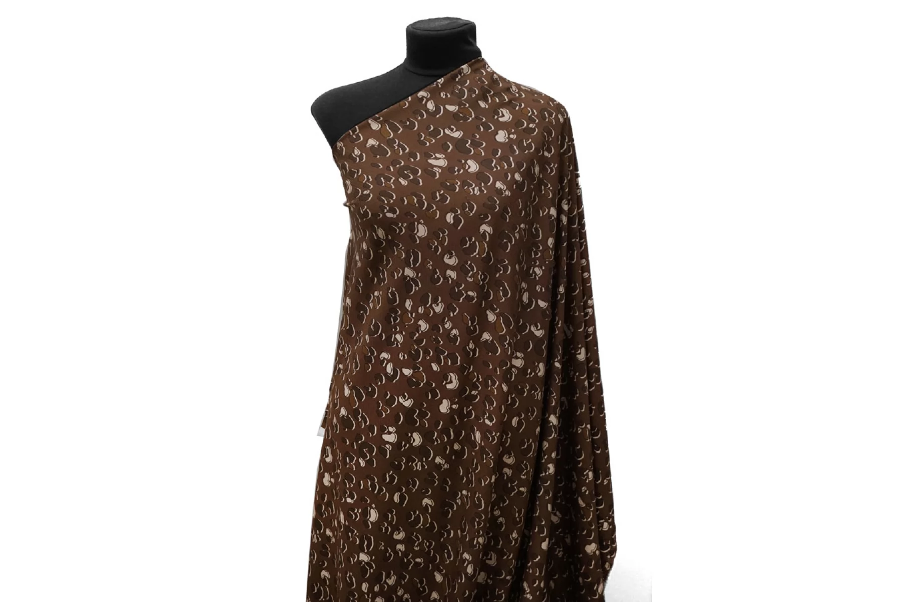 Прекрасная плательная вискоза жаккардового плетения, с пятнистым принтом на коричневом фоне. Материал тактильно очень приятный и мягкий. Жаккардовая выработка практически не ощущается. Материал тонкий, немного просвечивает если смотреть насквозь в один слой. Немного мнется. Легкий, струящийся и летящий. Отлично подойдет на легкие летние платья, блузки и, особенно, варианты одежды в бельевом стиле. При необходимости используйте подкладочный материал. Обязательно учитываем усадку порядка 5-10%. При пошиве используйте тонкие иглы и булавки.
