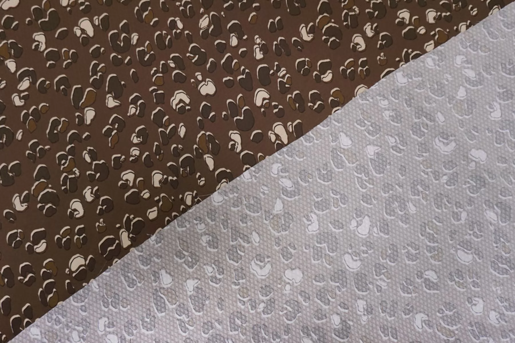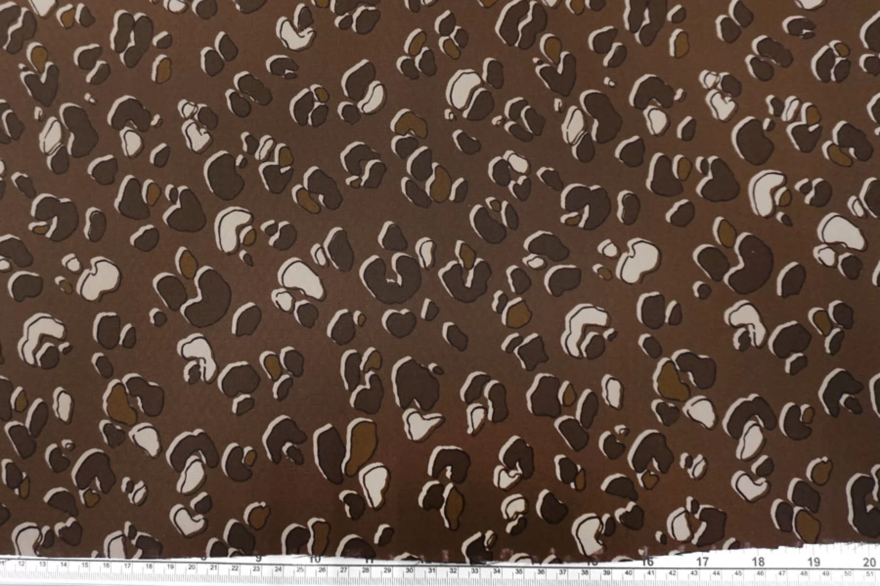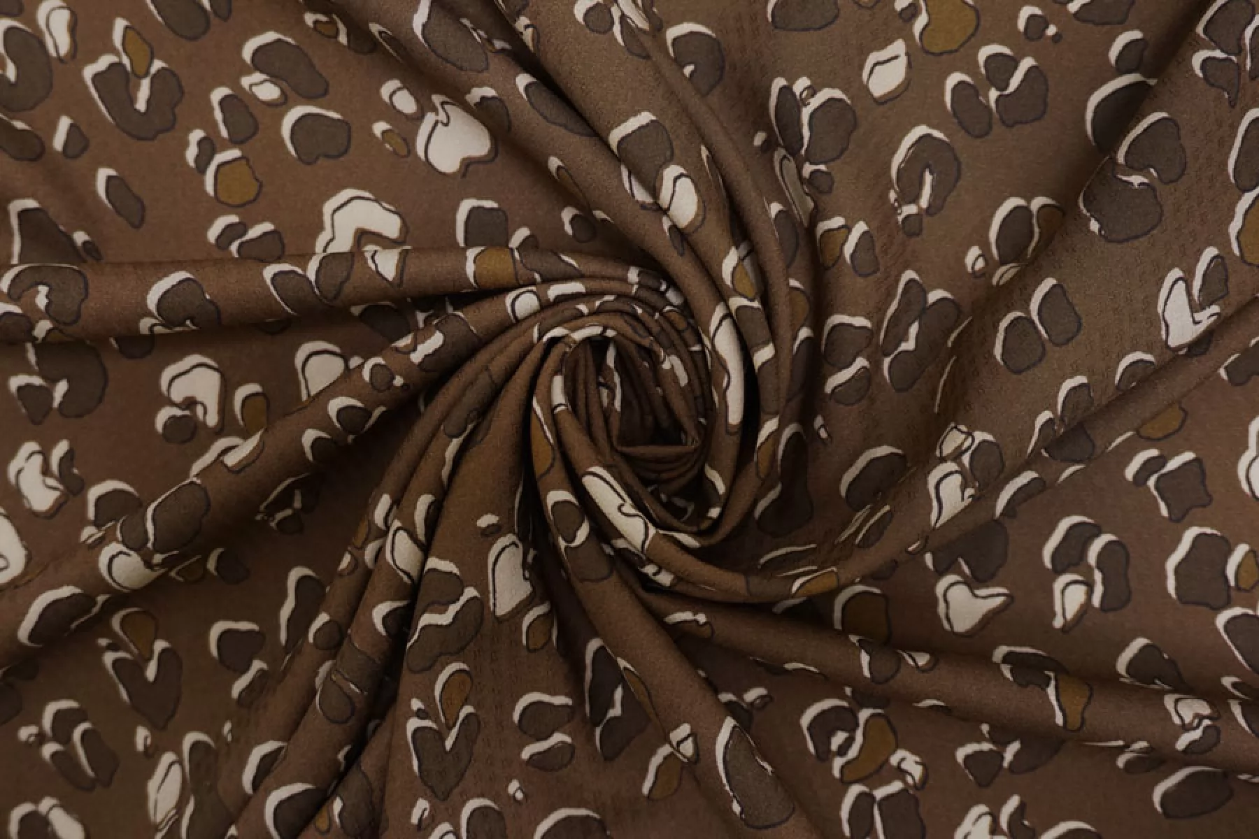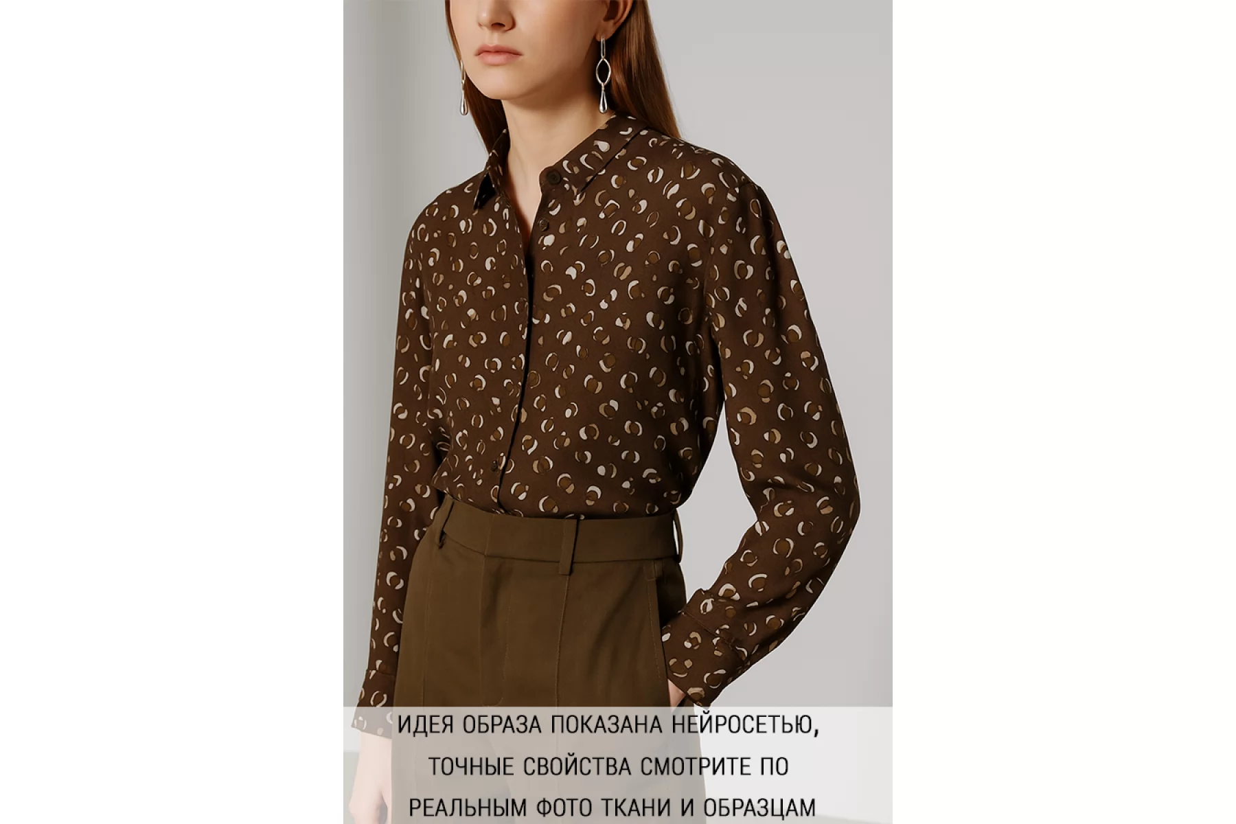 Прекрасная плательная вискоза жаккардового плетения, с пятнистым принтом на коричневом фоне. Материал тактильно очень приятный и мягкий. Жаккардовая выработка практически не ощущается. Материал тонкий, немного просвечивает если смотреть насквозь в один слой. Немного мнется. Легкий, струящийся и летящий. Отлично подойдет на легкие летние платья, блузки и, особенно, варианты одежды в бельевом стиле. При необходимости используйте подкладочный материал. Обязательно учитываем усадку порядка 5-10%. При пошиве используйте тонкие иглы и булавки.
