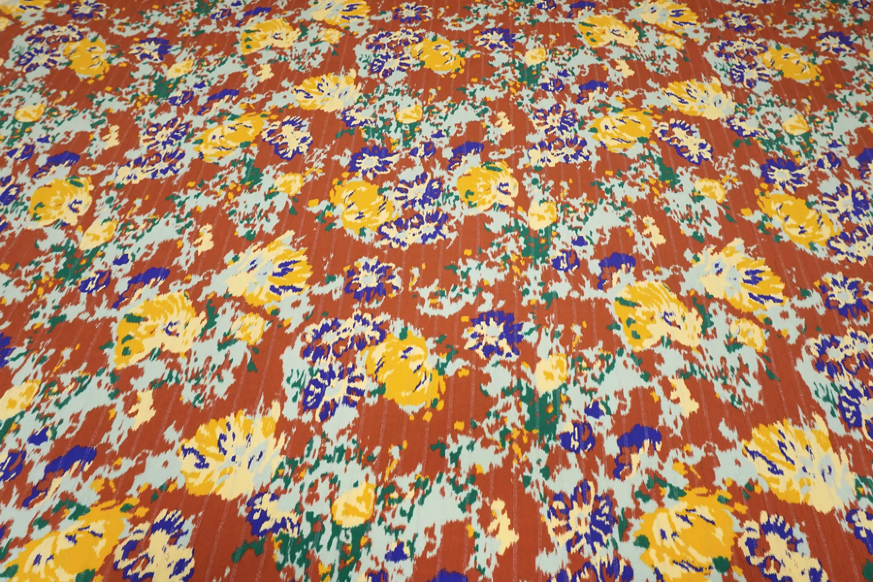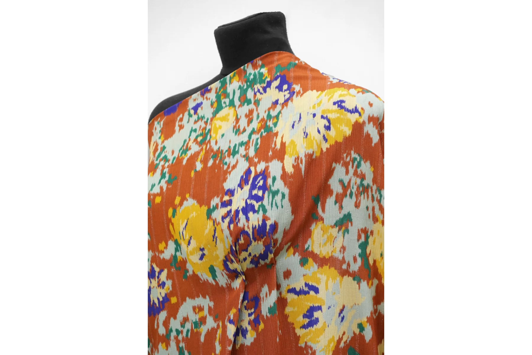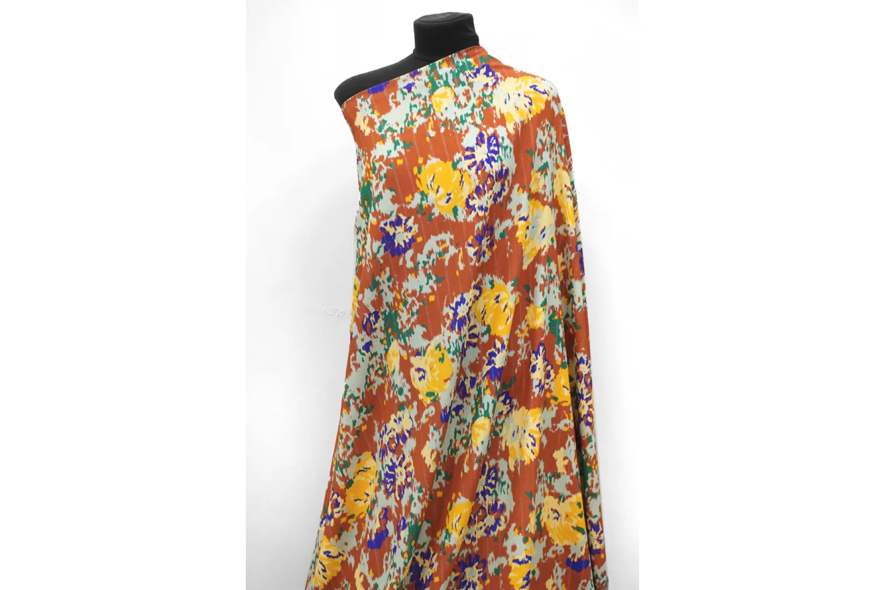 Жатая плательно-блузочная вискоза со абстрактным пятнистым принтом на терракотовом фоне. Приятная и шероховатая наощупь. Тонкая, пластичная, красиво драпируется, форму не держит. Плетение немного пружинит. Просвечивает в один слой. Слегка мнется. Прекрасный вариант на летние платья, юбки, летящие брюки, блузки. Учитывайте усадку.