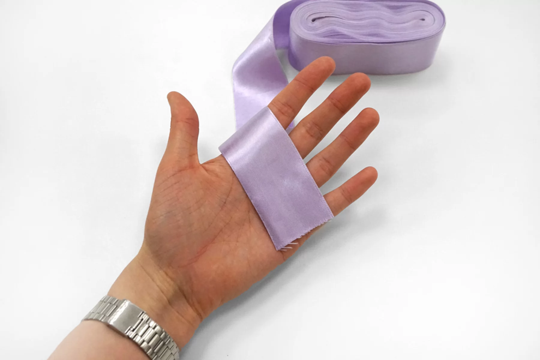 Лента вискозная атласная пастельно сиреневого цвета, мягкая и приятная на ощупь. Используется для украшения и отделки одежды, рукоделия, в скрапбукинге, в изготовлении цветов и тд. Ширина 4 см.