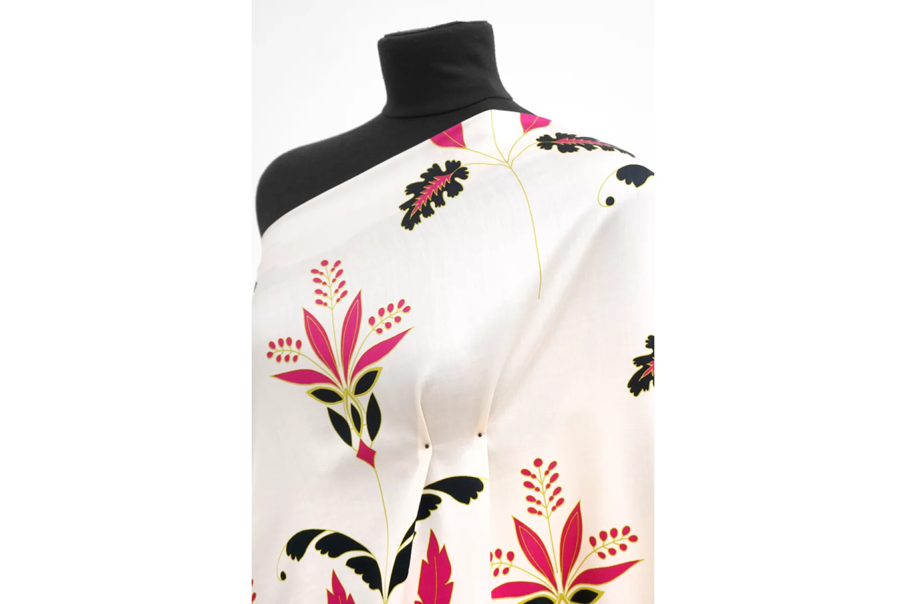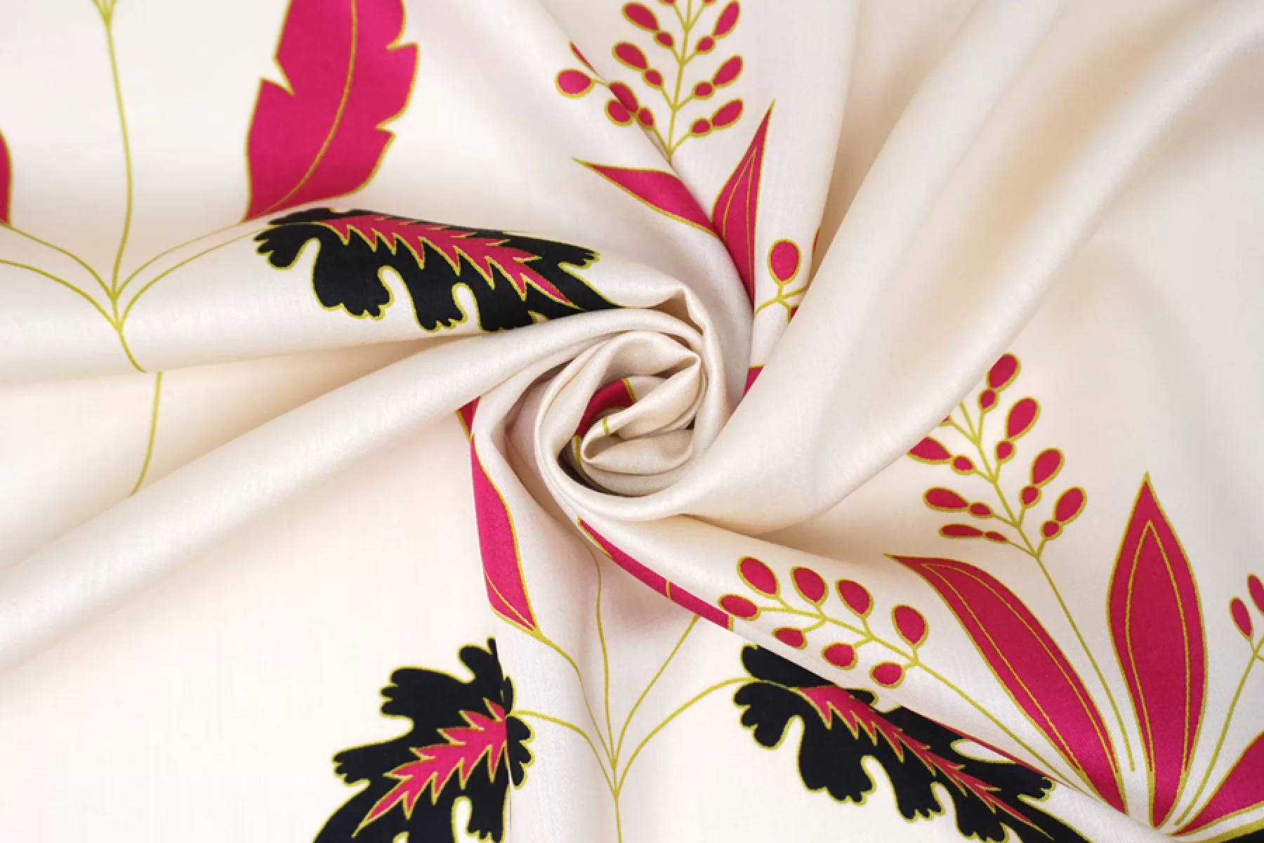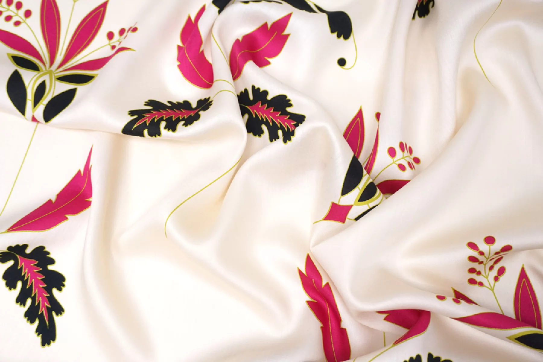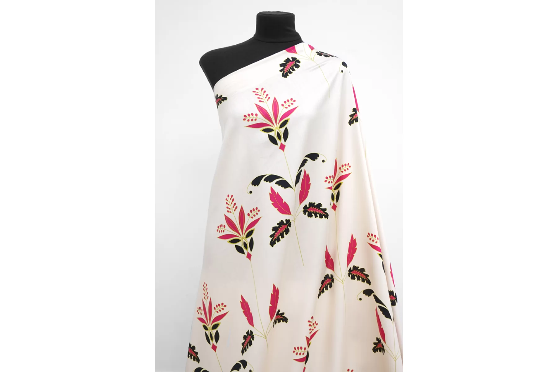 Плательно-блузочный по плотности вискозный сатин бежево-кремового оттенка в основе с достаточно крупным цветочным узором в оттенках фуксии, черного и горчично-зеленого. Очень приятный и мягкий, гладкий. Тонкий. Пластичный. Обладает приятным лоском и красиво струится. Не тянется. Мнется. Форму не держит. Слегка просвечивает силуэт. Отличный вариант для платья, блузки и юбки, а также для одежды в бельевом стиле. При необходимости используйте подкладочный материал. Обязательно учитывайте усадку 5-10%. Шить изделия из данного материала рекомендуем тонкой иглой.