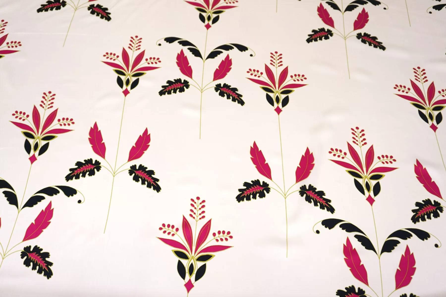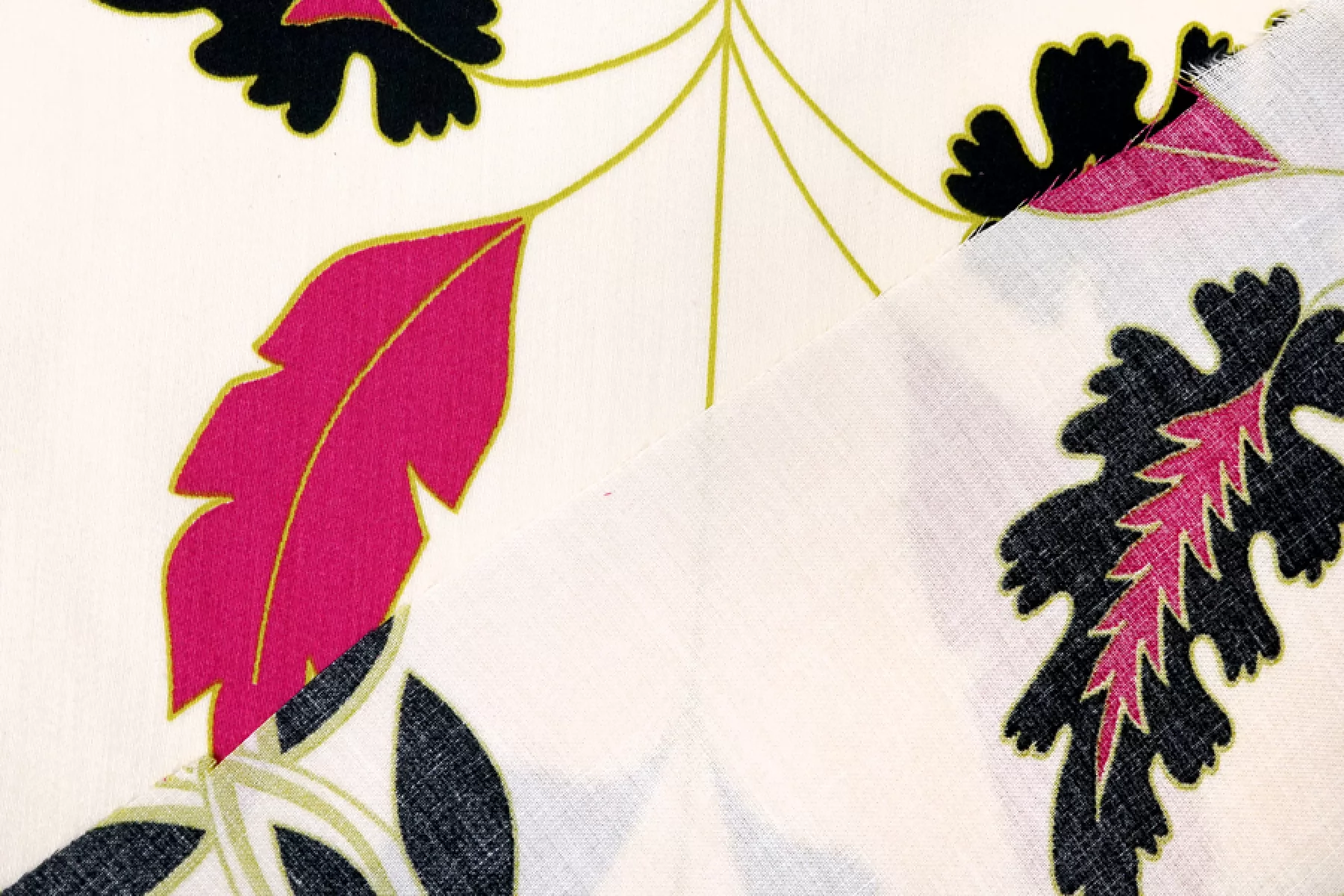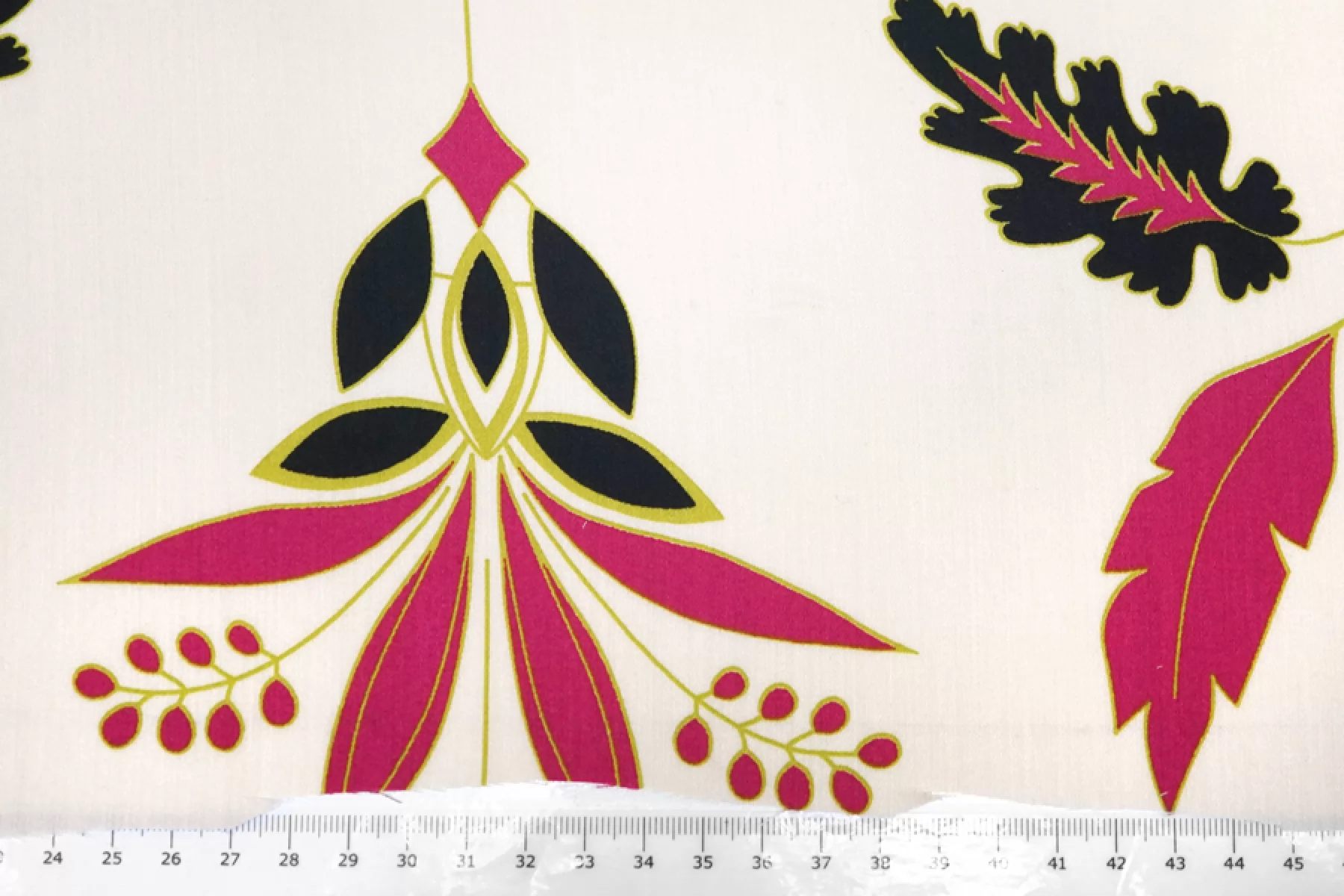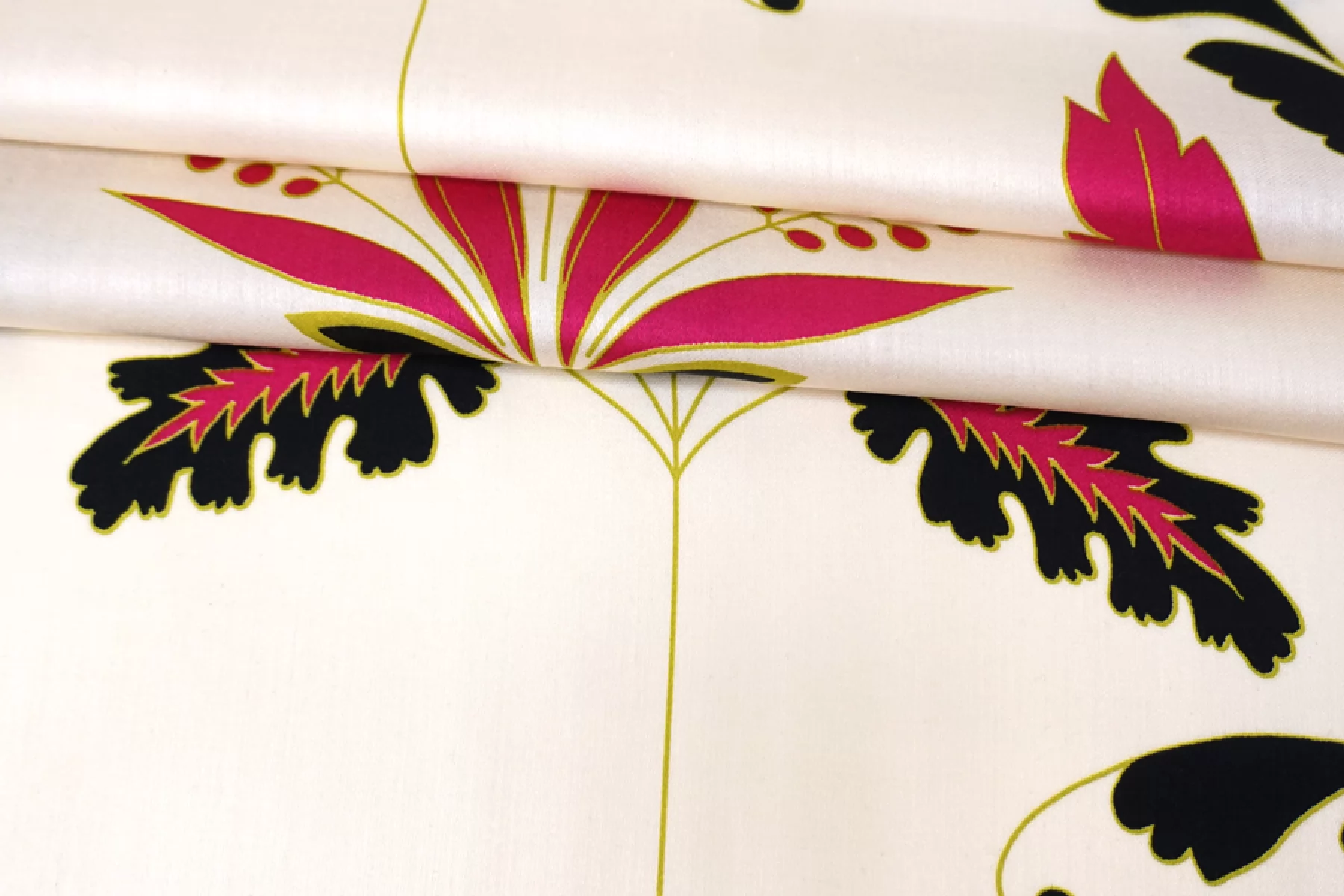 Плательно-блузочный по плотности вискозный сатин бежево-кремового оттенка в основе с достаточно крупным цветочным узором в оттенках фуксии, черного и горчично-зеленого. Очень приятный и мягкий, гладкий. Тонкий. Пластичный. Обладает приятным лоском и красиво струится. Не тянется. Мнется. Форму не держит. Слегка просвечивает силуэт. Отличный вариант для платья, блузки и юбки, а также для одежды в бельевом стиле. При необходимости используйте подкладочный материал. Обязательно учитывайте усадку 5-10%. Шить изделия из данного материала рекомендуем тонкой иглой.