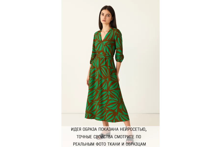 Особенность ткани не равномерно окрашенный фон см. на фото. Вискозный плательно-блузочный сатин с абстрактным рисунком в оттенках молочного шоколада и мятно-зеленого. Приятная, мягкая, гладкая. Обладает красивым сатиновым лоском. Тонкий, струящийся. Красив в своей пластике и движении. Форму не держит. Просвечивает силуэт на просвет. Не тянется. Сминается. Используем как вариант на платья, блузки и юбки, кимоно, а также одежду в бельевом стиле. При необходимости используйте подкладочный материал. Обязательно учитывайте усадку 5-10%. Шить изделия из данного материала рекомендуем тонкой иглой.