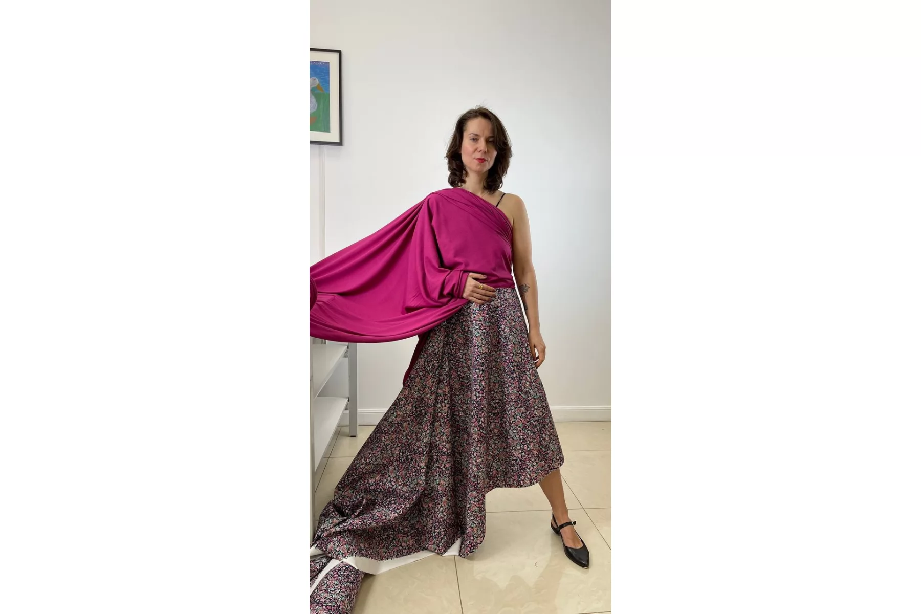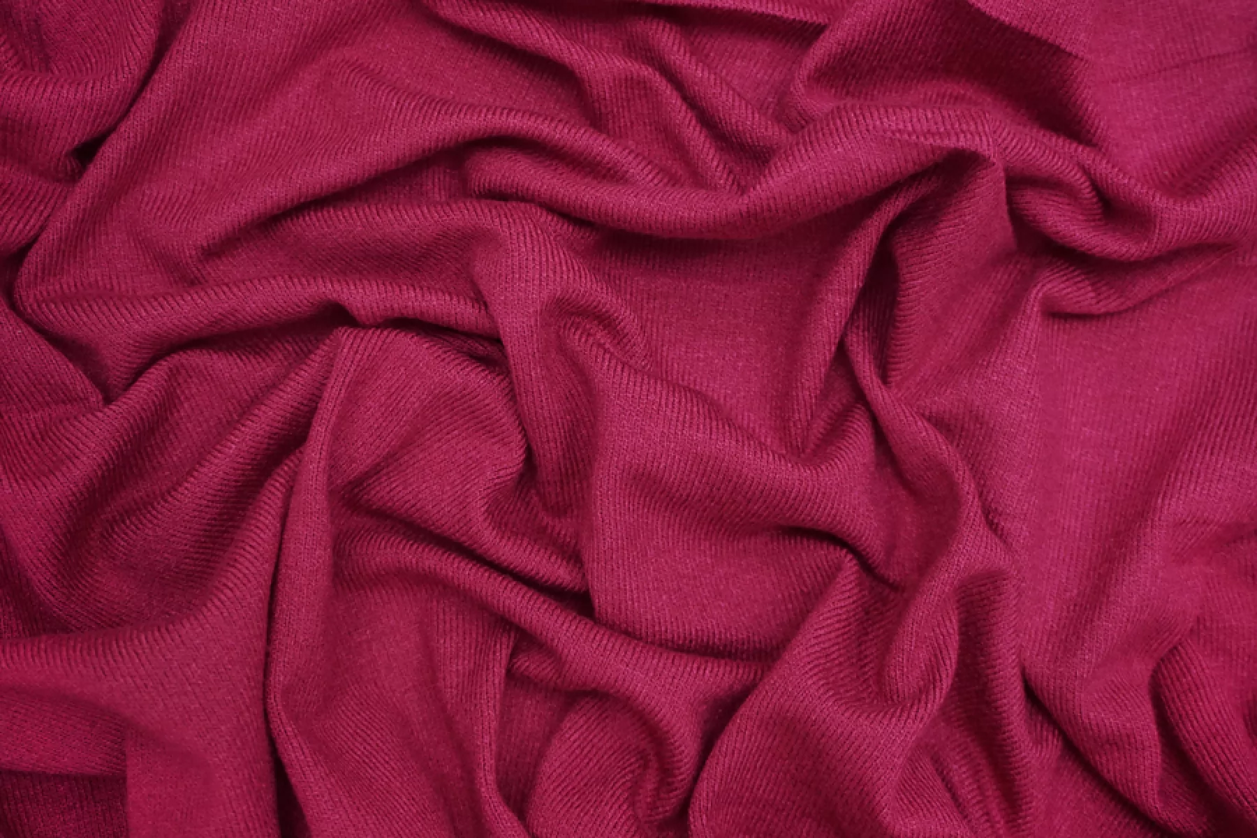 Мягкий вискозный трикотаж, кулирная гладь, в оттенке фуксии. Тактильно очень приятный и пластичный. Плетение средней плотности. Хорошо растяжим за счет плетения. Обладает легким лоском. Форму не держит, но красив в складках. Просвечивает при растяжении. Сминается, но восстанавливается практически полностью. Шьем кофты, водолазки, тонкие и мягкие кардиганы, а также другие варианты. Обязательно учитывайте возможную усадку.