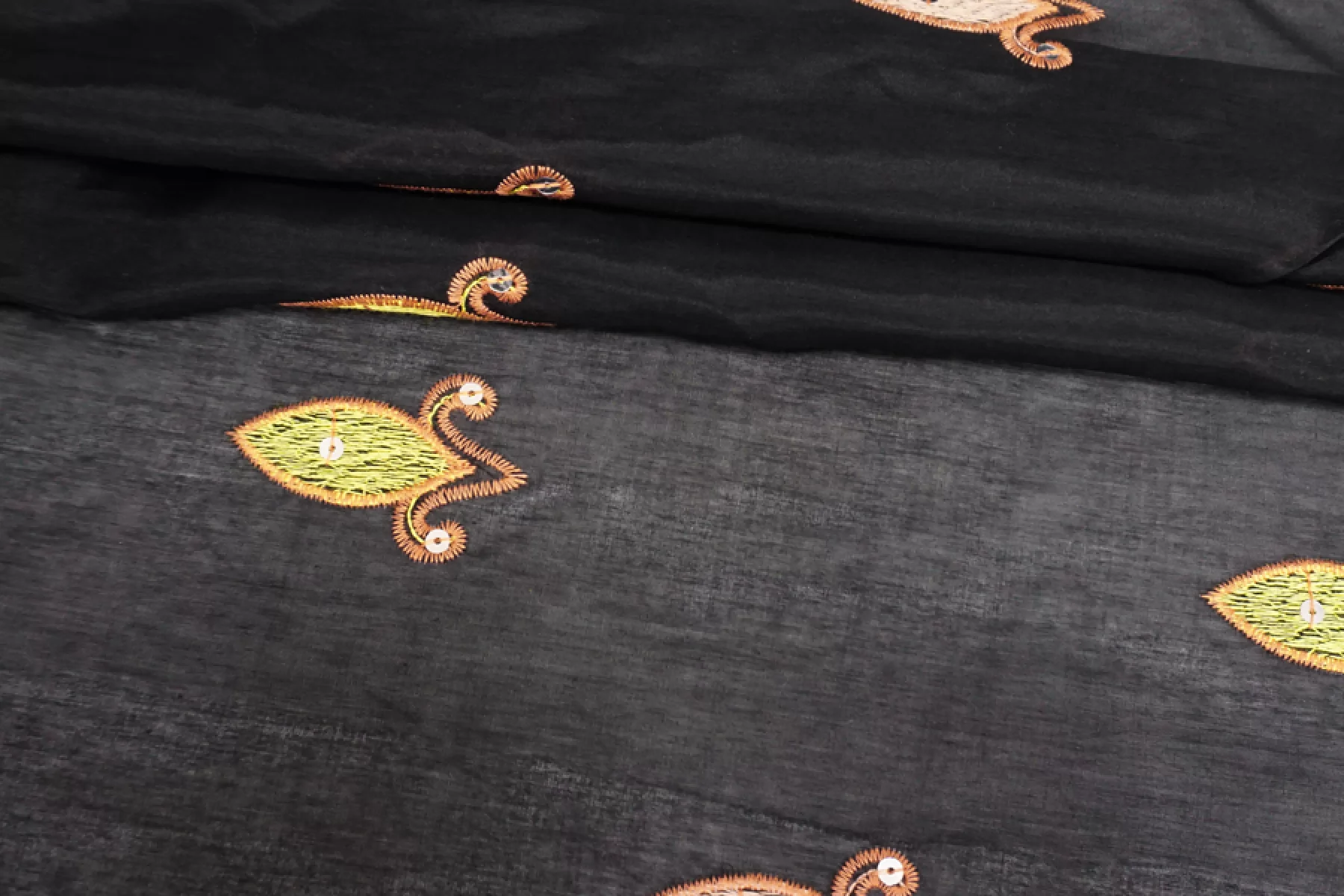 Шикарный батист хлопок с шелком с вышивкой в бронзово-зеленых оттенках. Вышивка каймовая по одной стороне, с добавлением пайеток. Материал тактильно очень мягкий, воздушный. Просвечивает, при необходимости используйте подкладочный материал. Сминается, но не сильно заметно. Не тянется. Отличный вариант на платья, рубашки, юбки. Уход деликатный.
