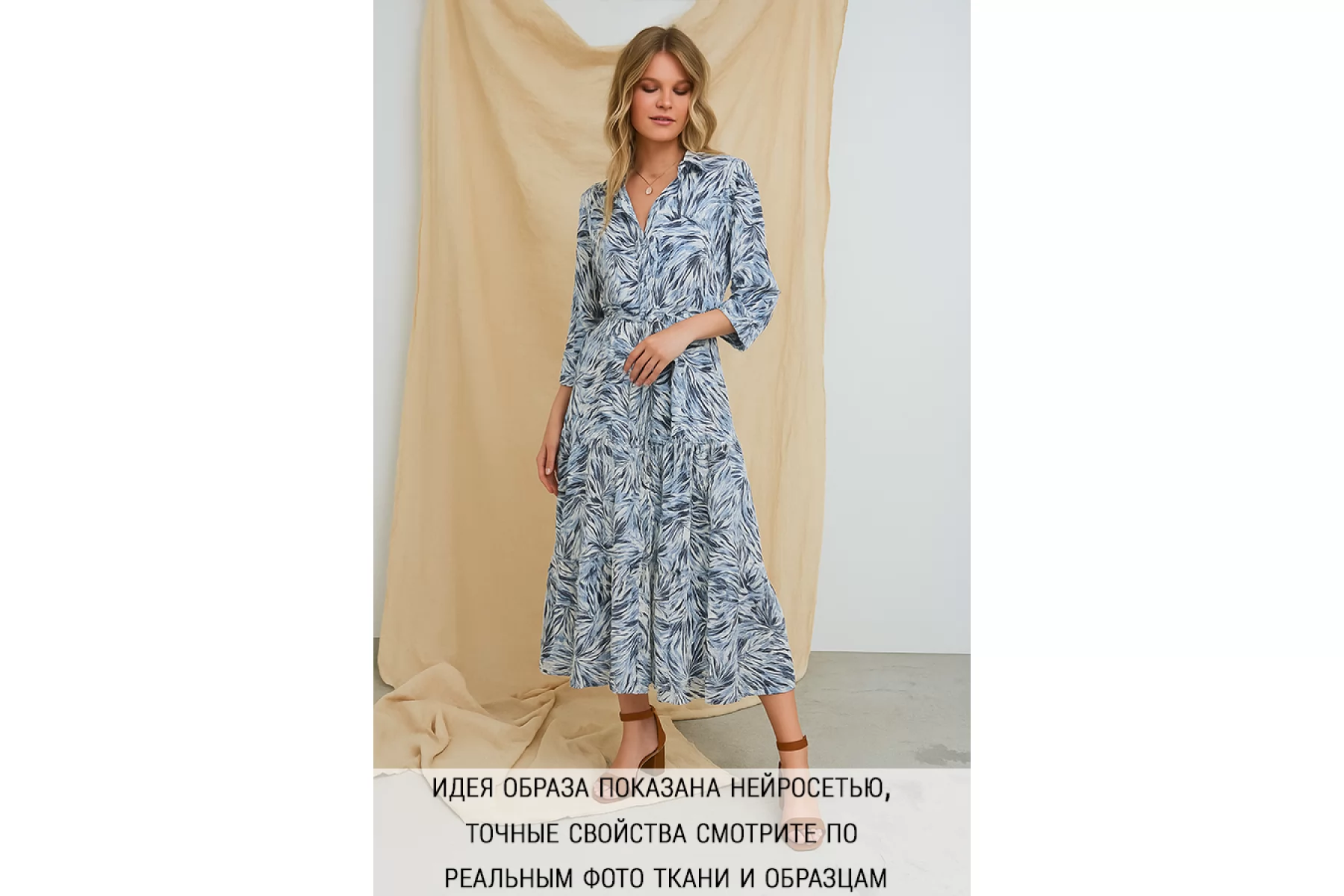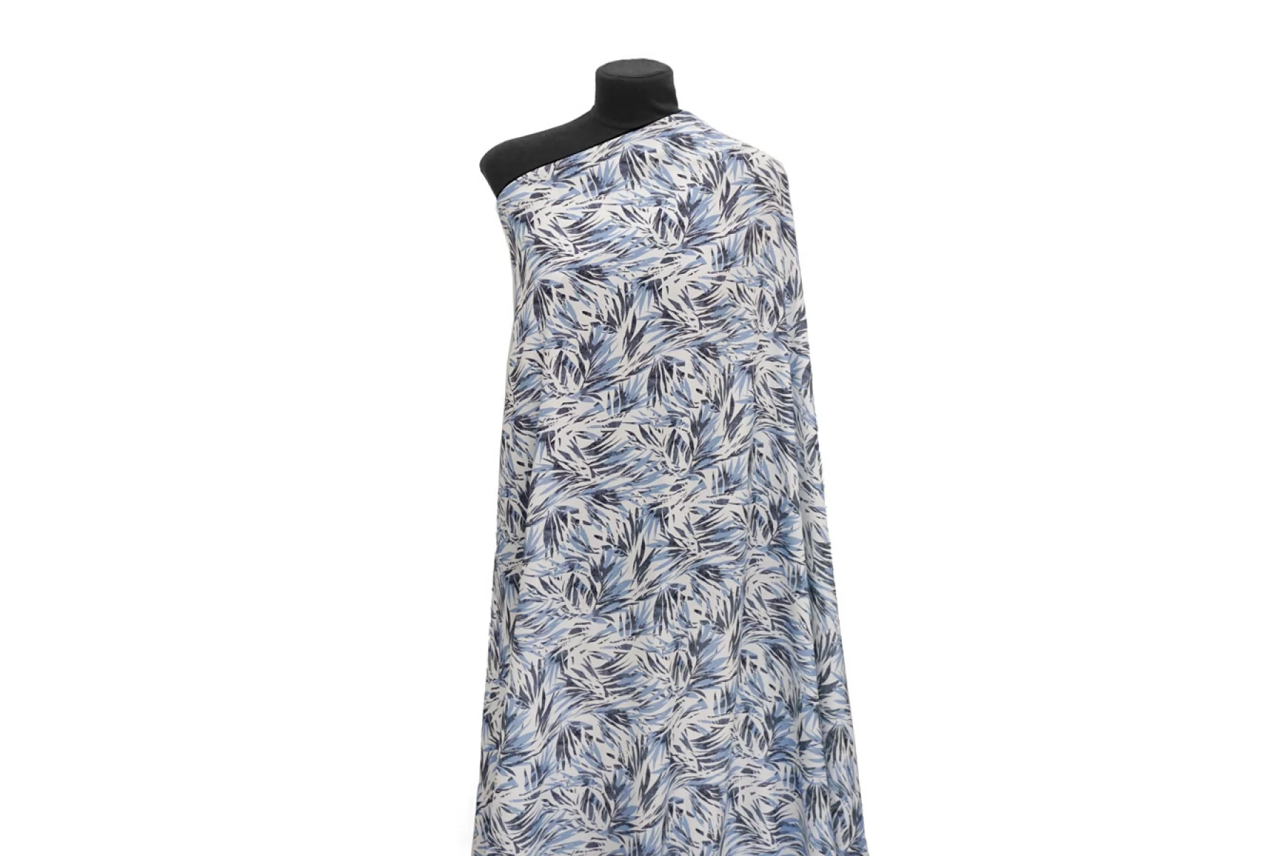 Плательная вискоза с креповой, мраморной поверхностью голубого белого с принтом в виде голубых листьев. Шероховатый материал, струящийся. Просвечивает. Не мнется. Подойдет для пошива платья, топа, блузки, юбки. Тонкий, пластичный, немного просвечивает (для юбки или платья советуем подклад, если это не юбка с множеством складочек). При работе с этой тканью советуем использовать тонкие иглы и нитки.