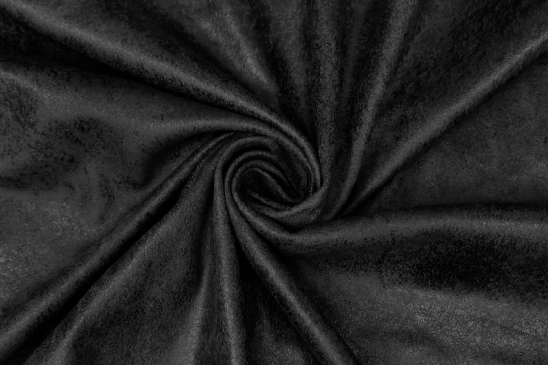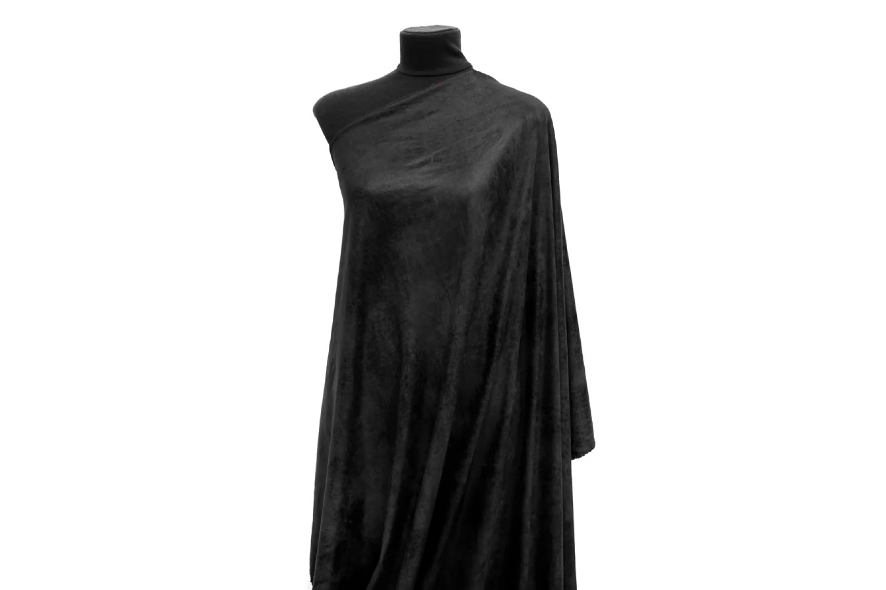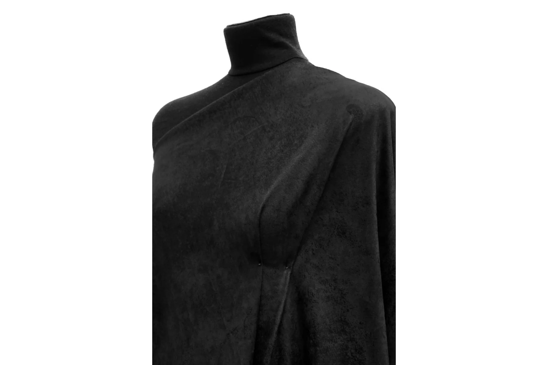 Шикарная искусственная замша костюмно-плательной плотности черного цвета. Полотно - трикотажного плетения. Тактильно очень приятная и очень мягкая. Тонкая. Отлично и упруго тянется за счет трикотажной основы. Не просвечивает. Обладает красивым лоском. Срезы не осыпаются. Слегка сминается, но восстанавливается. Смотрится дорого! Форму держит слабо, но отлично драпируется и смотрится в складках. Пластичная. Шьем юбки, платья, кардиганы, брюк и не только.