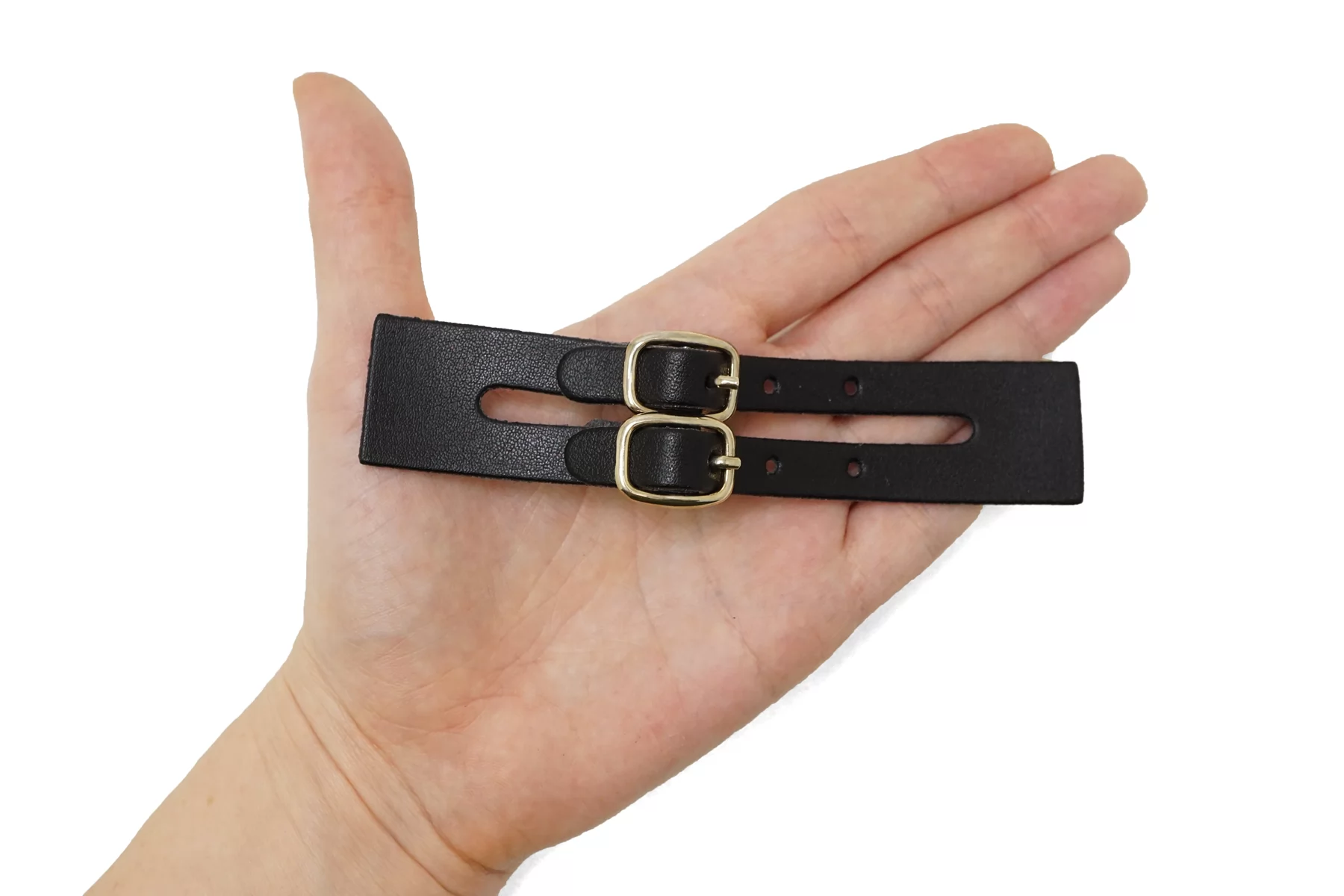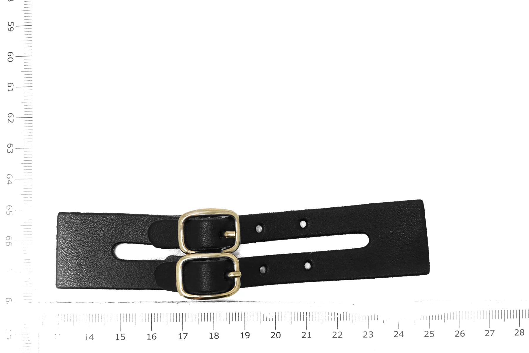 Застёжка-клевант из эко-кожи черного цвета с золотыми металлическими пряжками. Состоит из двух частей -ремешок двойной с пряжками 6 см и ремешки с отверстиями 10 см , ширина ремешка 25 мм, ширина пряжки 15 мм.