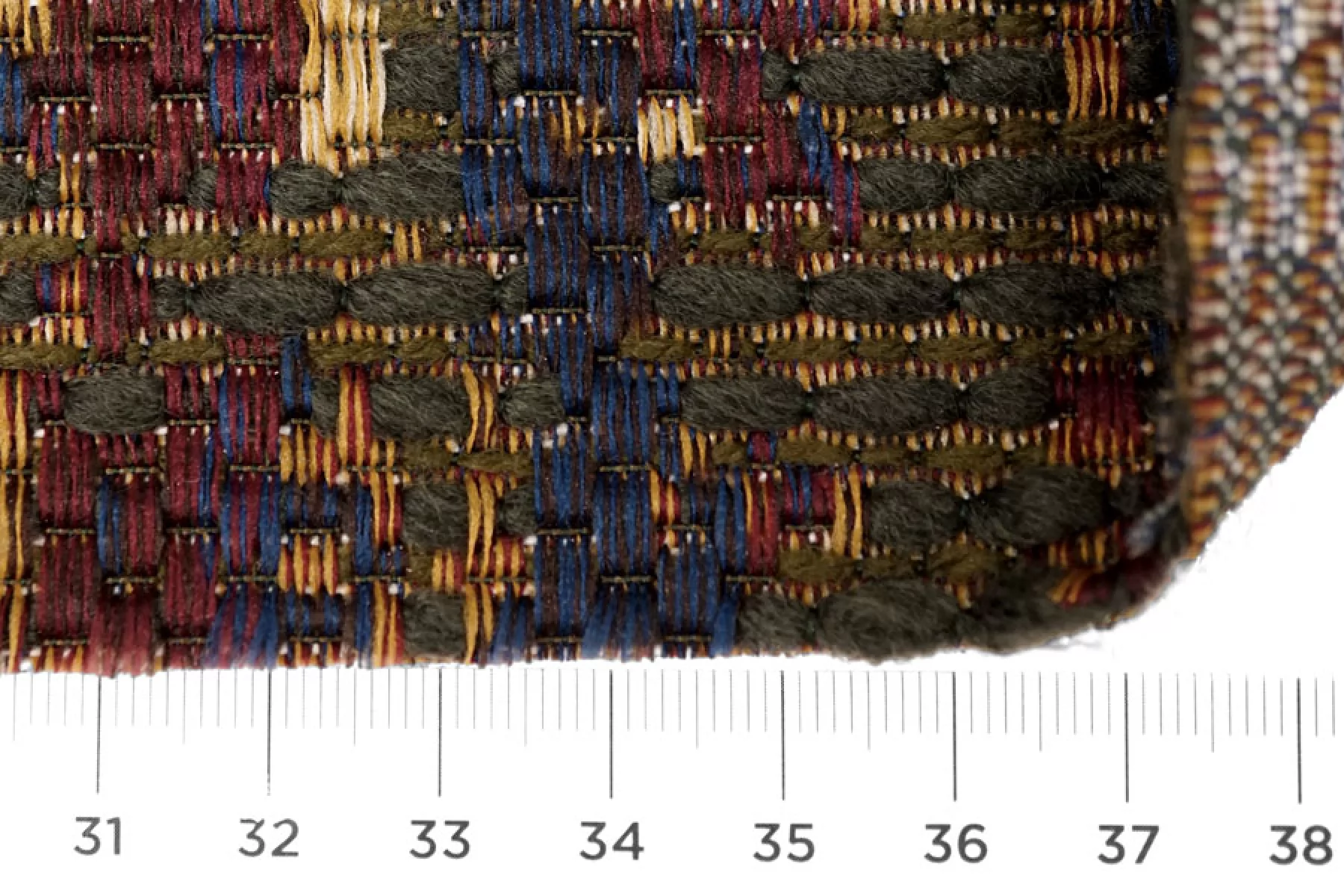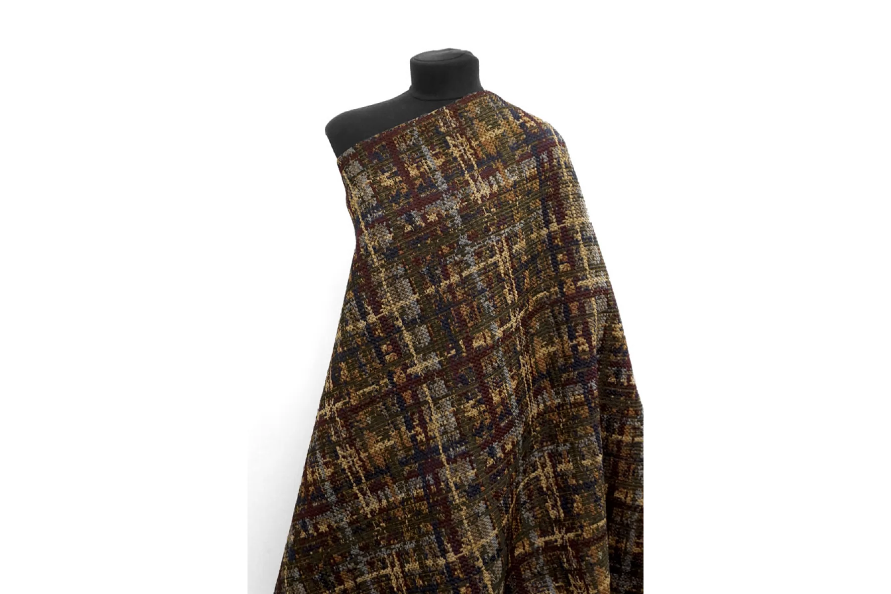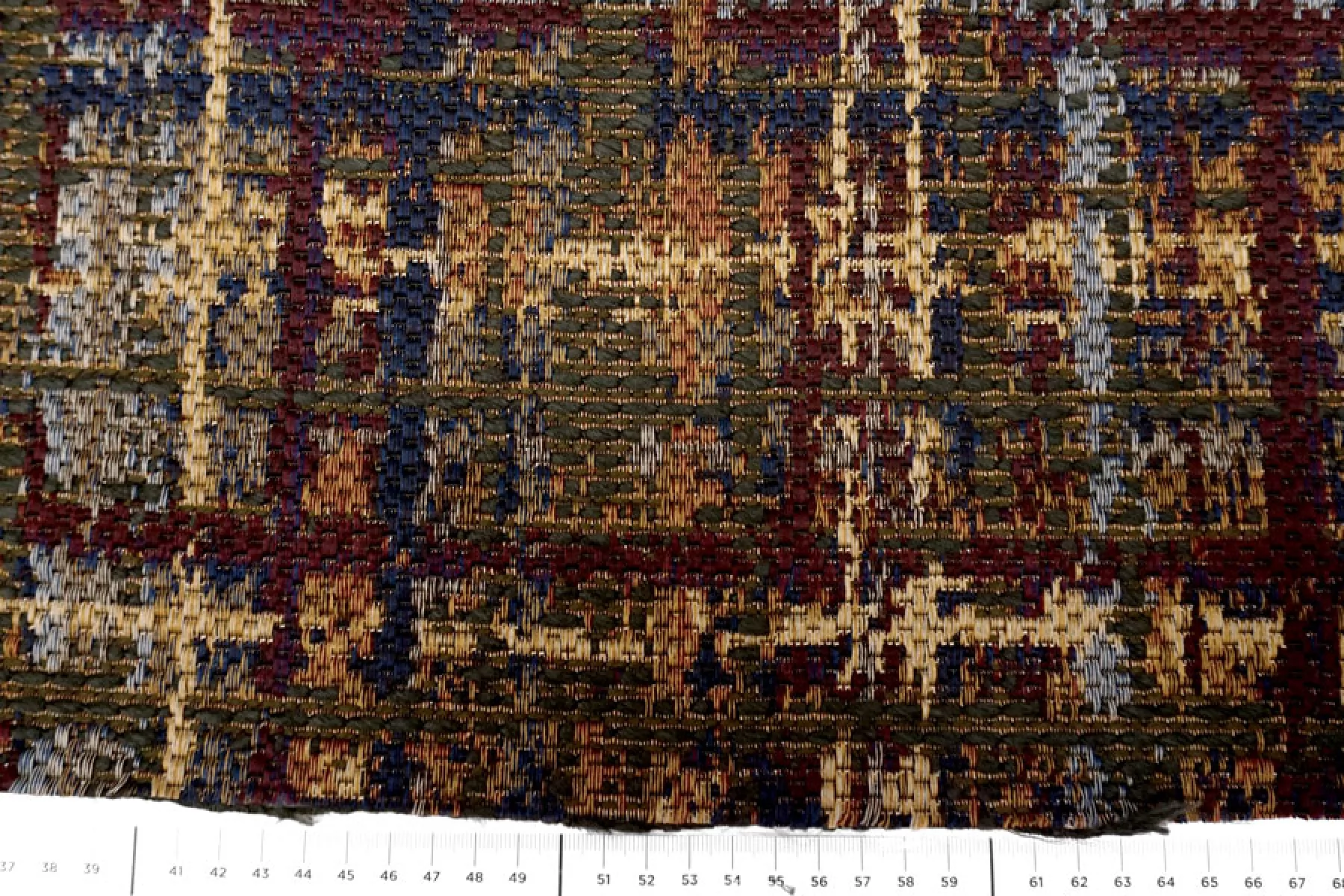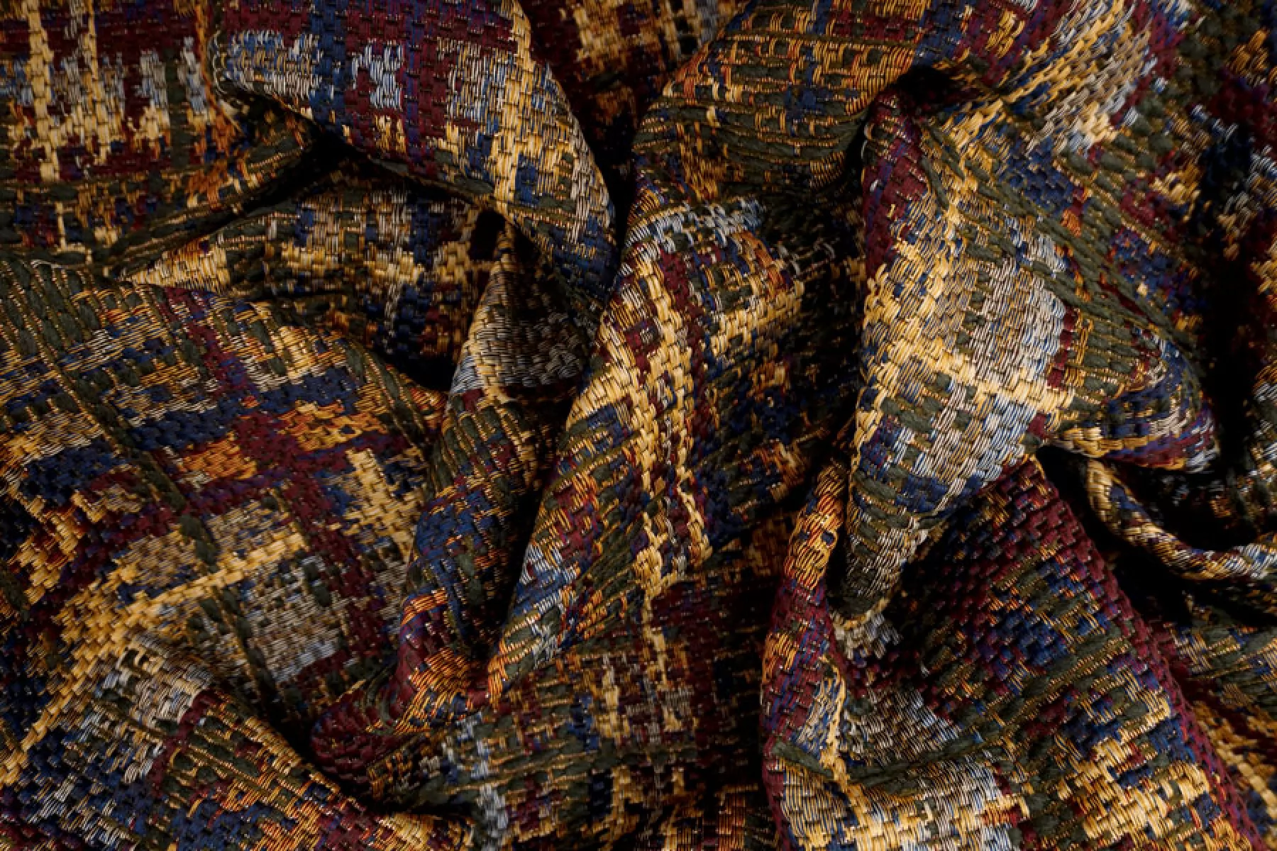 Итальянский хлопковый гобелен от Etro с узором, нити желто-бежевого, зеленого, бордового и синего цвета. Довольно плотный, не очень толстый. Не тянется и держит форму. Не просвечивает. Прекрасный вариант на жакеты, костюмные варианты, платья и юбки.