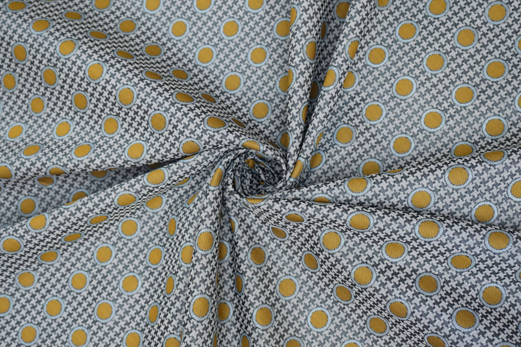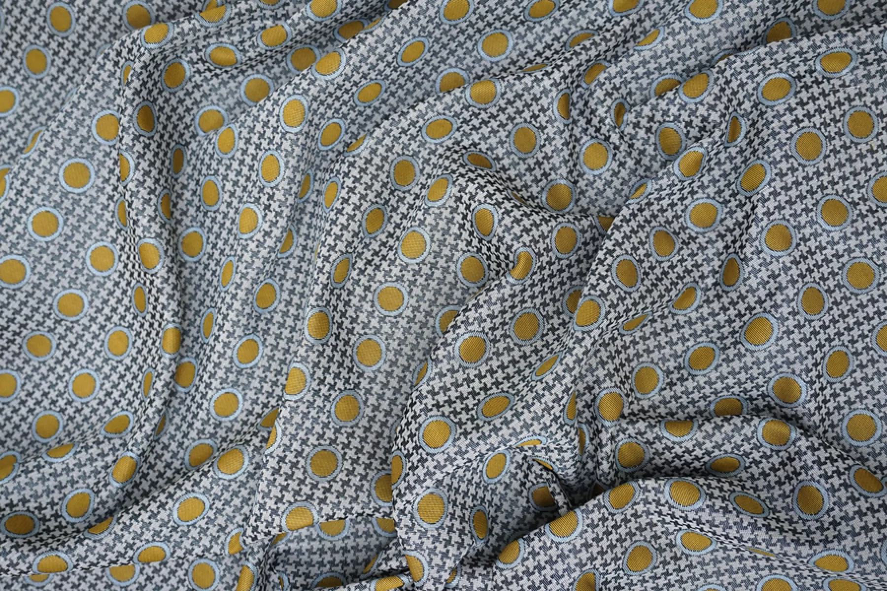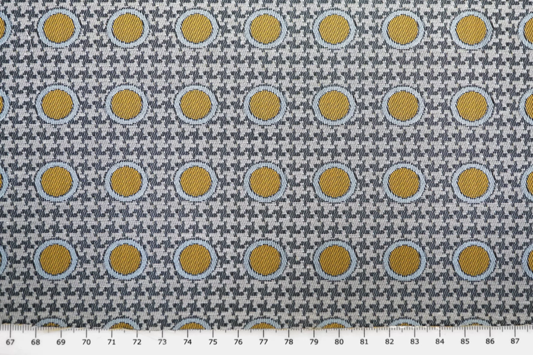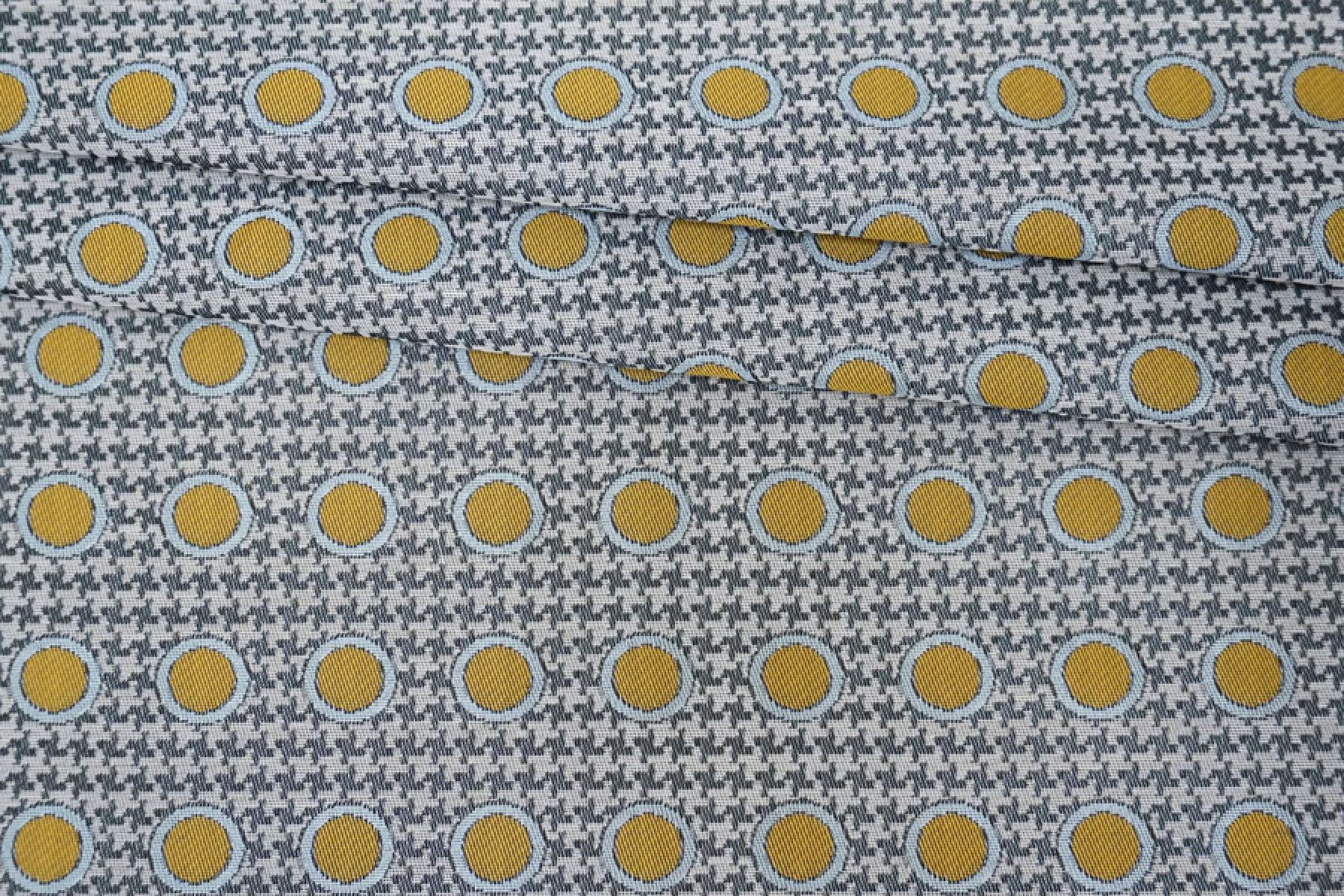 Костюмно-плательный жаккард из хлопка с полиэстером в серо-горчичной (переплетение нитей белого, черного и нежно-голубого цветов) цветовой гамме с выработкой узора в виде гусиной лапки и кругов. Нежно-голубая нить с красивым лоском, что дает легкий перелив материалу. Жаккард тактильно приятный, мягкий. Хорошо драпируется и прекрасно держит форму. Материал тонкий, но достаточно плотный. Не тянется и не просвечивает. Сминается, но восстанавливается. Отличный вариант как на повседневные, так и на нарядные платья, жакеты, костюмные варианты и юбки.