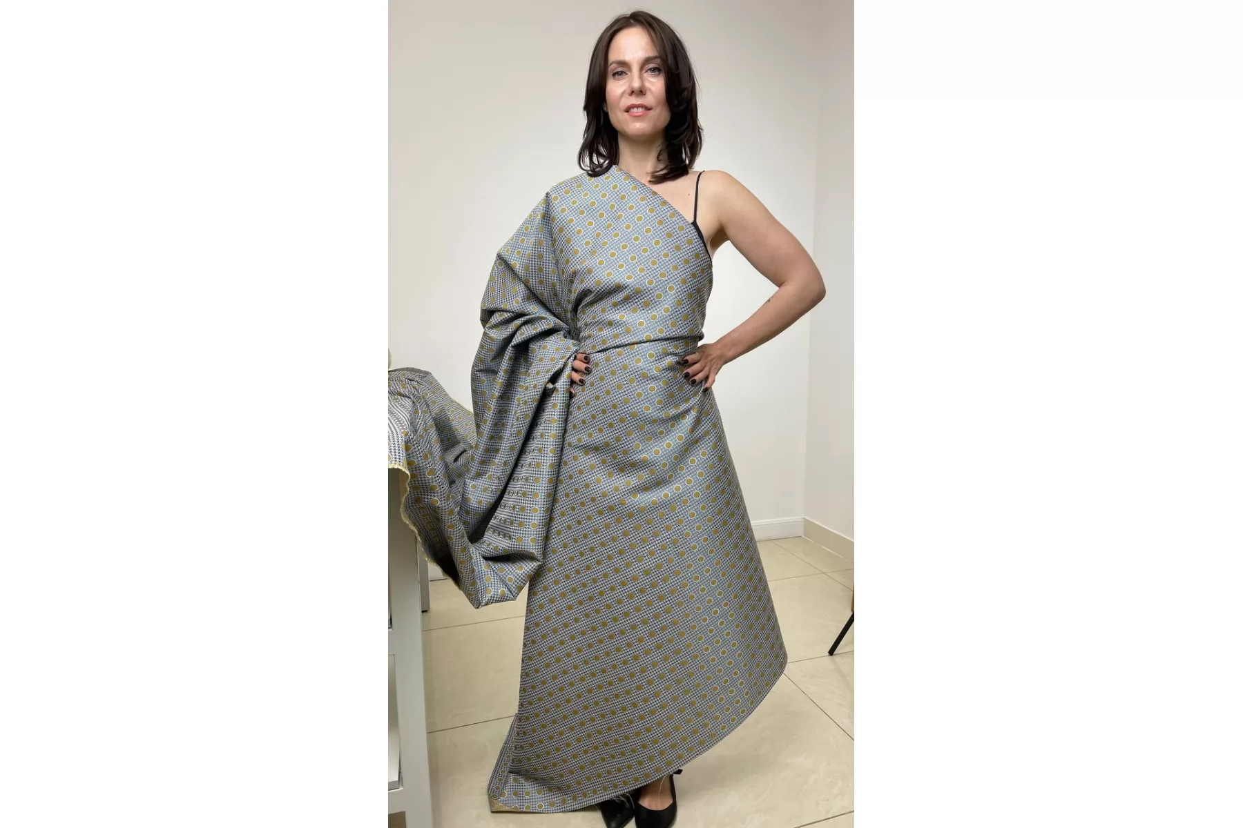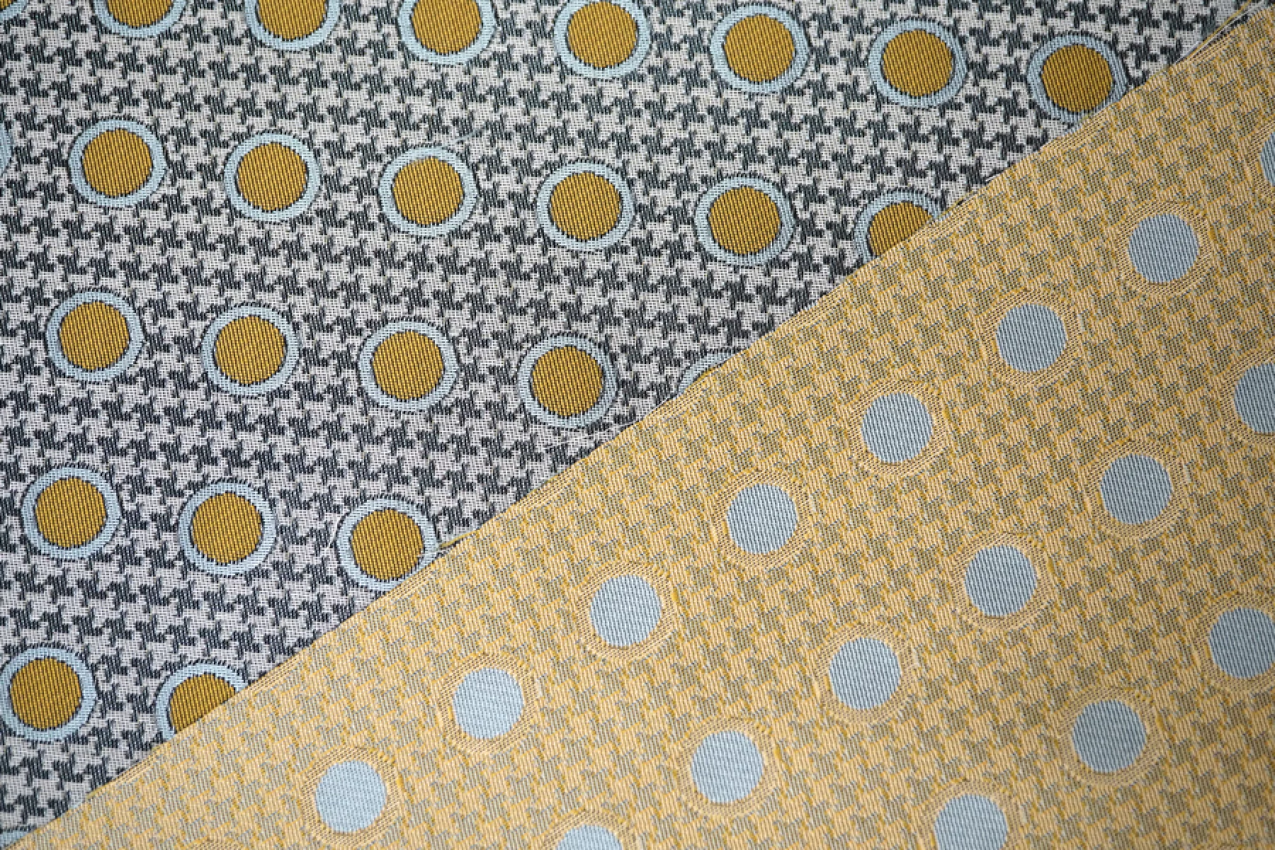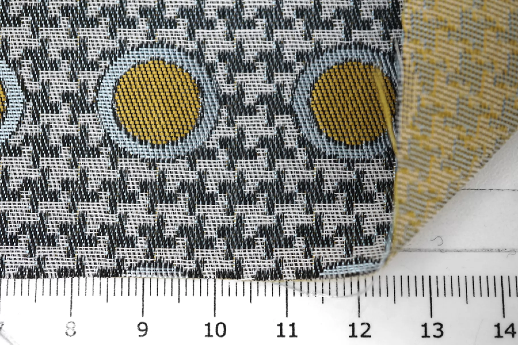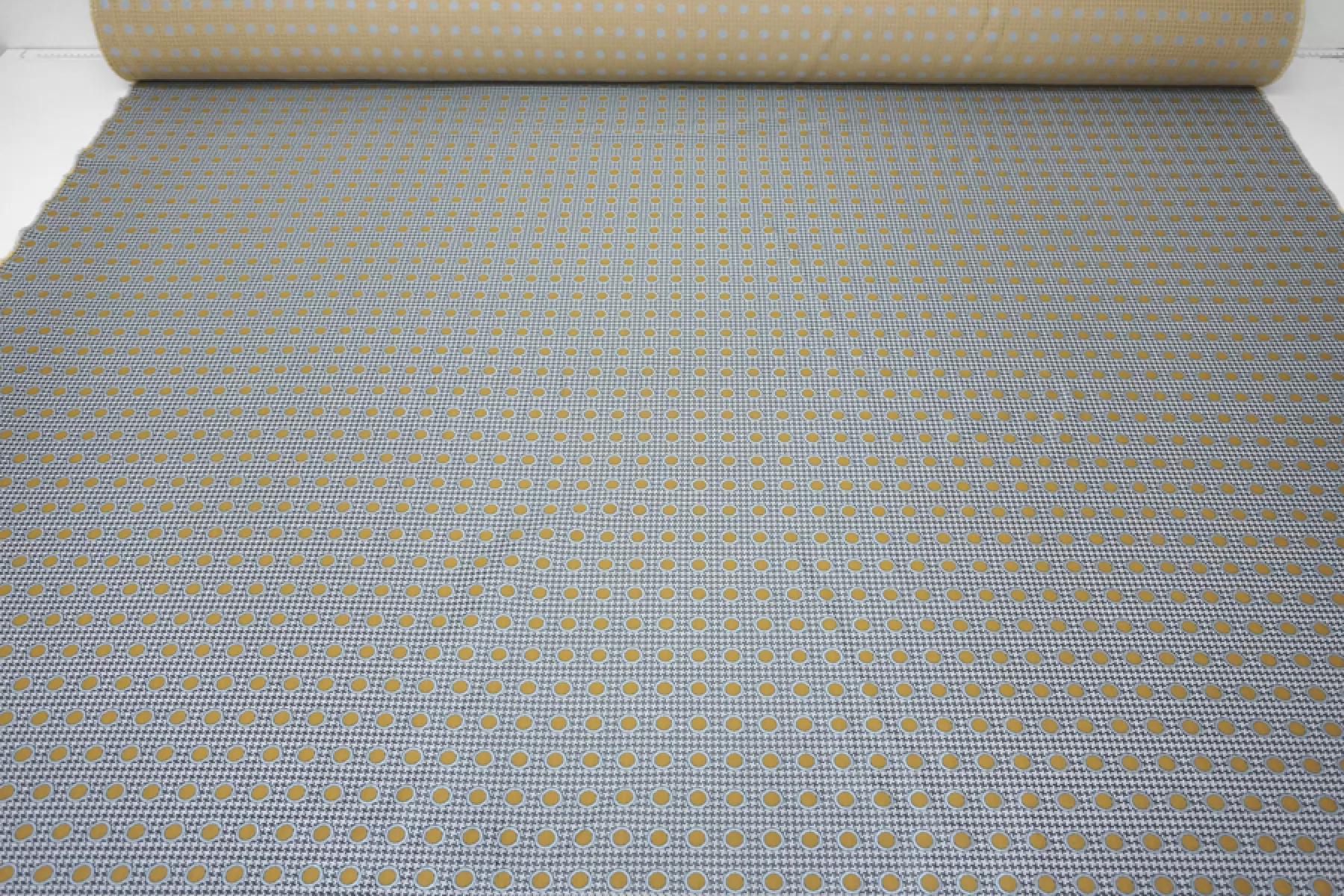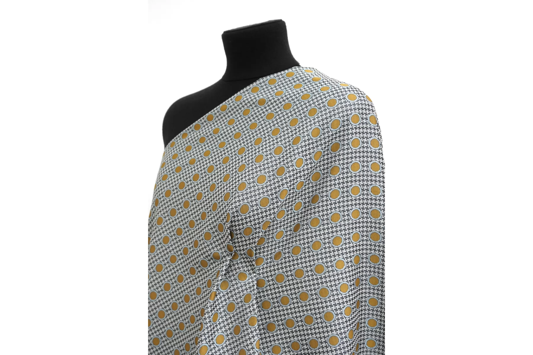 Костюмно-плательный жаккард из хлопка с полиэстером в серо-горчичной (переплетение нитей белого, черного и нежно-голубого цветов) цветовой гамме с выработкой узора в виде гусиной лапки и кругов. Нежно-голубая нить с красивым лоском, что дает легкий перелив материалу. Жаккард тактильно приятный, мягкий. Хорошо драпируется и прекрасно держит форму. Материал тонкий, но достаточно плотный. Не тянется и не просвечивает. Сминается, но восстанавливается. Отличный вариант как на повседневные, так и на нарядные платья, жакеты, костюмные варианты и юбки.