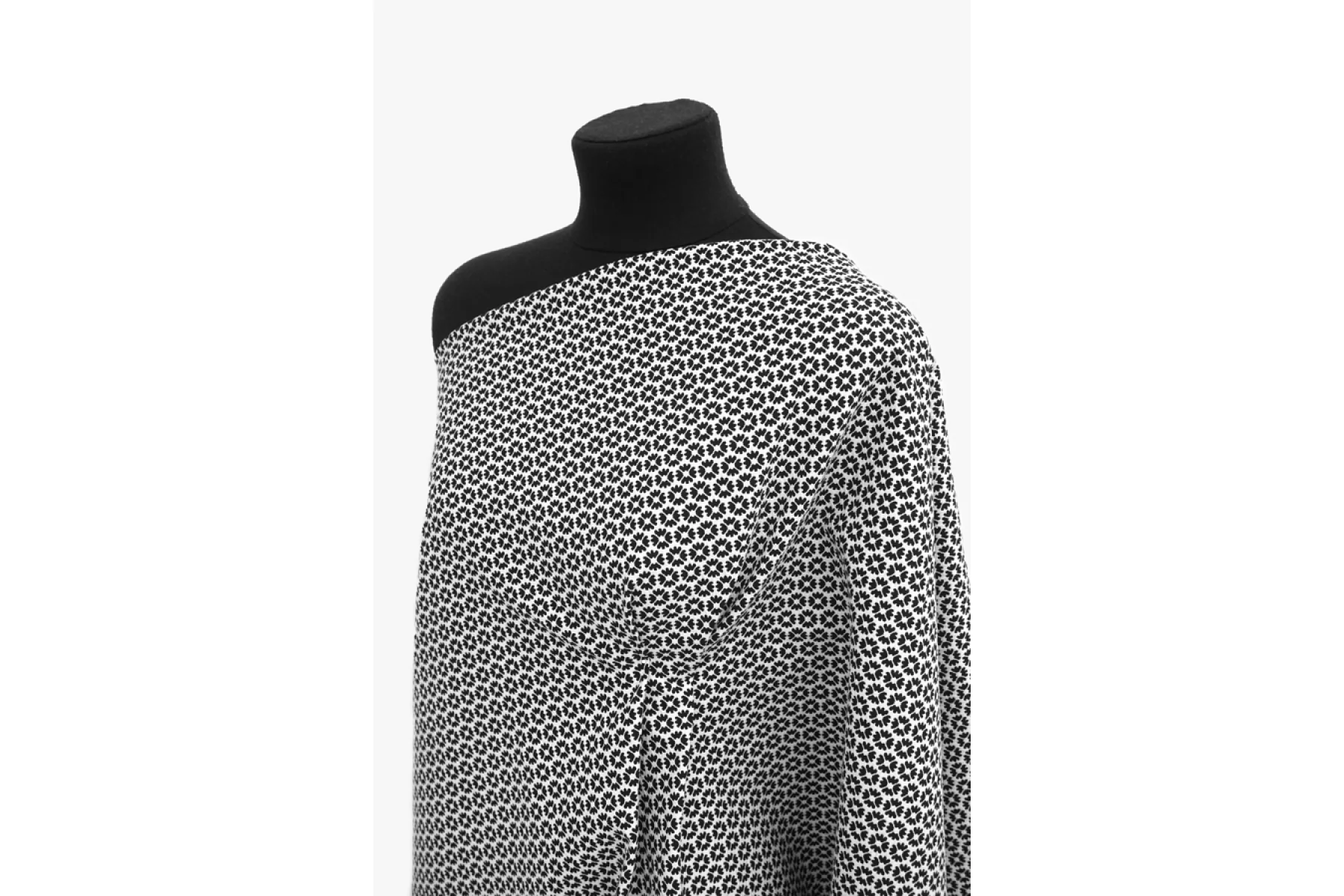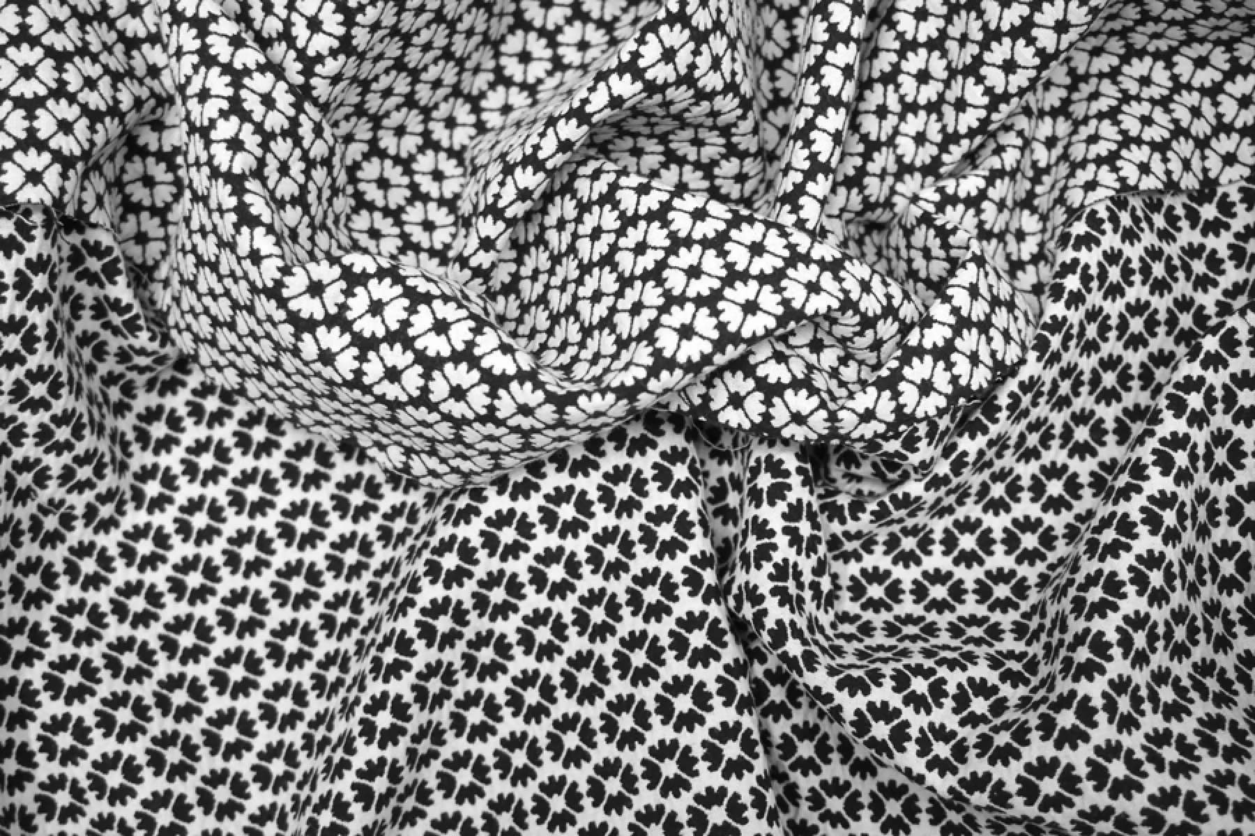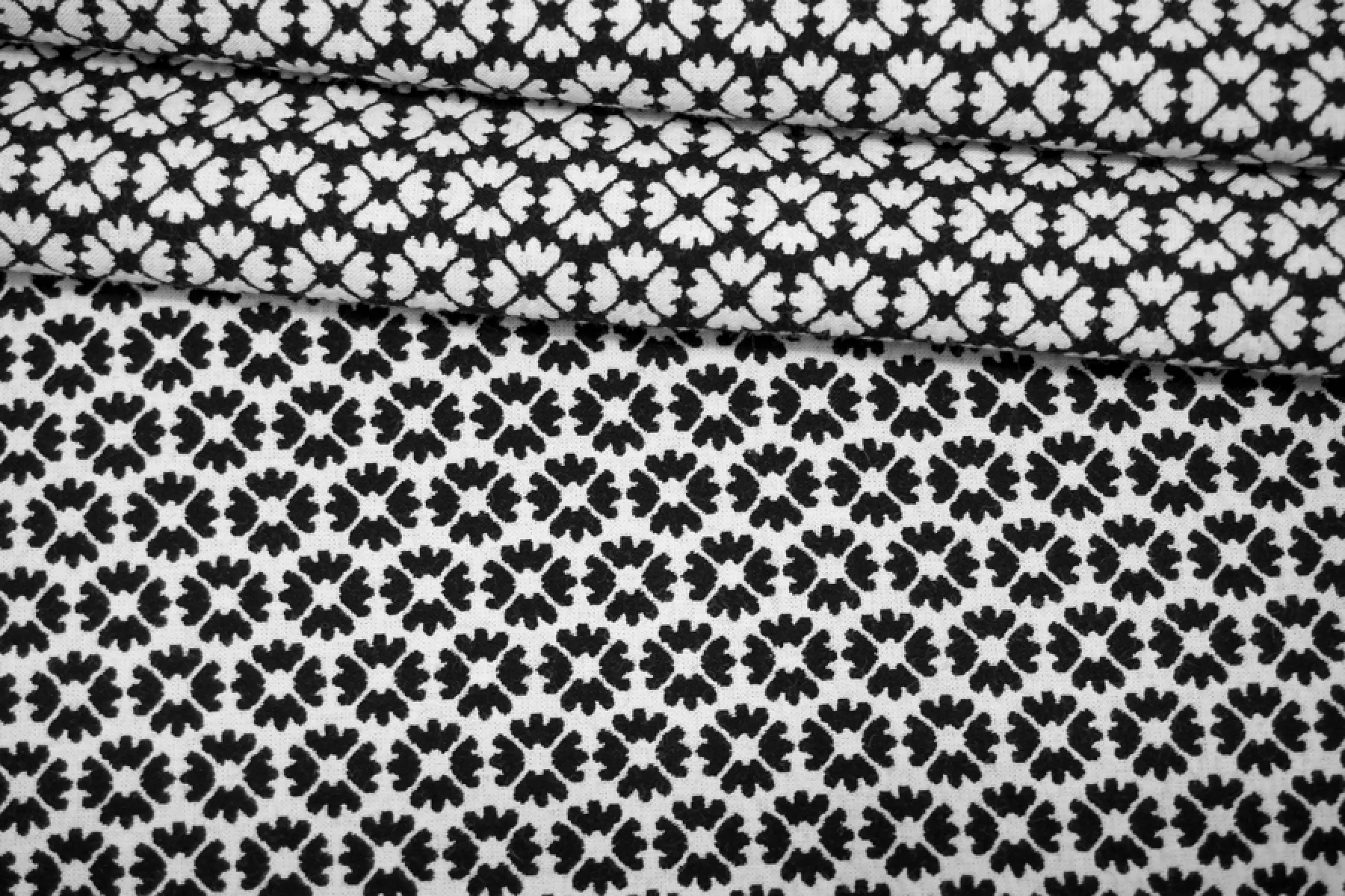 Костюмный хлопковый жаккард с цветочным узором в черно-белом цвете. Материал двусторонний: с одной стороны цветы черные на белом фоне, а с другой - белые на черном. Хорошо драпируется и держит форму. Не просвечивает, сминаемый, но быстро восстанавливается. Подойдет на платья, жакеты, брюки, юбки и костюмы.