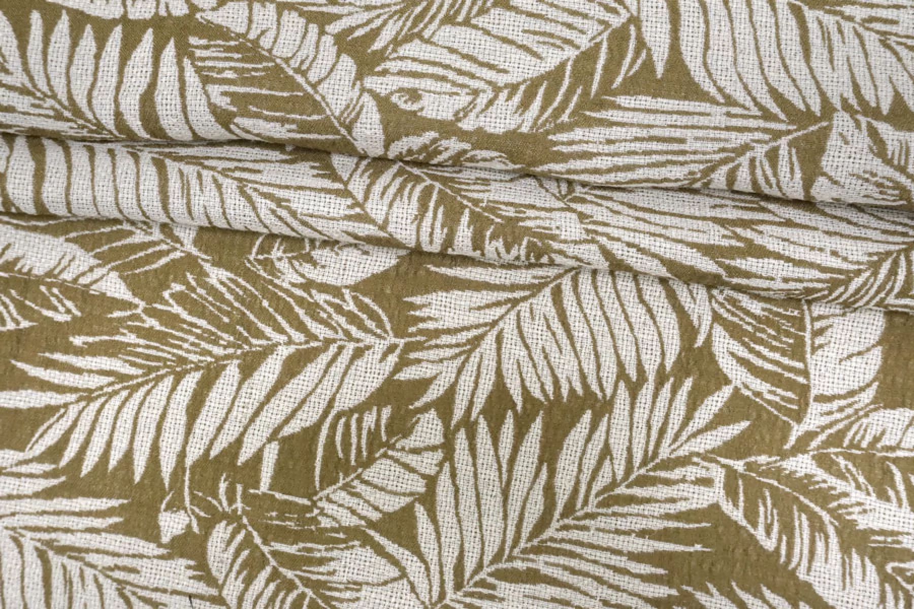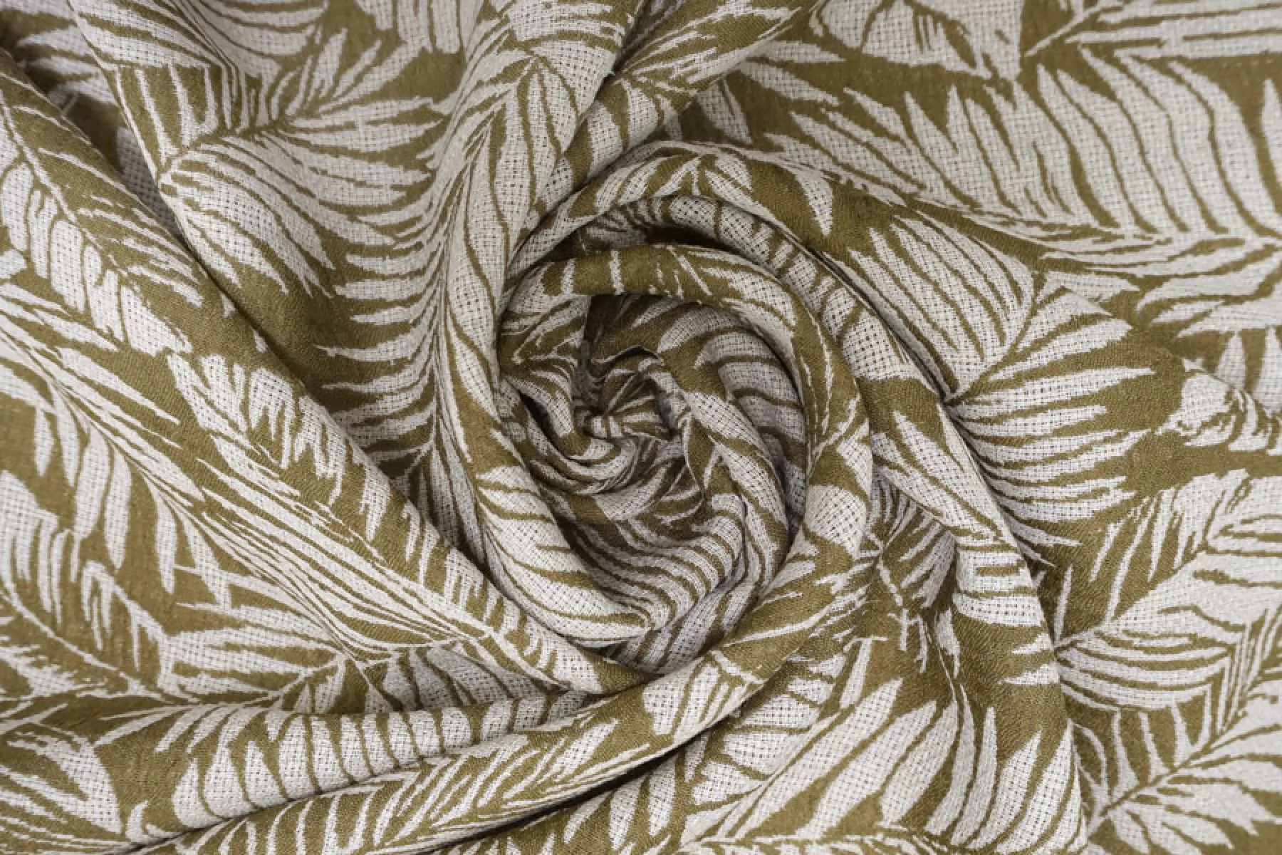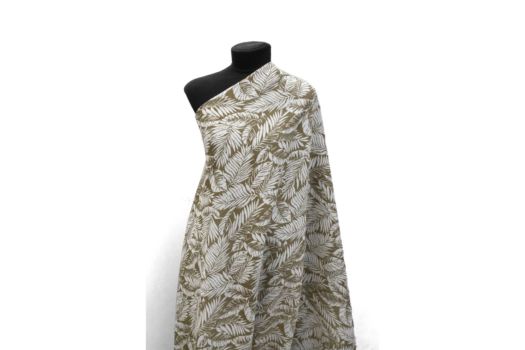 Классная позиция - жаккардовый костюмно-плателльный хлопок с выработкой в видекрупных листьем в золотистом оттенке хаки на белом фоне. Тактильно креповый, тонкий, пластичный. Не тянется, хорошо драпируется. Форму практически не держит. Плетение не плотное, но за счет двуслойности практически не просвечивает. Не мнется. Содержание полиэстера добавит изделию износостойкости. Шьем костюмные варианты, платья, жакеты и юбки.