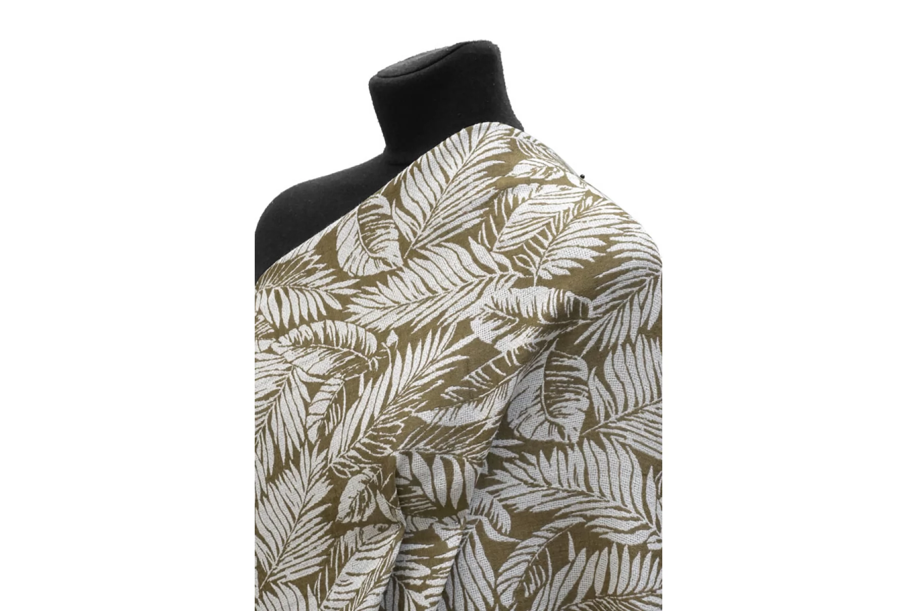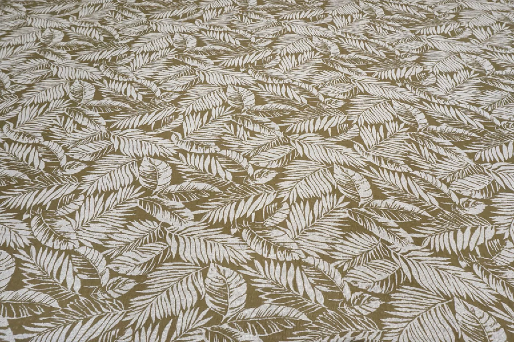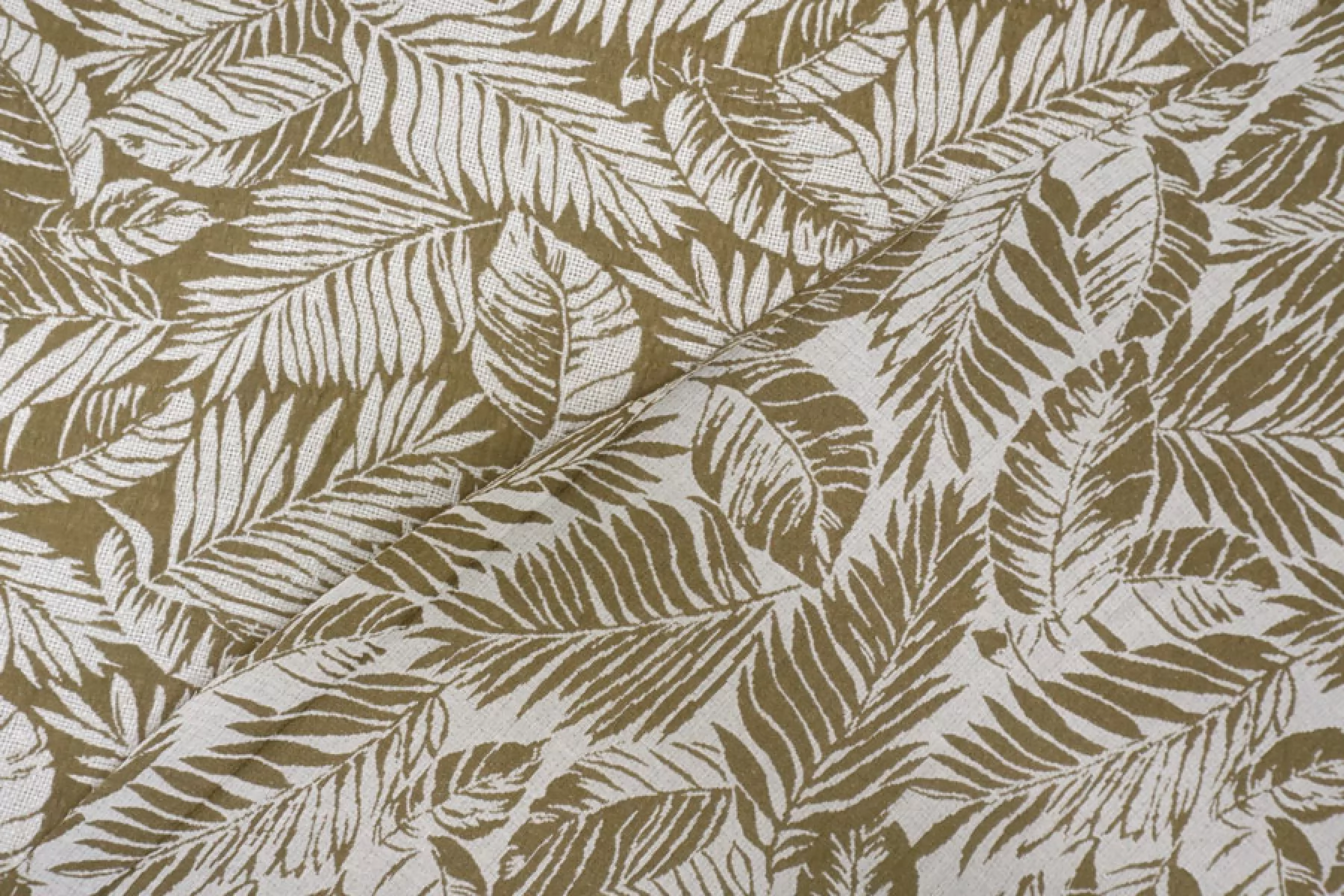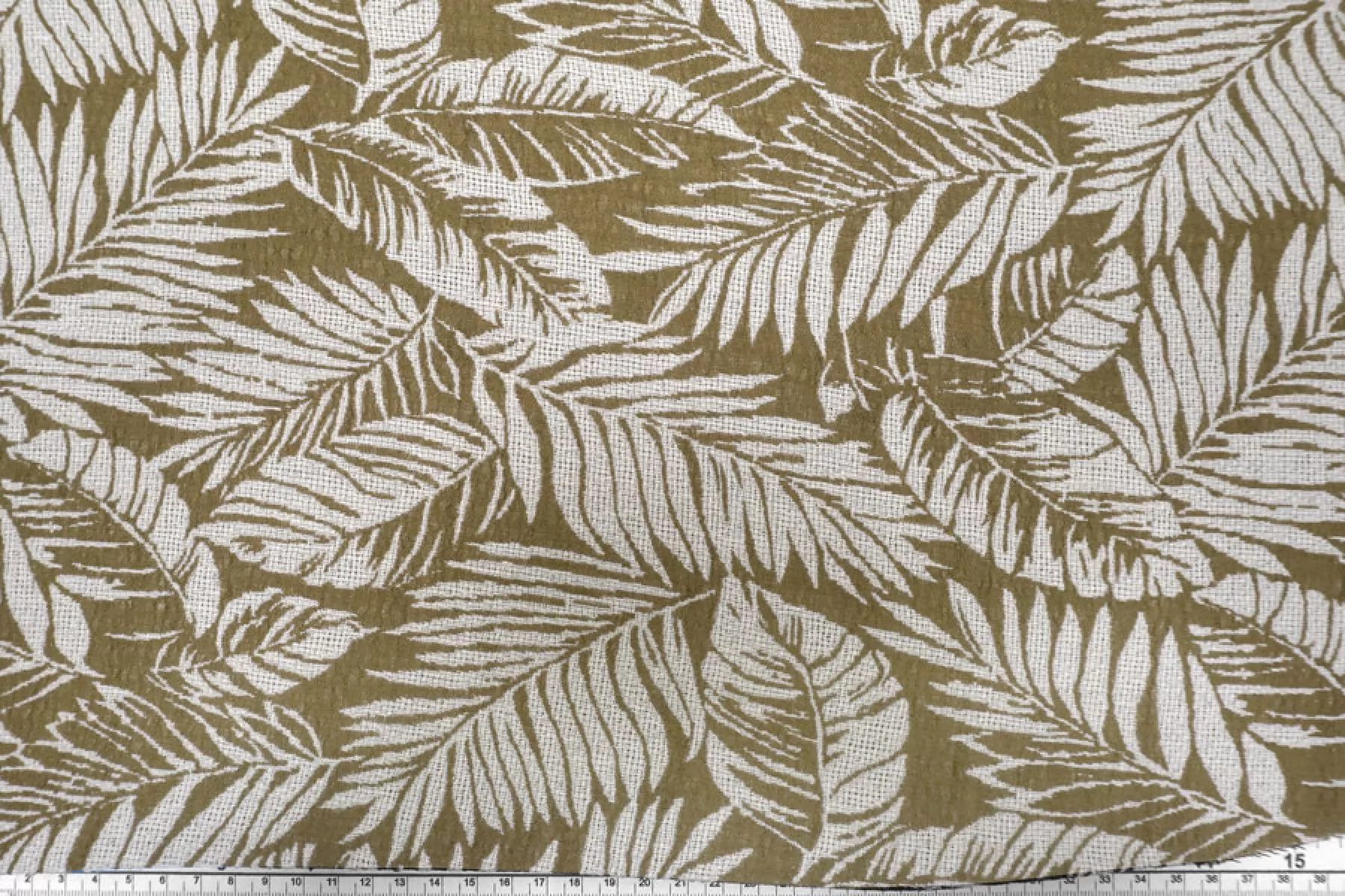 Классная позиция - жаккардовый костюмно-плателльный хлопок с выработкой в видекрупных листьем в золотистом оттенке хаки на белом фоне. Тактильно креповый, тонкий, пластичный. Не тянется, хорошо драпируется. Форму практически не держит. Плетение не плотное, но за счет двуслойности практически не просвечивает. Не мнется. Содержание полиэстера добавит изделию износостойкости. Шьем костюмные варианты, платья, жакеты и юбки.