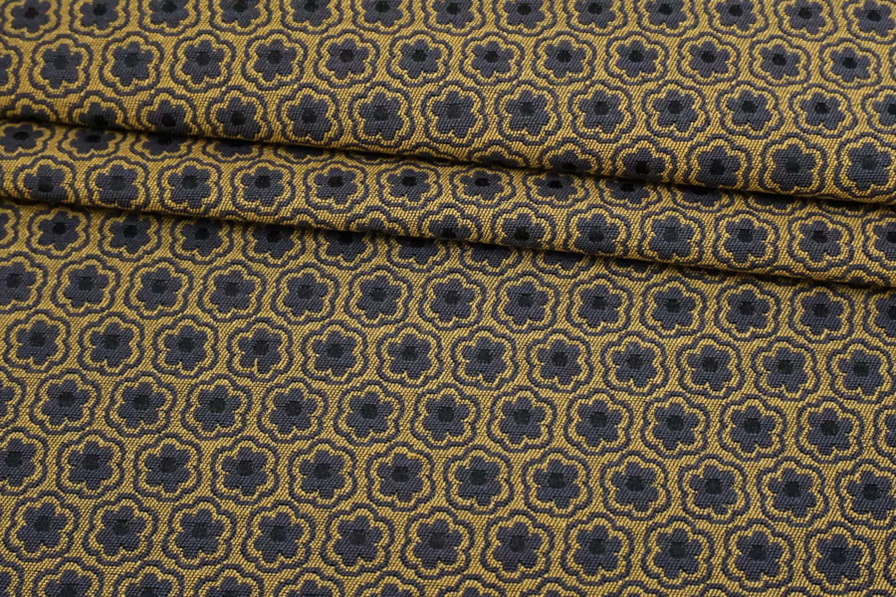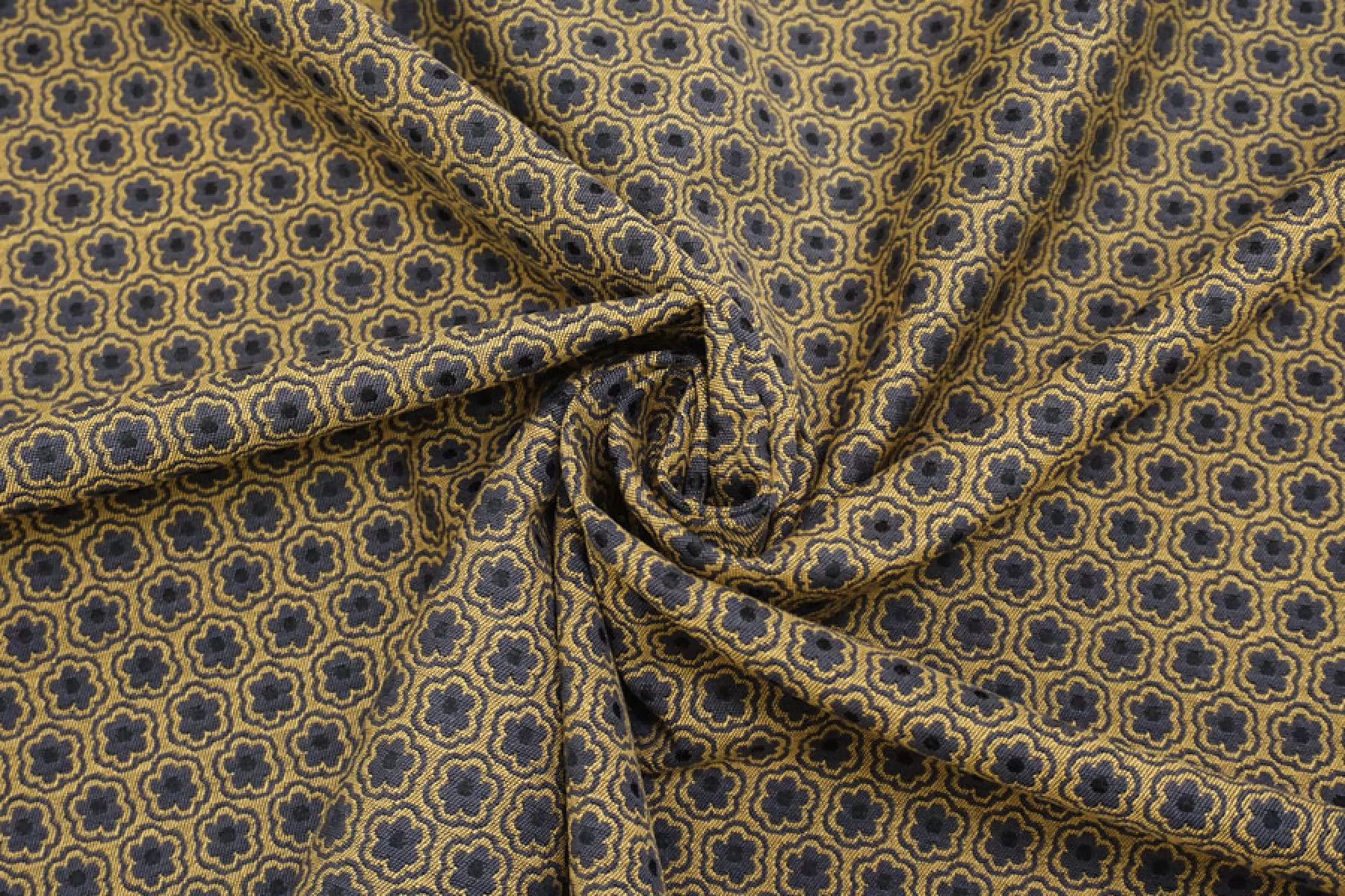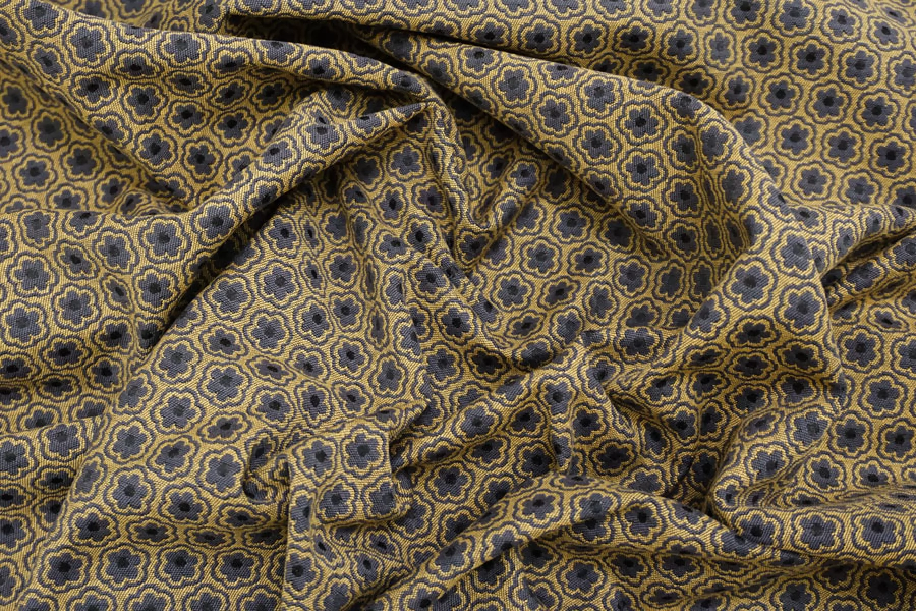 Костюмно-плательный хлопковый жаккард со стилизованным цветочным узором, из нитей бежевого, тёмного серо-синего и чёрного цвета. Пластичный но при этом держит форму, хорошо тянется. Не просвечивает, сминается, но восстанавливается. Подойдет на платья, жакеты мягкой формы, юбки, брюки.